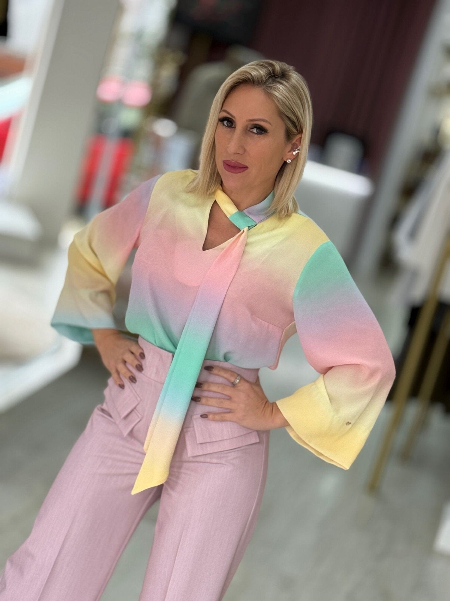 Túnica gola fita ajustável estampado tons pastel
