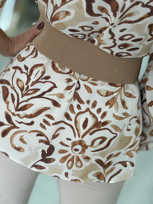 Túnica estampada folhos e laçada