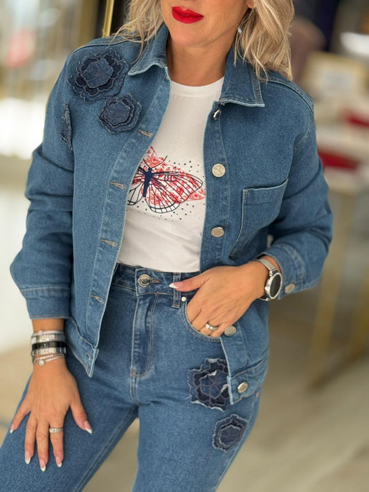 Blusão de ganga com bordado floral