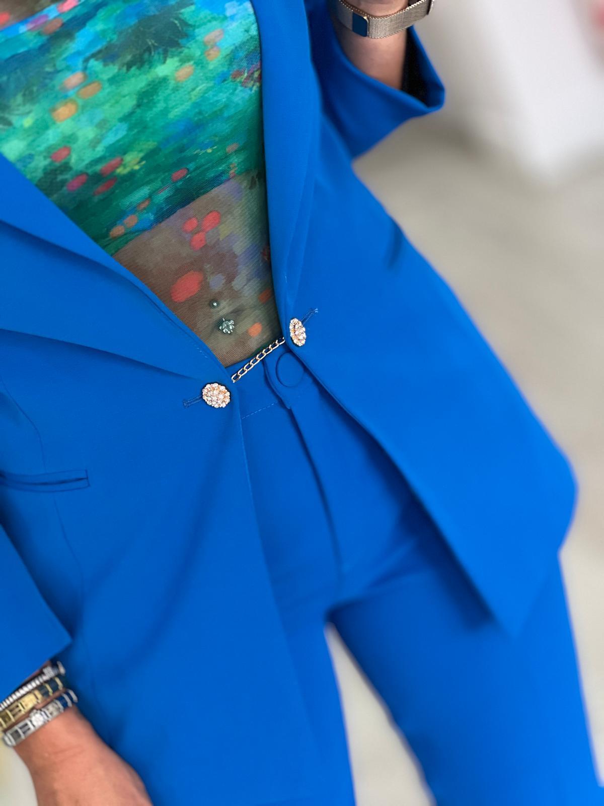 Blazer com gola e lapela. Fechamento na frente com botões beijados enriquecidos com joias de strass. Bolsos falsos frisados na frente. Forró interior liso.