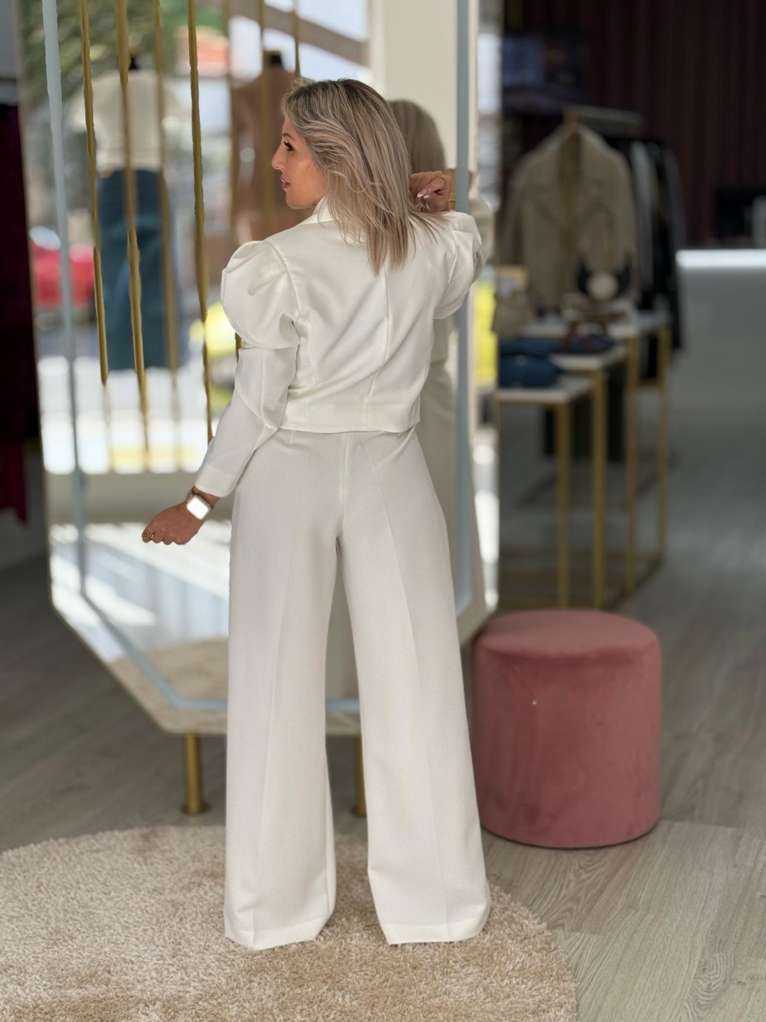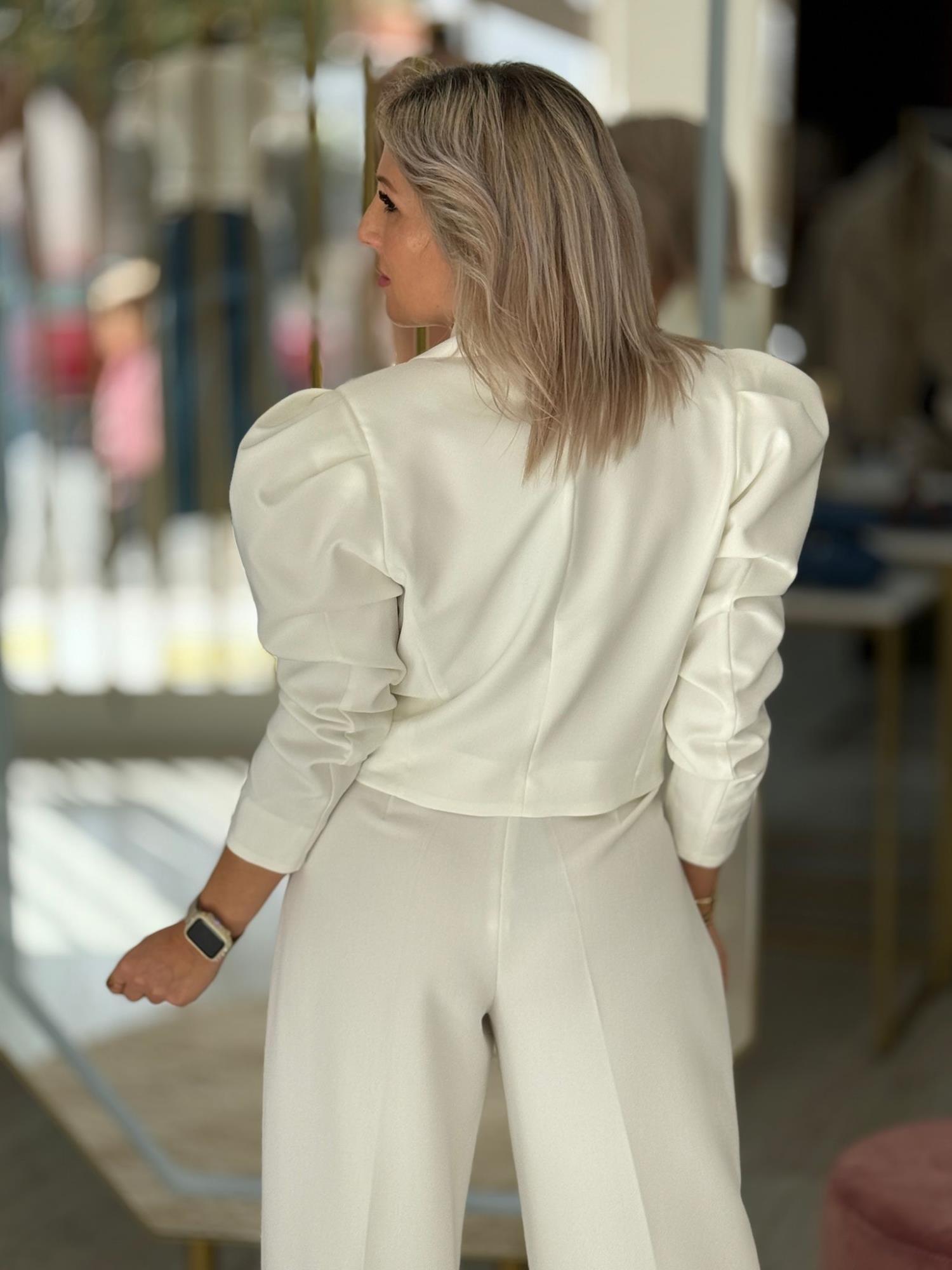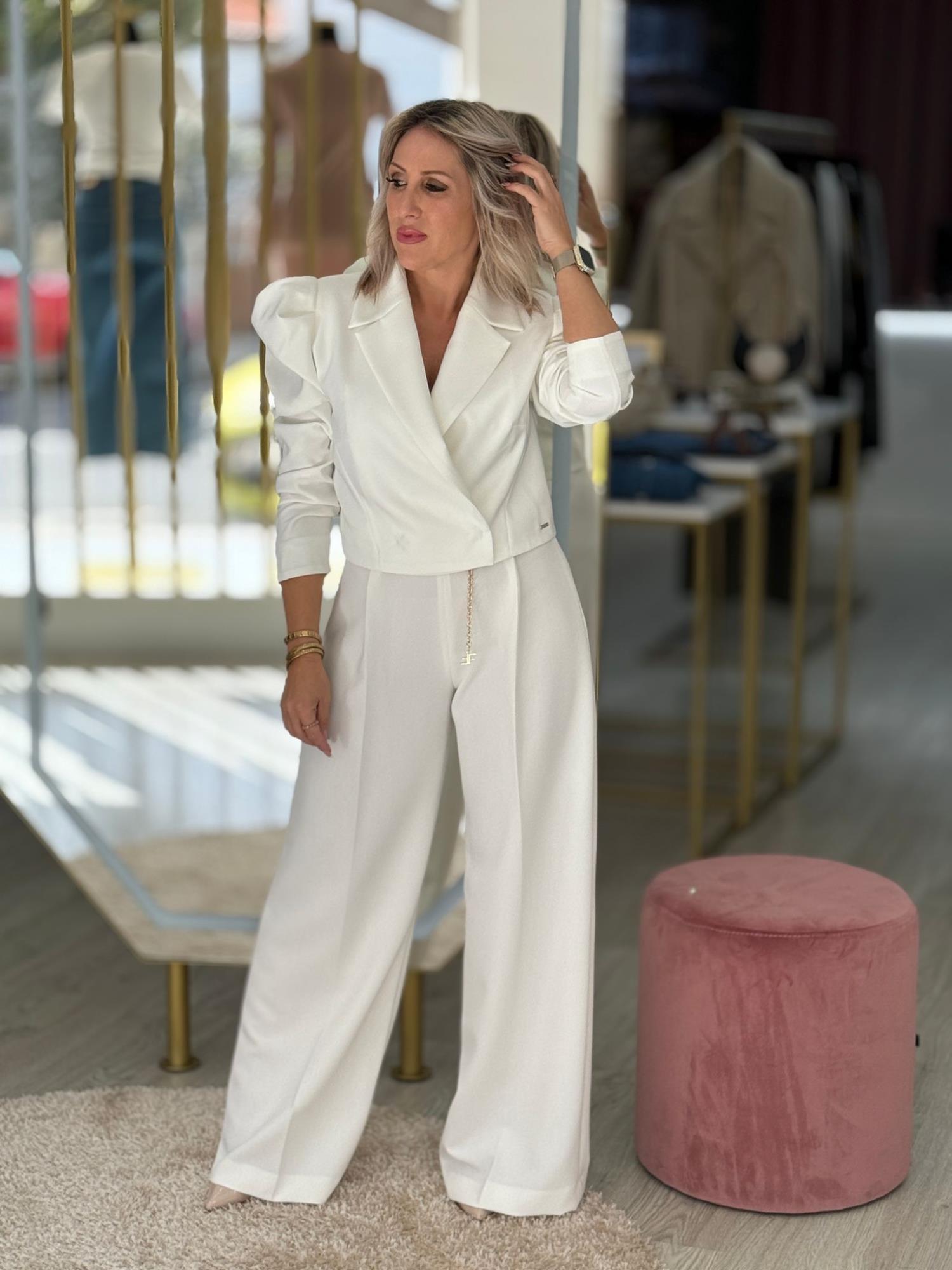 Blazer clássico curto com manga comprida. Manga balão. Fecho em trespasse frontal. Com botões de presilha interiores.