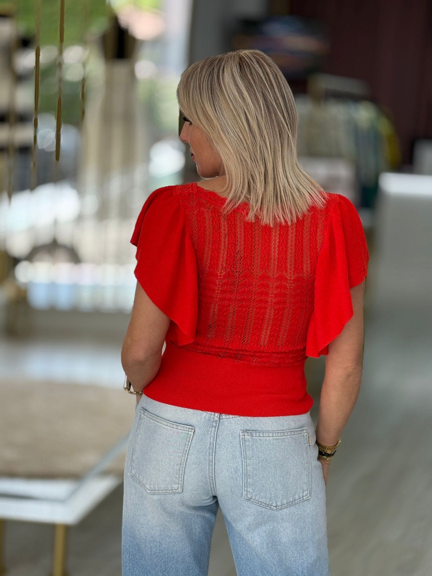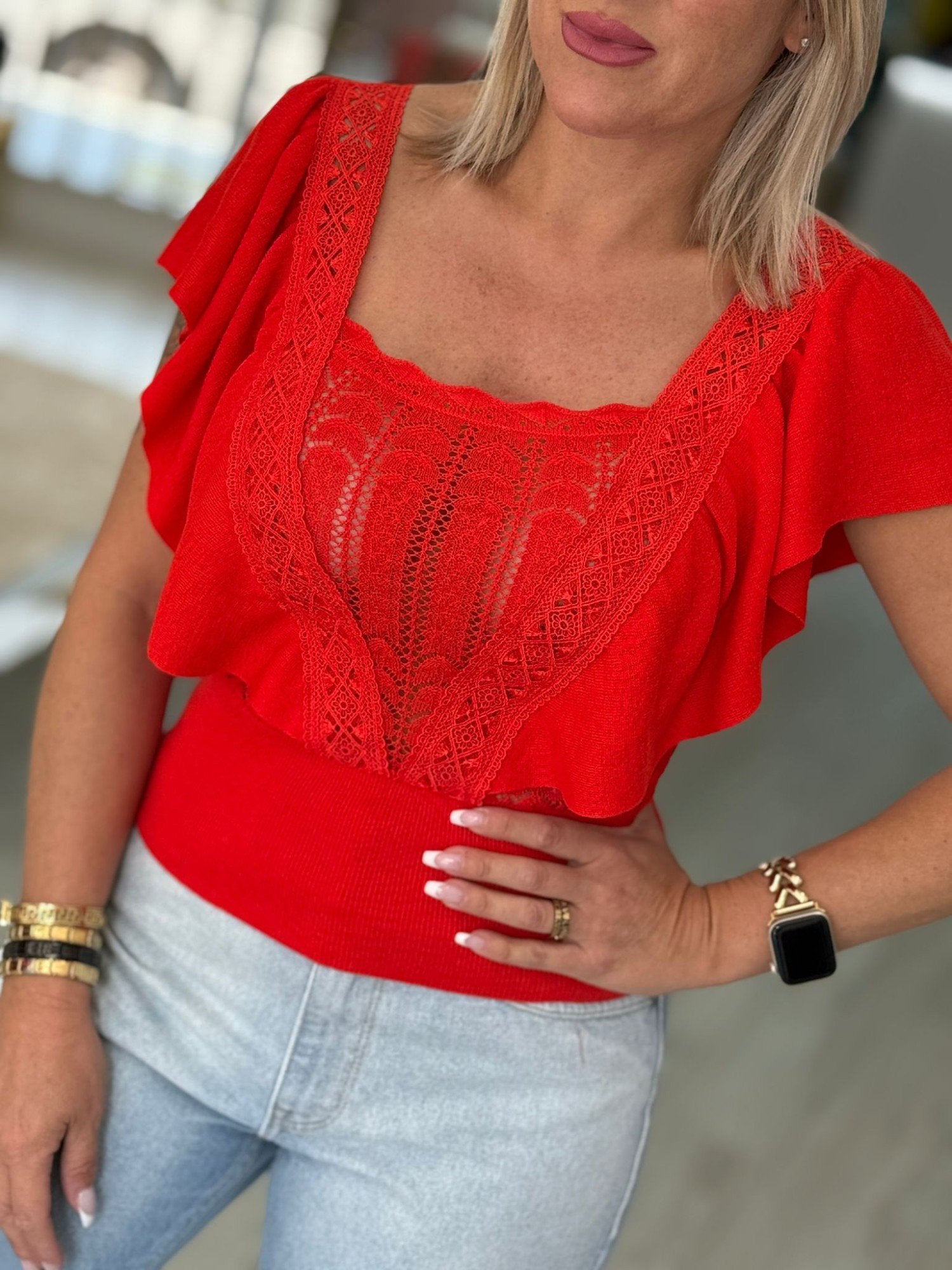Blusa de malha e renda. Decote redondo. Sem mangas com folhos.