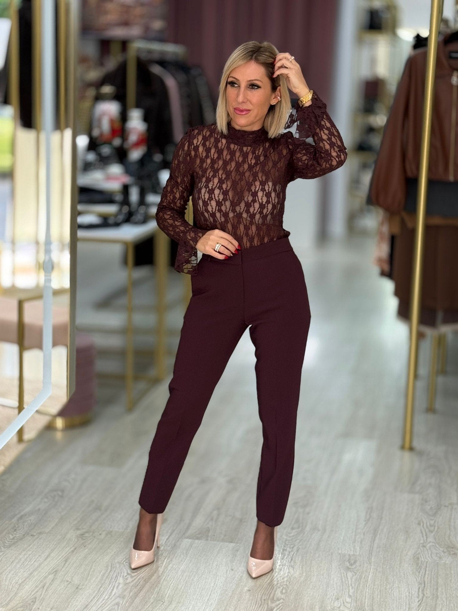 Blusa em renda delicada com manga comprida e ligeiro franzido nos punhos, formando um subtil efeito de folho. Confeccionada em renda com motivo floral, apresenta gola subida e corte ajustado que realça a silhueta. Uma peça feminina e sofisticada, perfeita para usar sob blazers, coletes ou sozinha em coordenados elegantes.