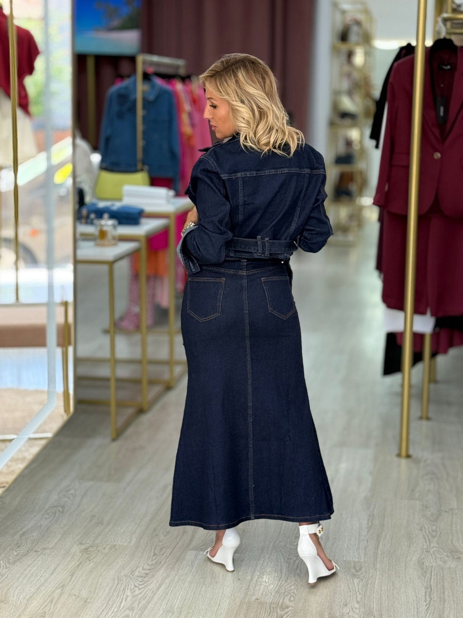 Casaco de ganga modelo cropped, com cinto e fivela. Fechamento na frente com botões.