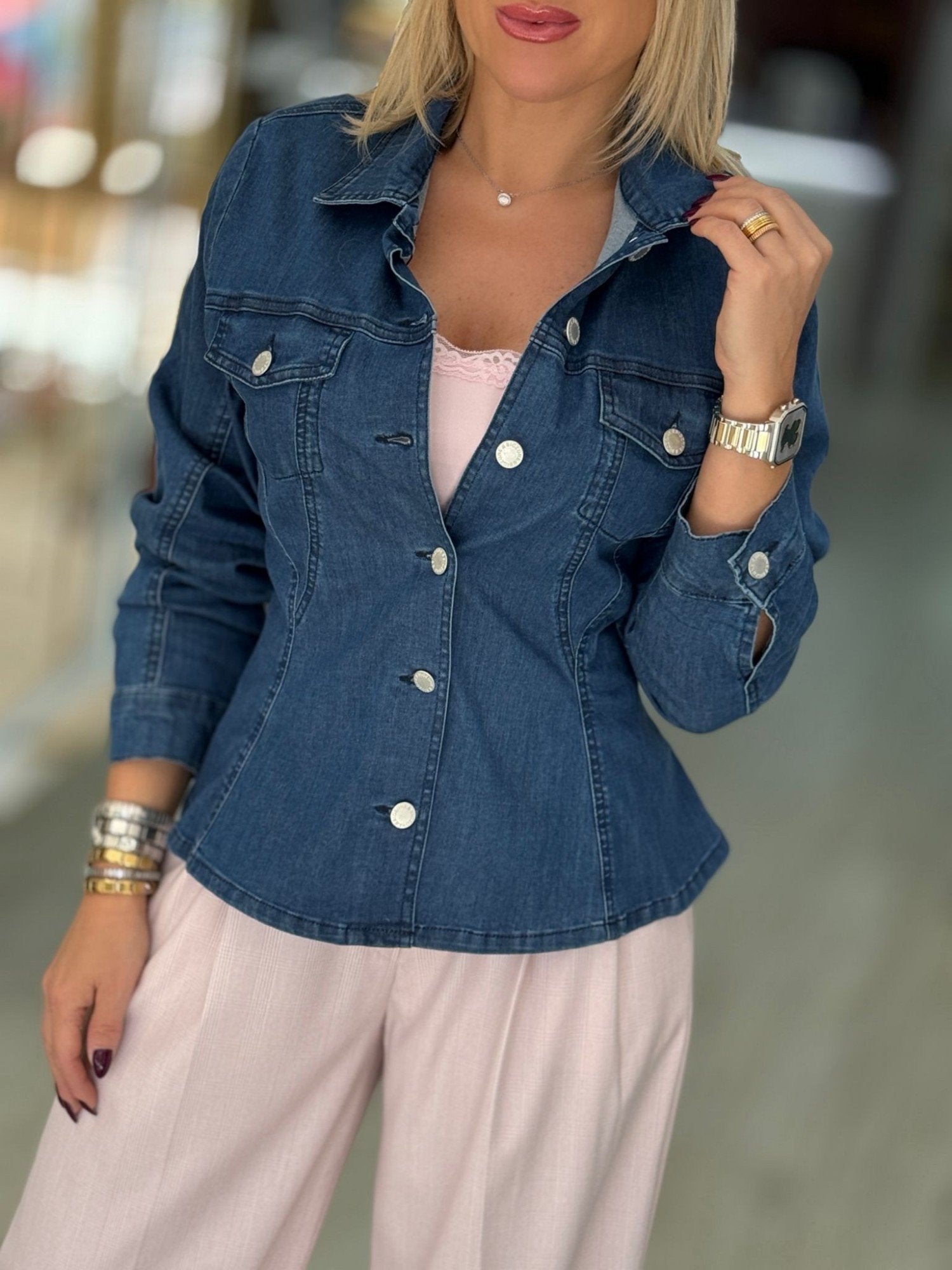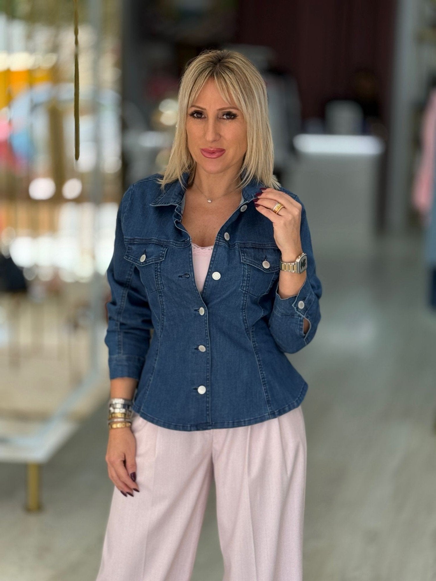 Blusão de ganga cintado, com colarinho. Bolsos de chapa na frente com palas e botões. Fecha na frente com botões.