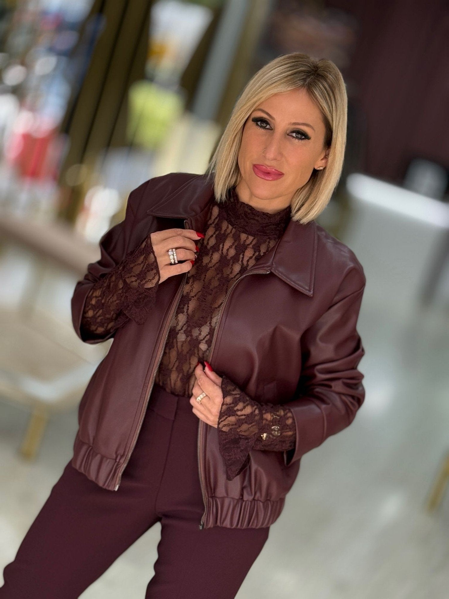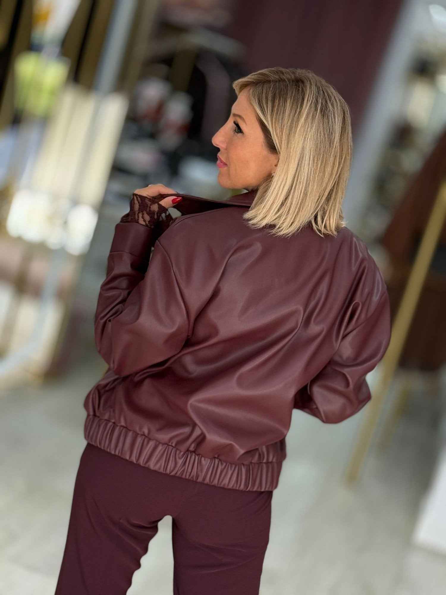 Blusão curto em pele sintética de toque suave, com fecho frontal de correr e gola clássica. O modelo apresenta elástico discreto na bainha, criando uma silhueta ligeiramente ajustada. Uma peça moderna e versátil, ideal para adicionar um toque contemporâneo e elegante aos looks do dia a dia.