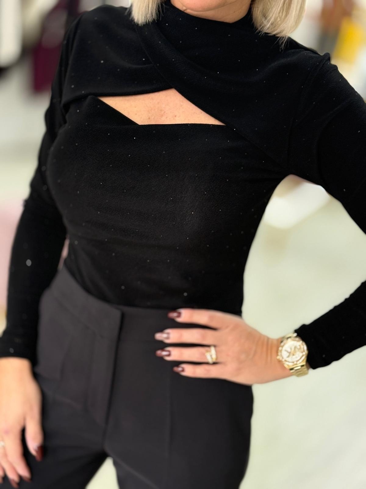 Body em malha fina com microbrilhos aplicados diretamente no fio, criando um reflexo subtil que acompanha o movimento. O recorte geométrico é formado por uma faixa cruzada que estrutura o decote e destaca a linha dos ombros. A malha elástica oferece ajuste firme mas confortável, mantendo o desenho limpo da peça. Base com fecho de pressão para maior funcionalidade.