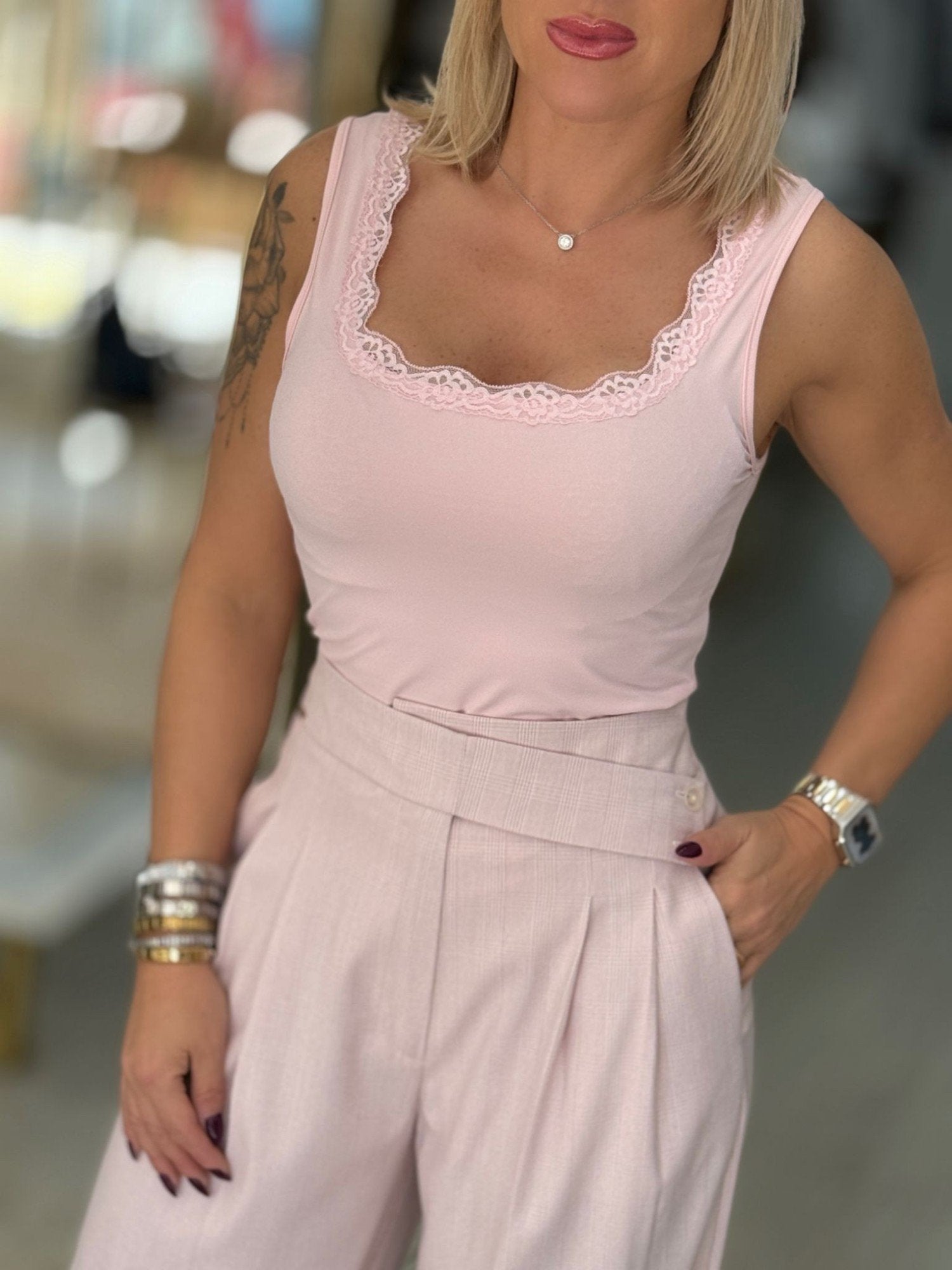Body num tecido tipo lycra. Decote redondo com renda. Alças largas.