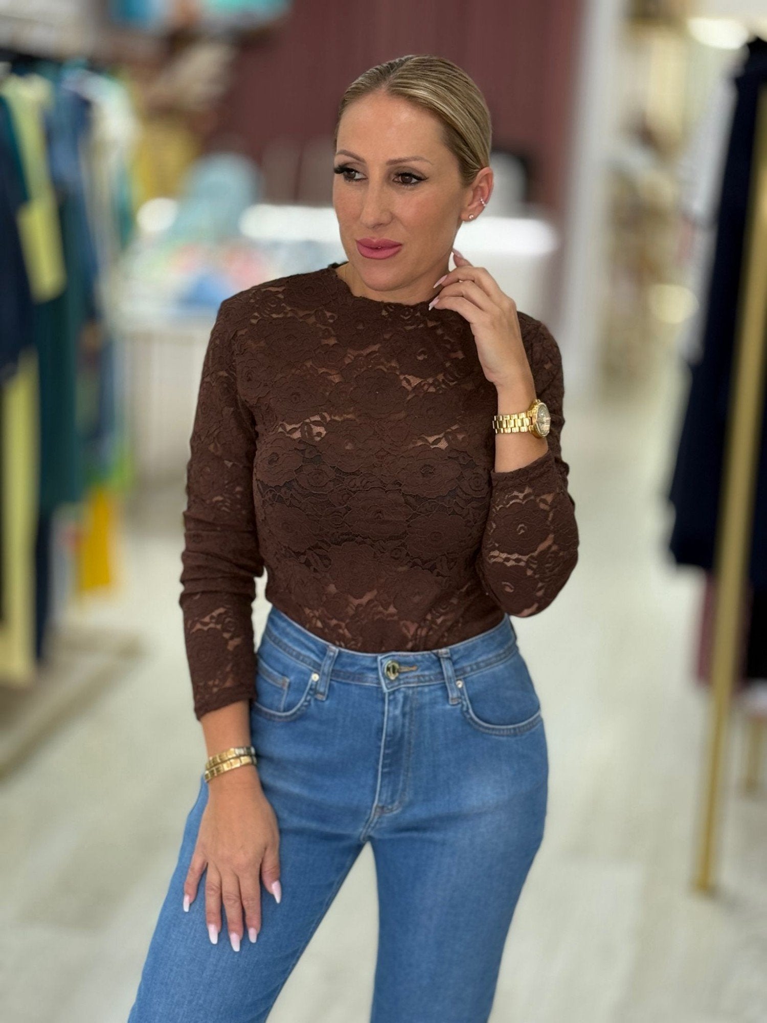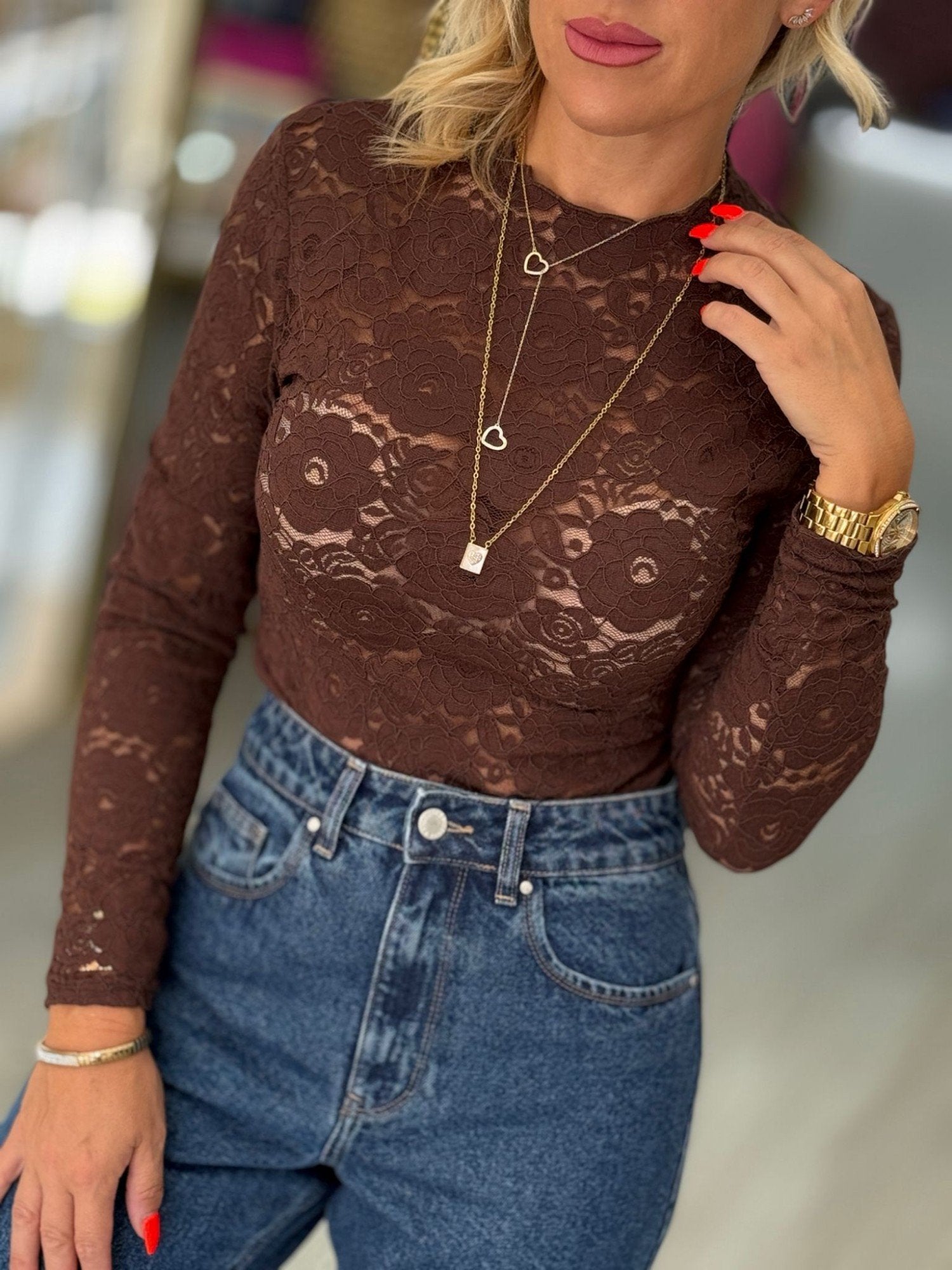 Body justo em renda transparente, que valoriza a silhueta com feminilidade e sofisticação. As mangas compridas equilibram o visual, conferindo um toque elegante ao design. O fecho com botões de pressão na parte inferior garante conforto e praticidade. Uma peça versátil e delicada, perfeita para coordenados ousados ou para usar por baixo de peças estruturadas.