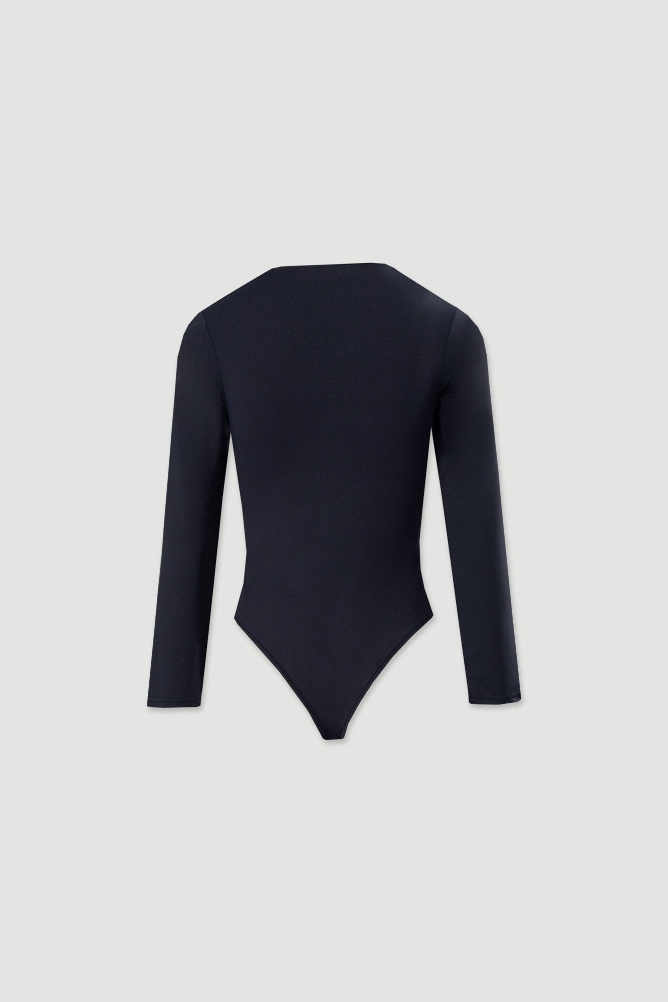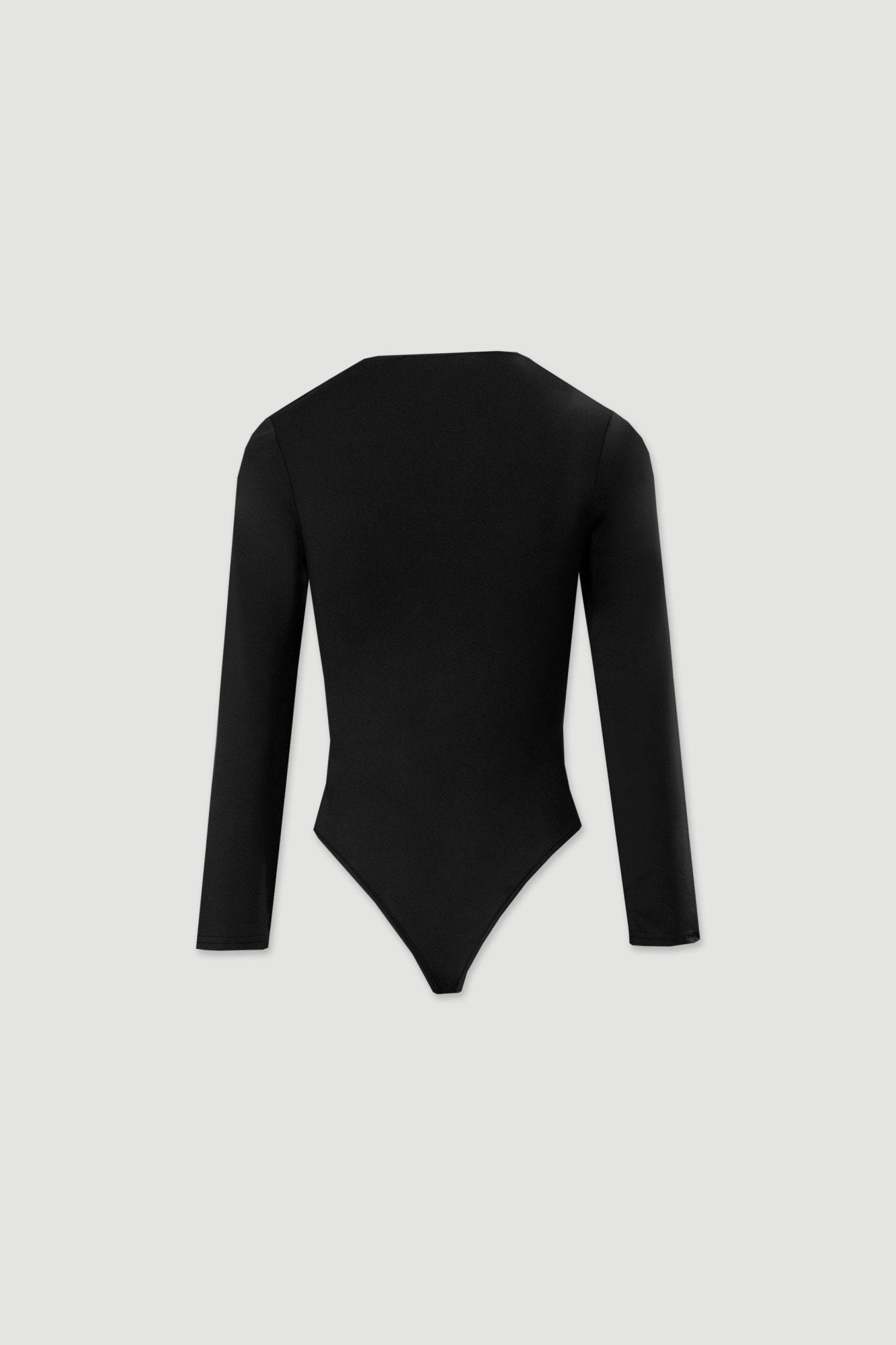 Body de manga comprida com design minimalista e sofisticado. Apresenta decote quadrado profundo com recorte geométrico, que acrescenta um toque moderno e ousado. O tecido elástico proporciona conforto e ajuste perfeito ao corpo, enquanto o fecho na parte inferior com gancho metálico garante praticidade.