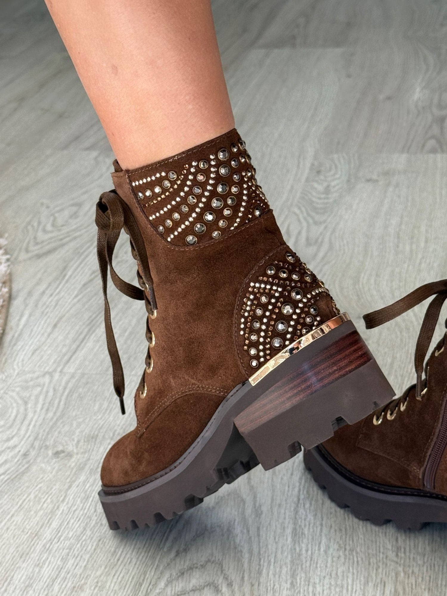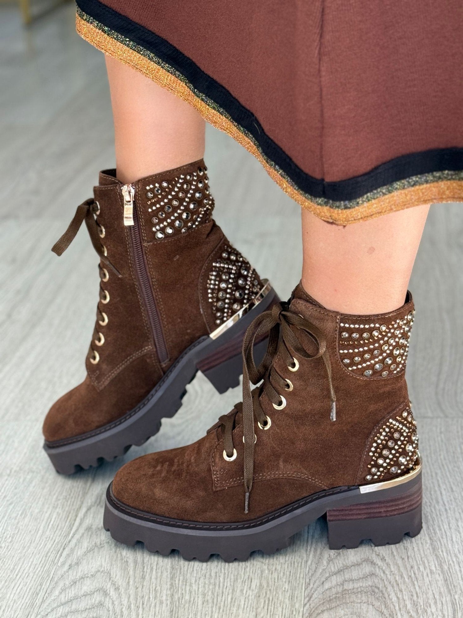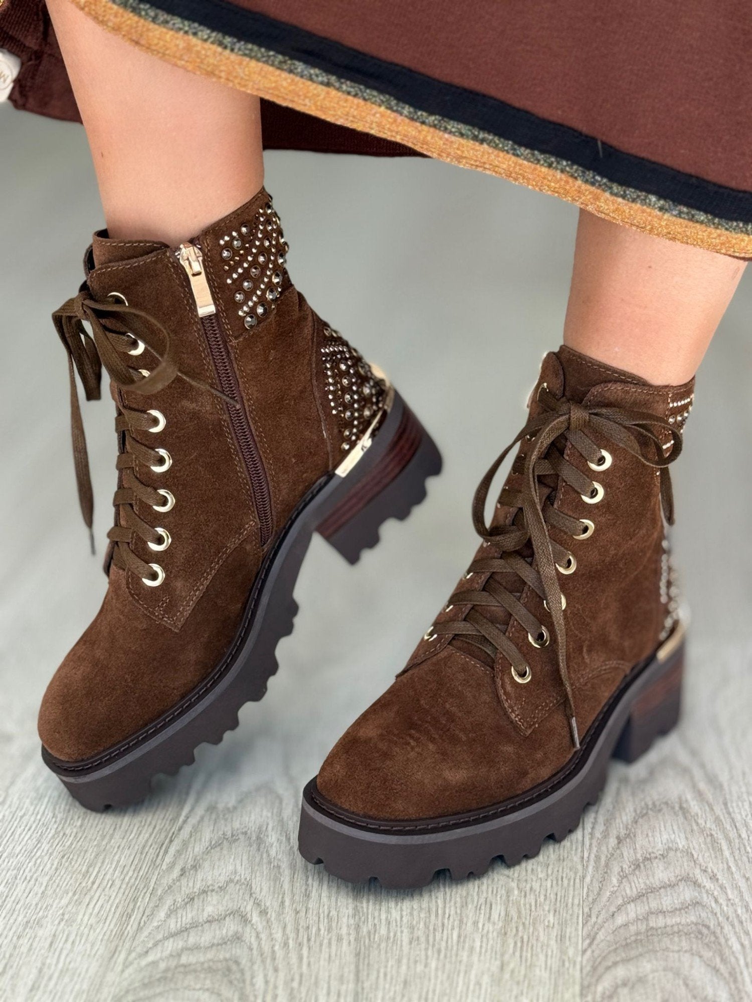 Descrição Botim de salto para mulher com tachas. Com biqueira arredondada e fecho de correr.