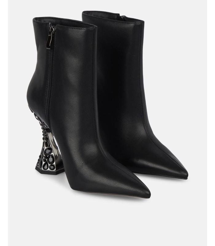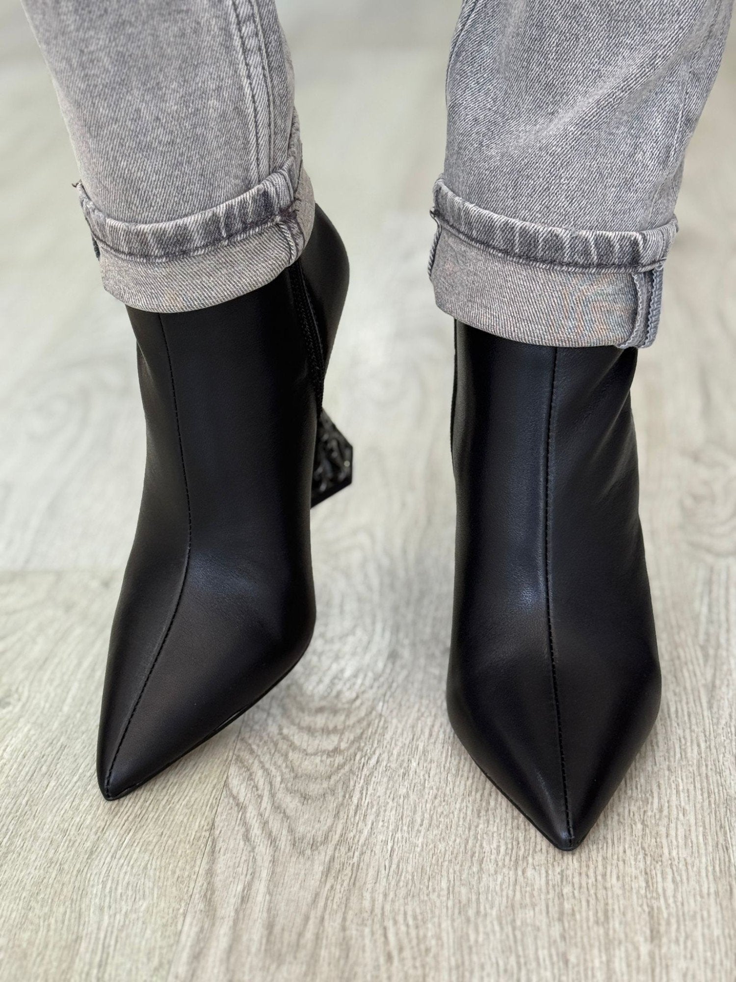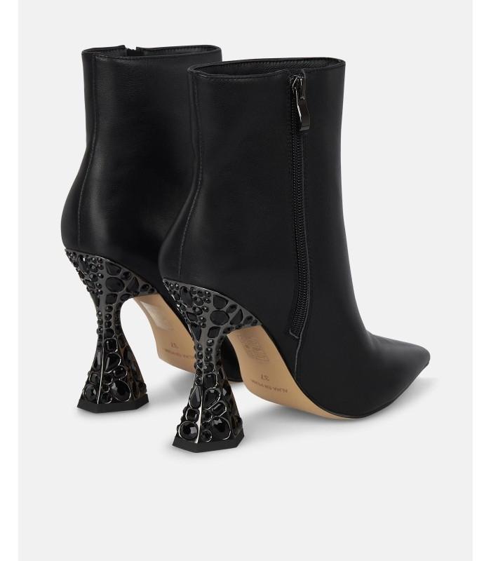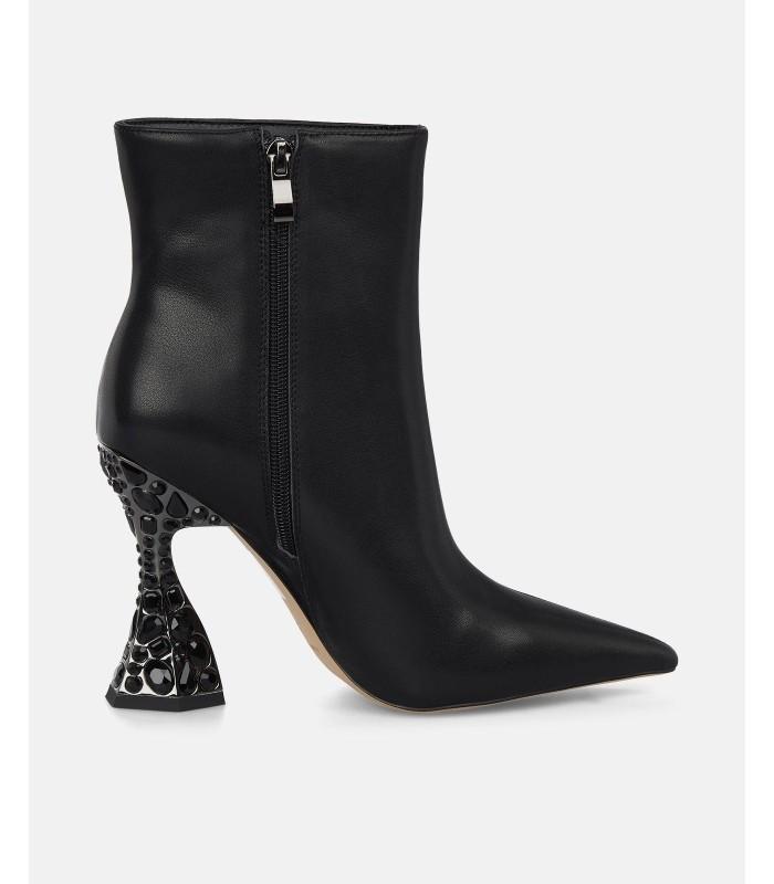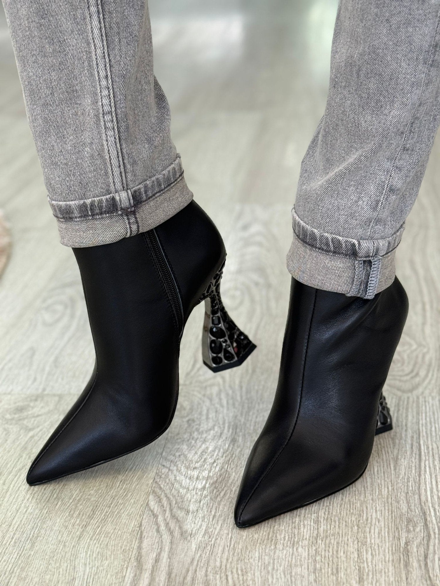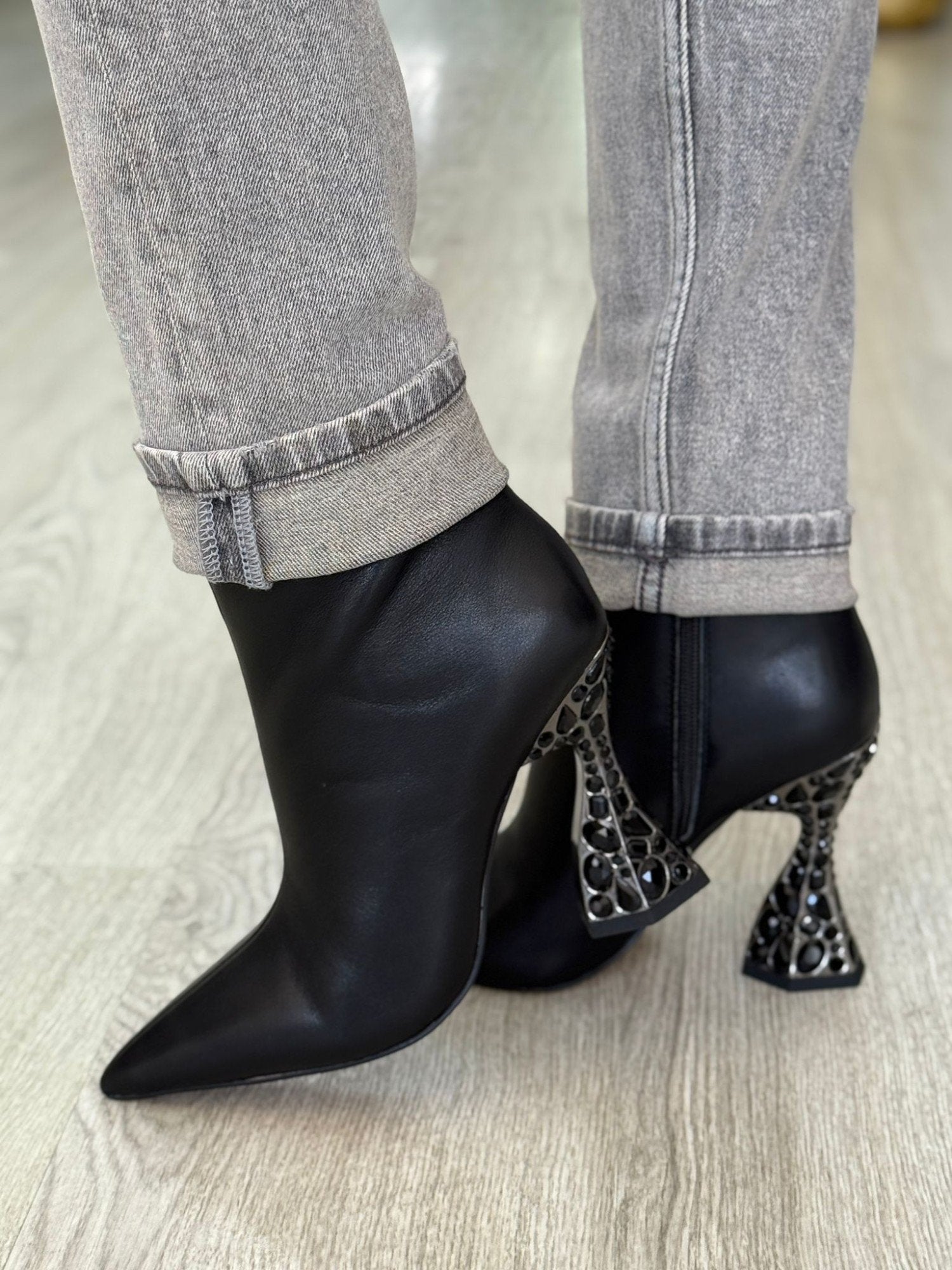 Botim de salto com joia em forma de funil. Com biqueira pontiaguda e salto largo, sem fecho. A altura do salto é de 11 cm e a cana mede 14 cm.