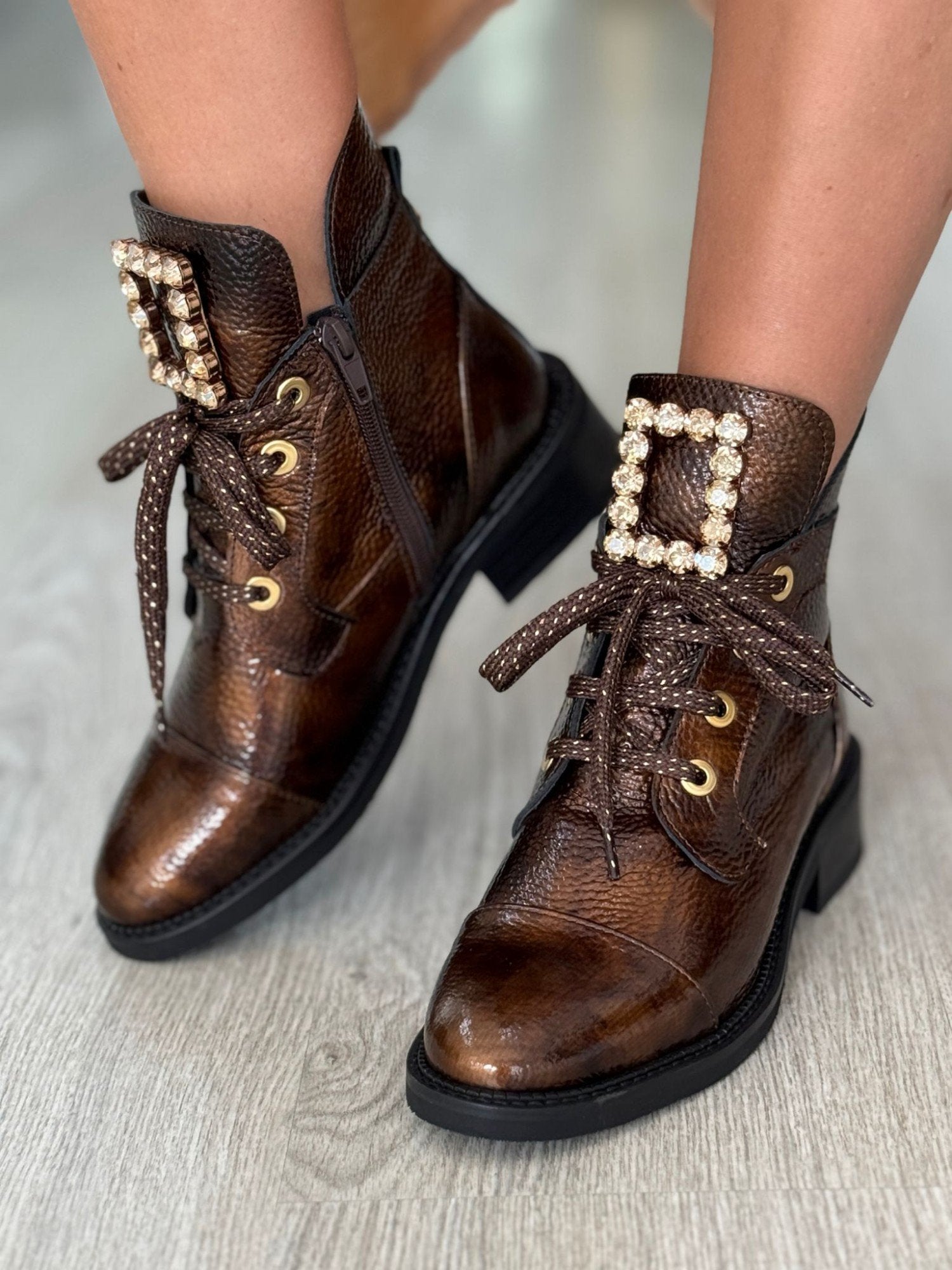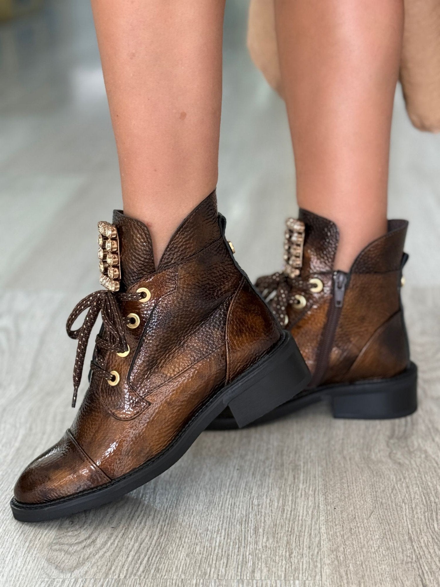 Os botins Rafaela80 complementam os seus looks casuais com elegância. Fabricados em verniz couro, com palmilha conforto e adornados com aplicação. Calçado português.