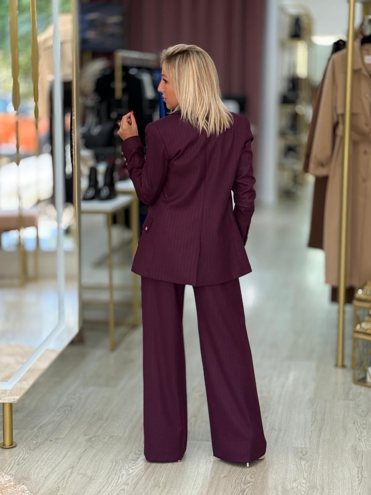 Calça clássica wide leg de cintura subida com presilhas. A calça tem uma risca muito fina com brilho. Bolsos laterais e bolsos "falsos" atrás. Fecha na frente com botão dourado e fecho de correr oculto pelo tecido.