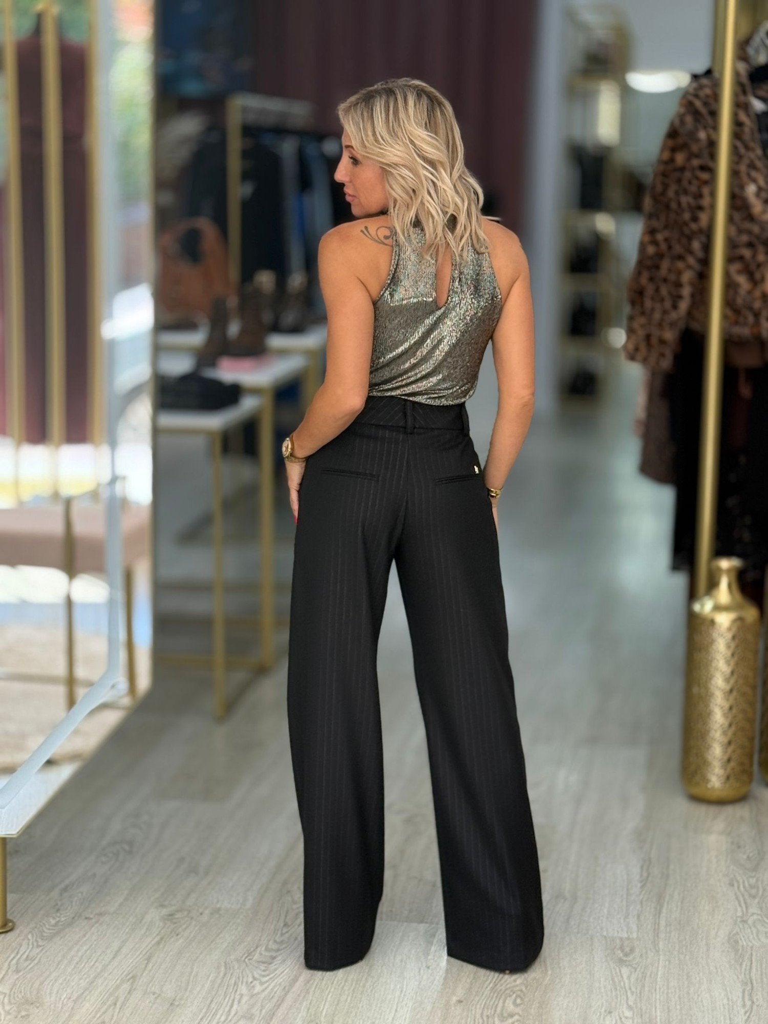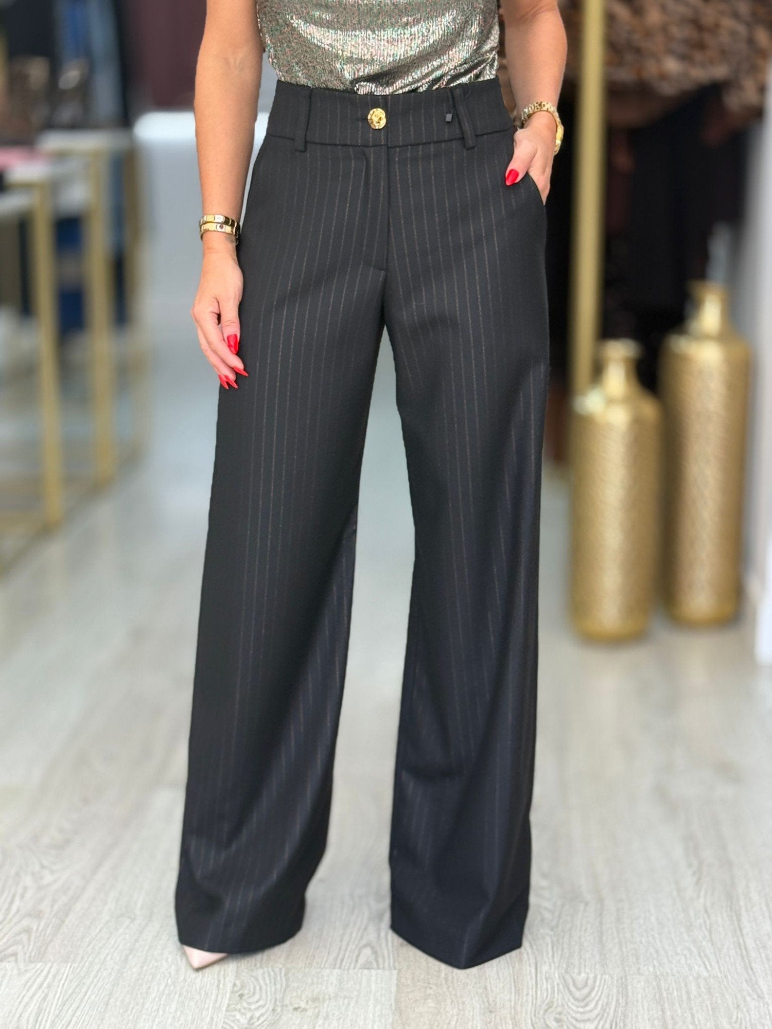 Calça clássica wide leg de cintura subida com presilhas. A calça tem uma risca muito fina com brilho. Bolsos laterais e bolsos "falsos" atrás. Fecha na frente com botão dourado e fecho de correr oculto pelo tecido.
