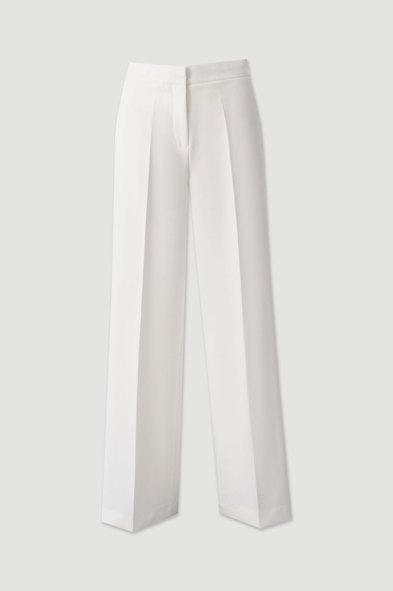 Calça clássica wide leg de cintura subida. Cinto elástico forrado na parte posterior para maior conforto e ajuste perfeito. Bolsos laterais e fecho de correr frontal, gancho metálico e botão interior.