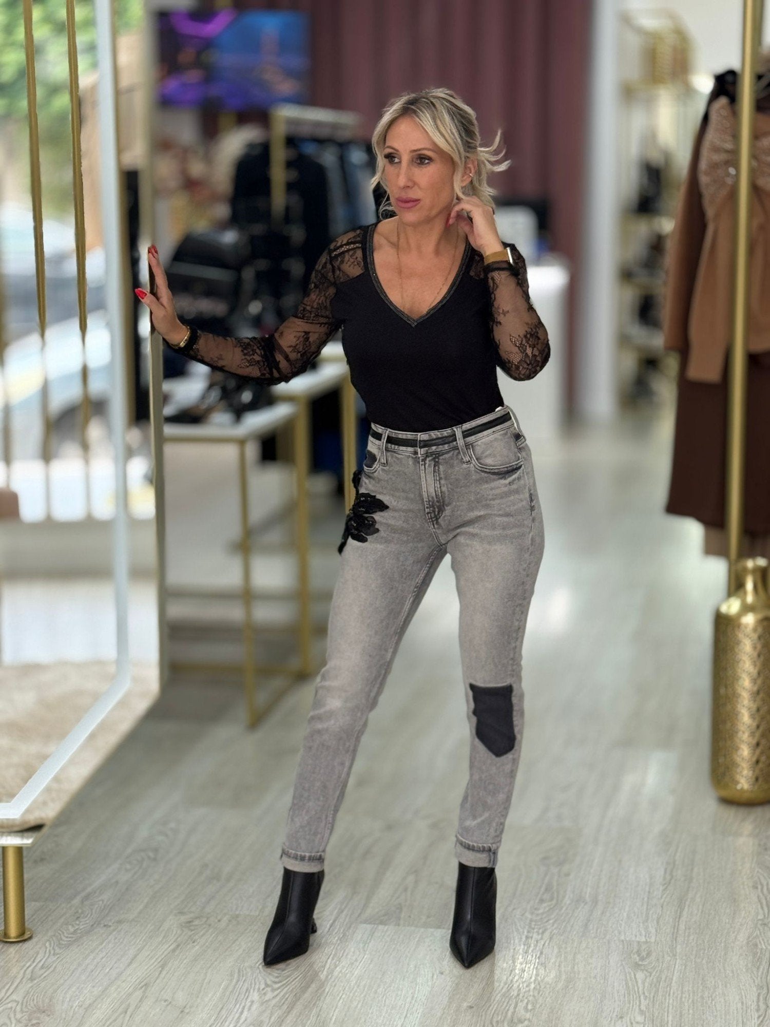 Calças de ganga de cintura subida com presilhas e faixa de napa. Modelo skinny. Aplicação de flor com missangas, lantejoulas e brilhantes na lateral. Dois bolsos à frente e bolsos de chapa atrás. Fecha na frente com colchete e fecho de correr.
