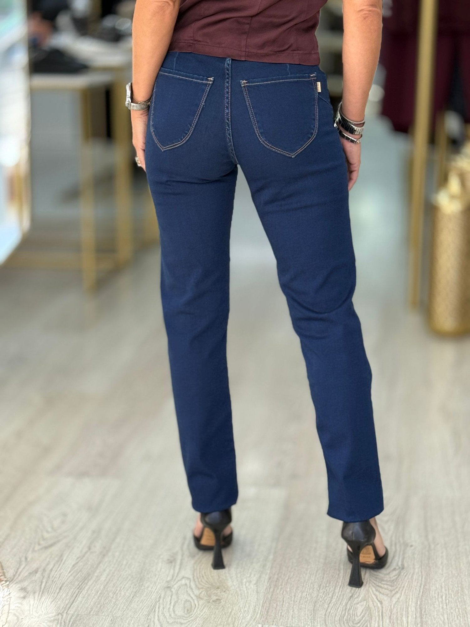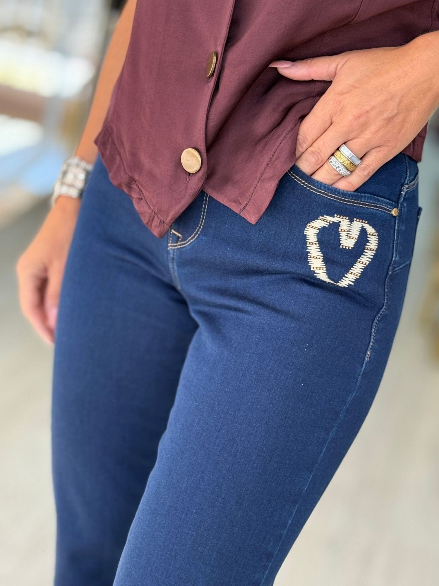 Calças de ganga de cintura subida com presilhas. Modelo Lady slim. Calças com coração dourado . Dois bolsos à frente e dois bolsos de chapa atrás. Fecha com botão e fecho de correr.