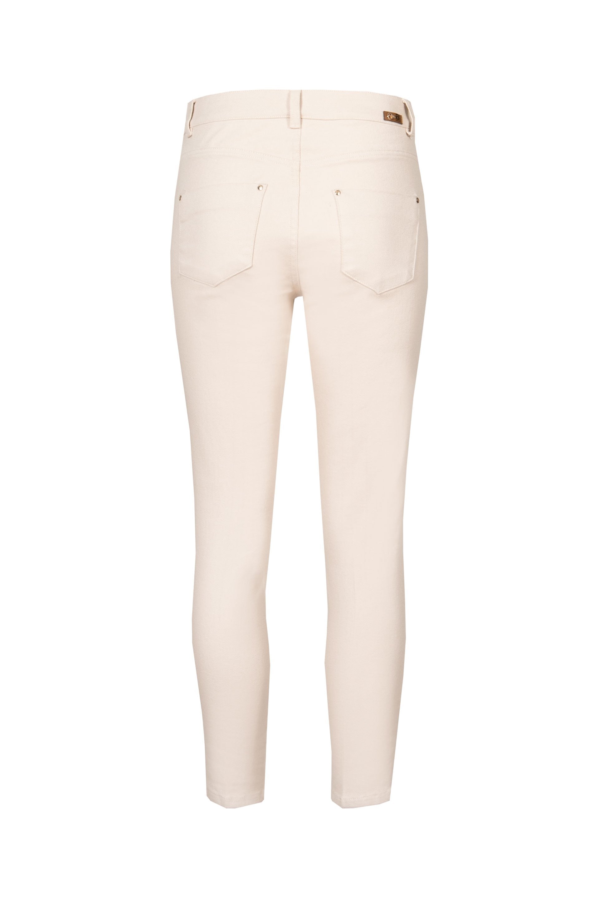 Calça de sarja de cintura média. Bolsos à frente e bolsos chapa atrás. Fecho de correr e botão metálico à frente.