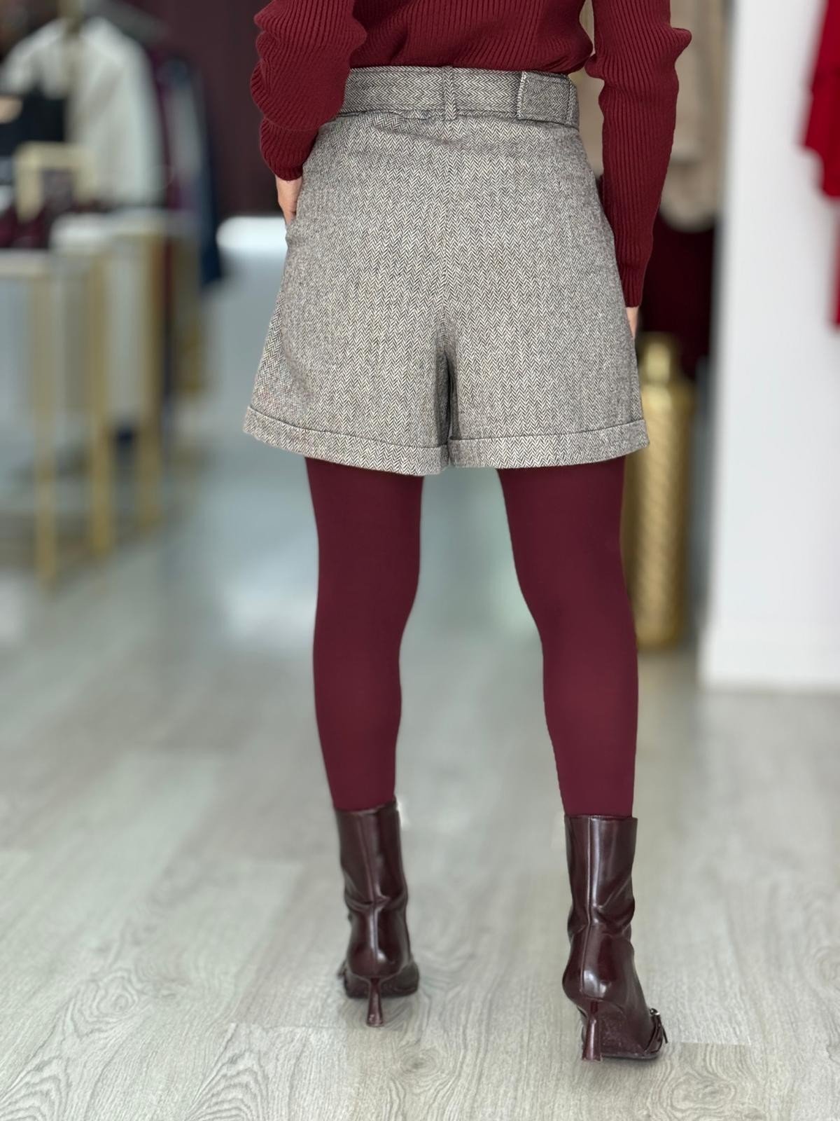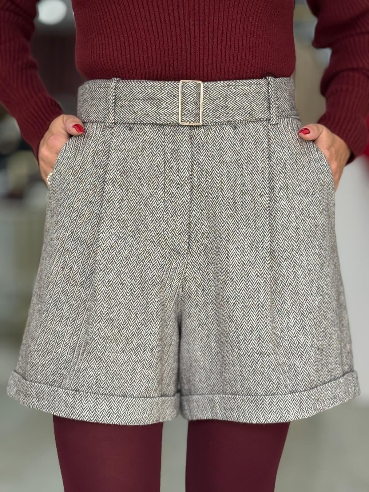 Calção curto em tecido estruturado com padrão espiga e mistura de lã. Modelo de cintura subida, com pinças frontais, presilhas e fecho oculto. Inclui cinto no mesmo tecido com fivela forrada, que realça a silhueta e acrescenta um toque refinado. O acabamento com dobra na bainha confere um detalhe moderno e elegante, ideal para coordenar com camisas, malhas ou blazers.