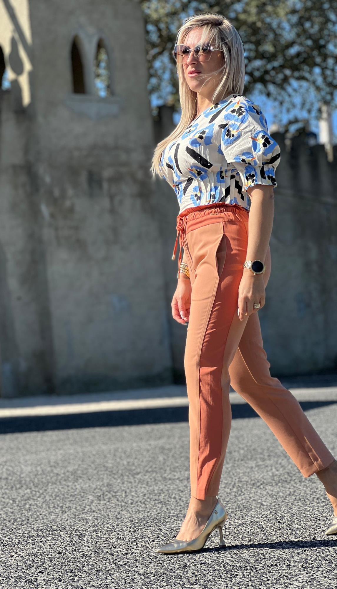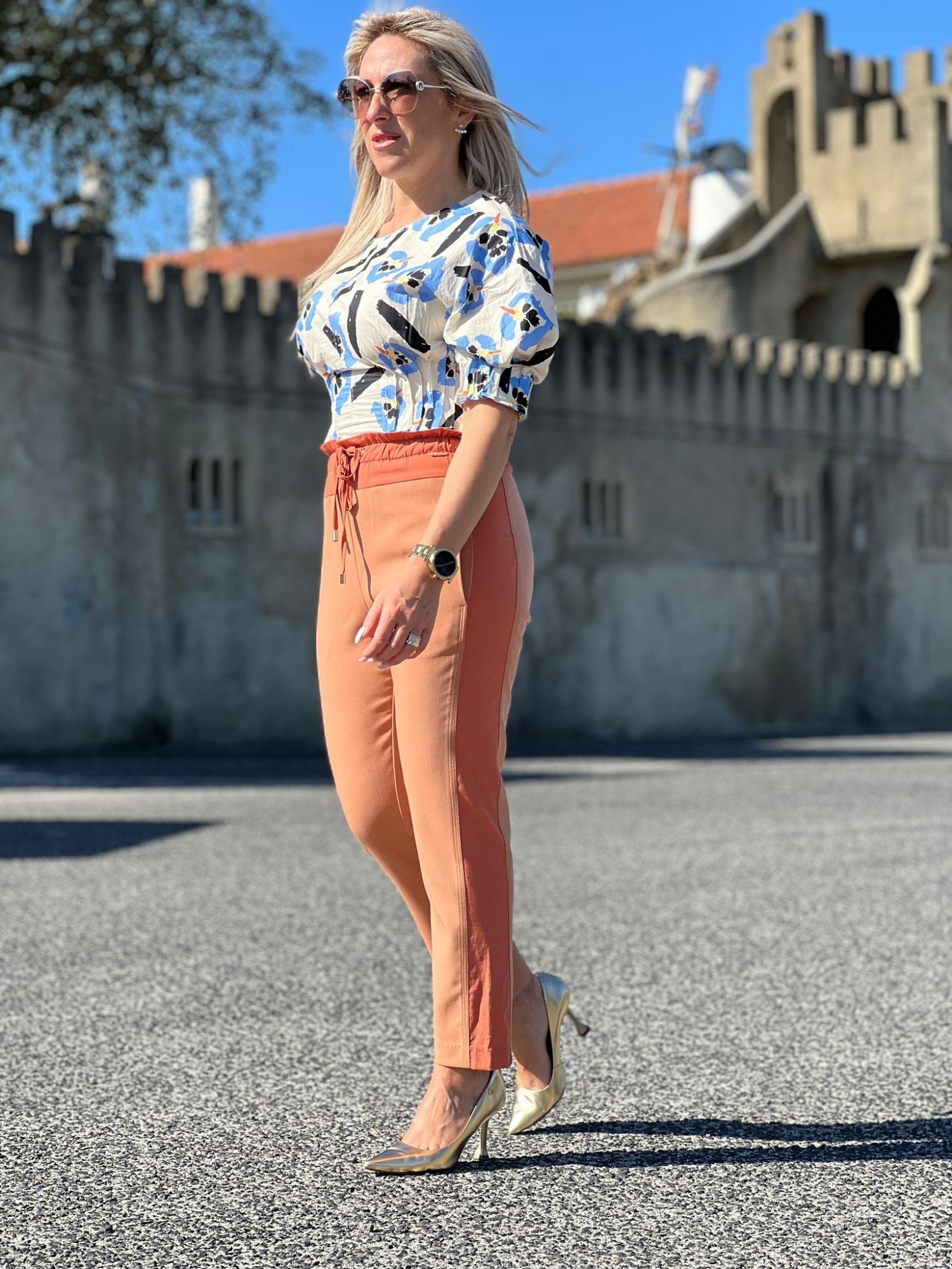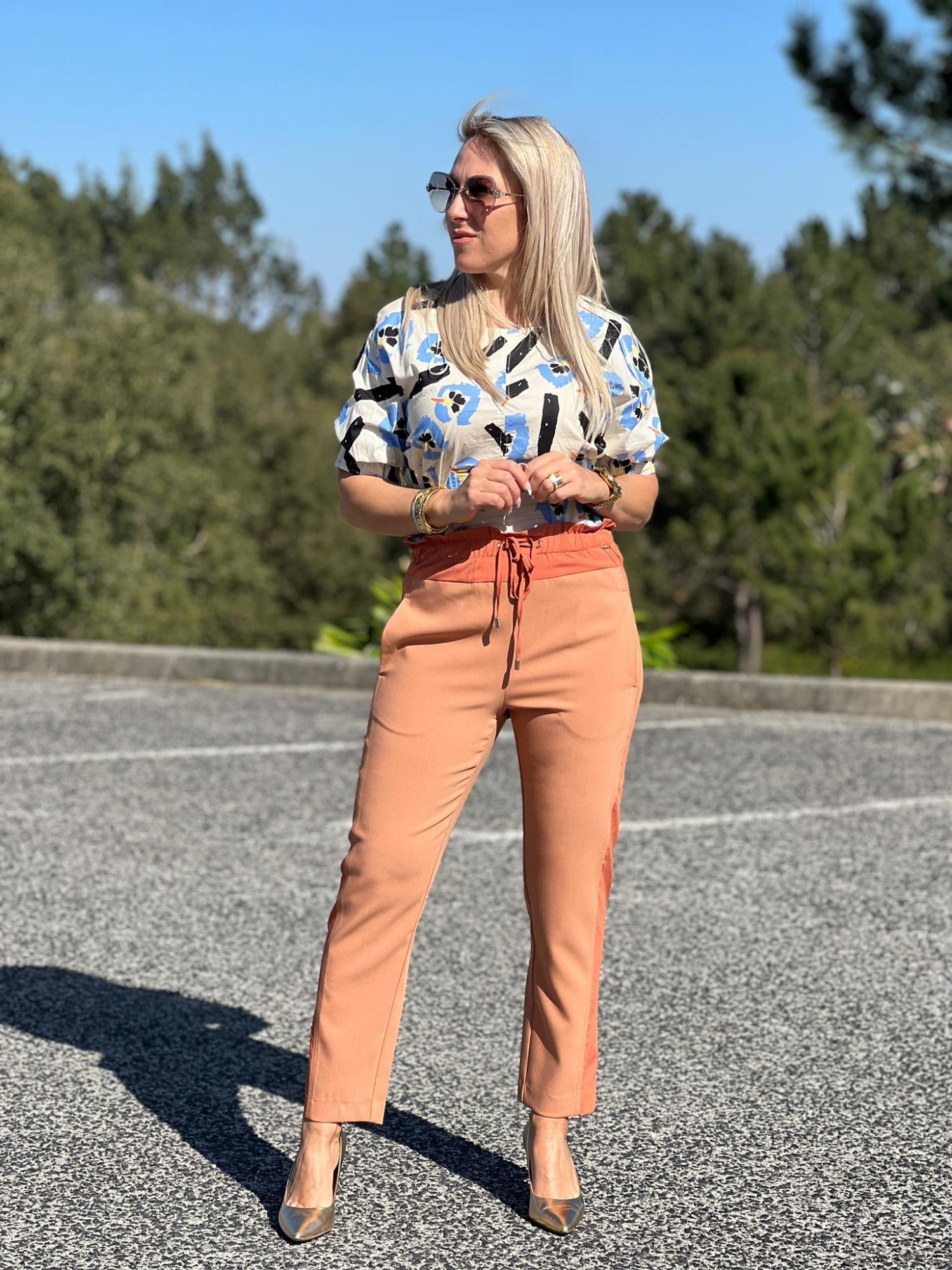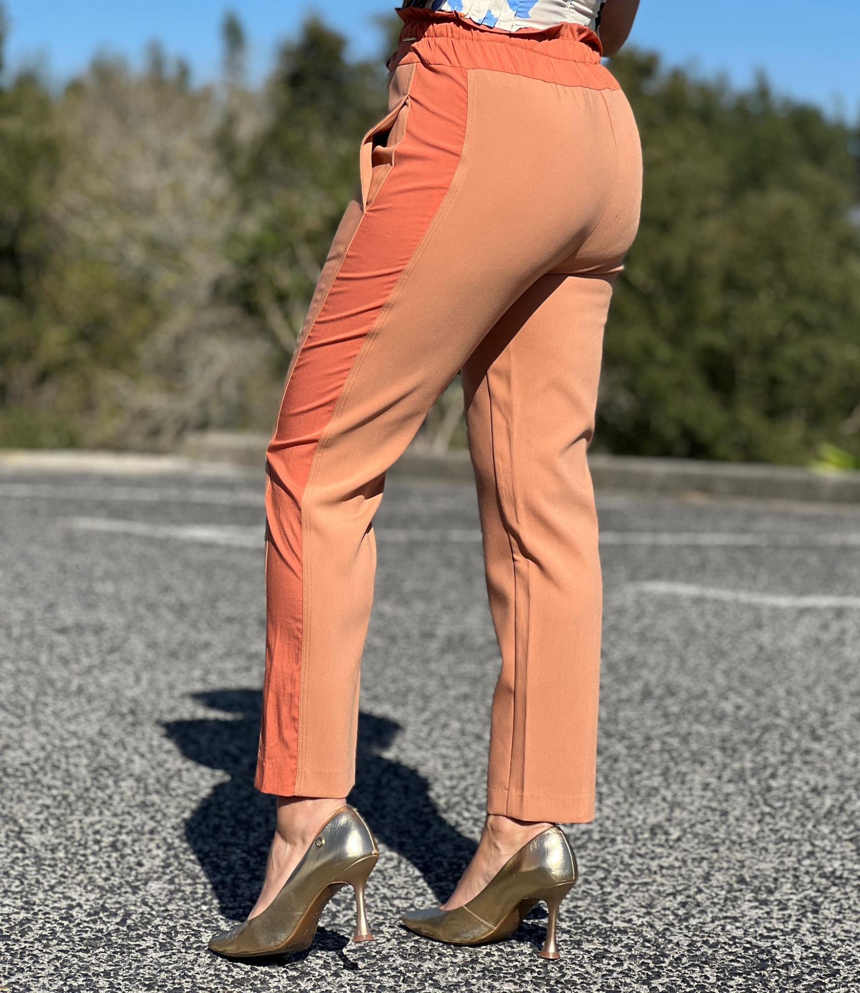 Calça bicolor de cintura elástica com cordão. Bolsos na frente. Comprimento do tornozelo da perna.