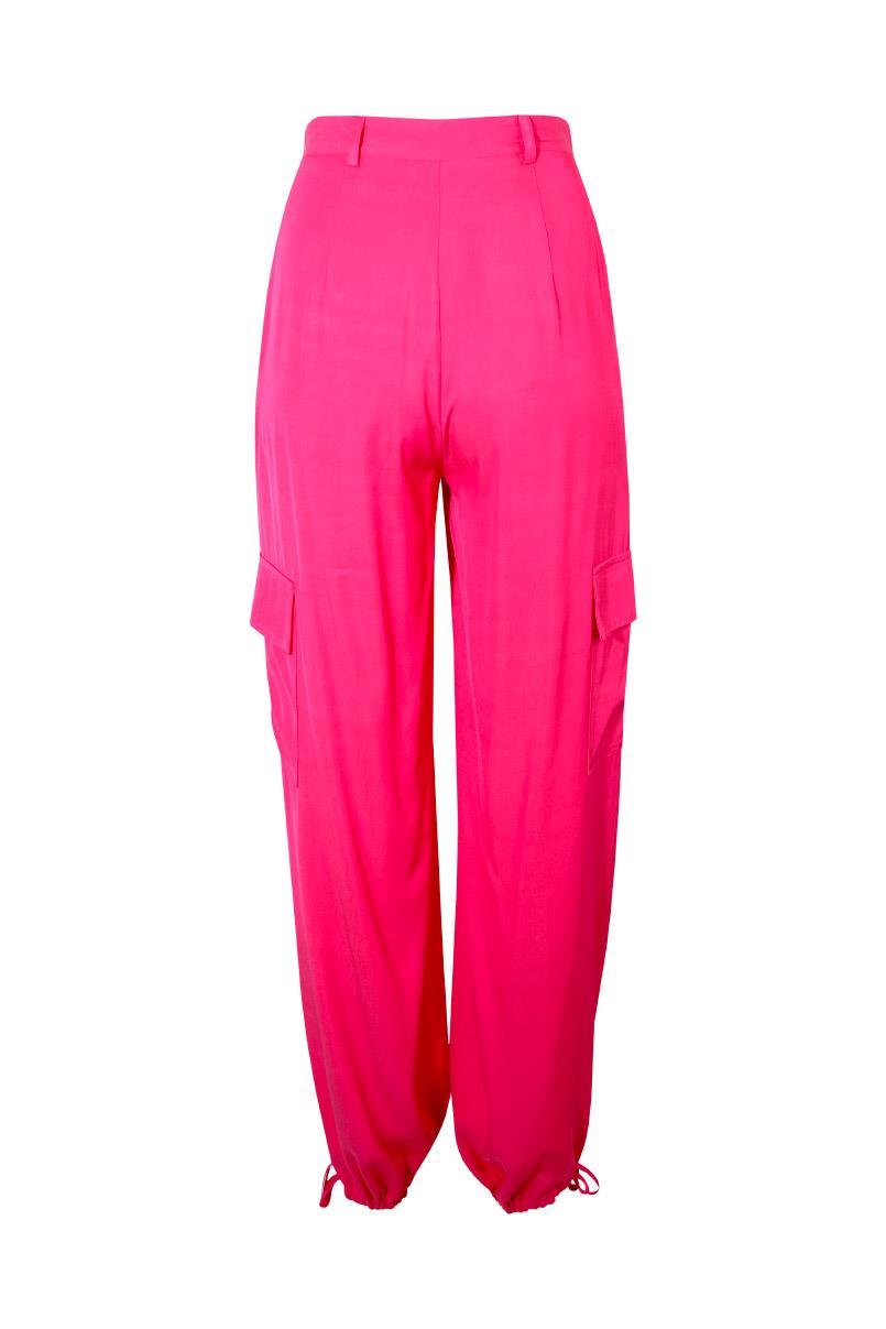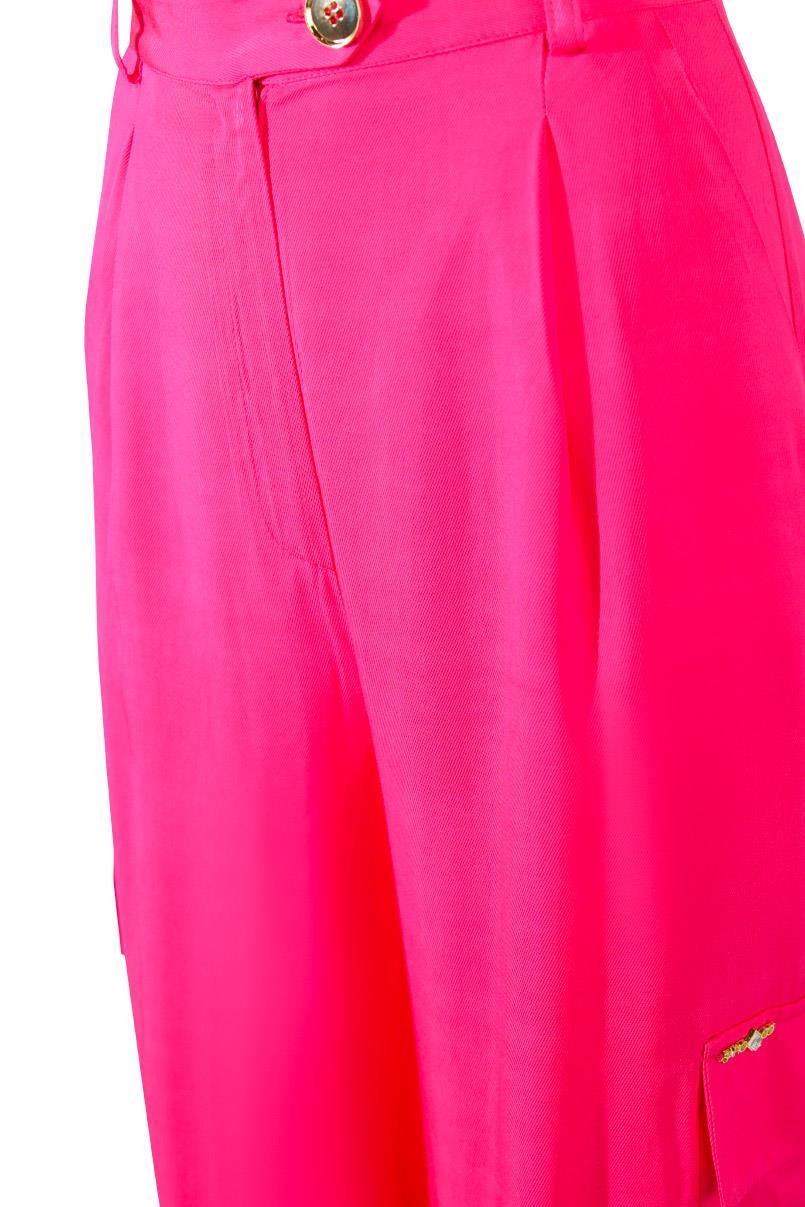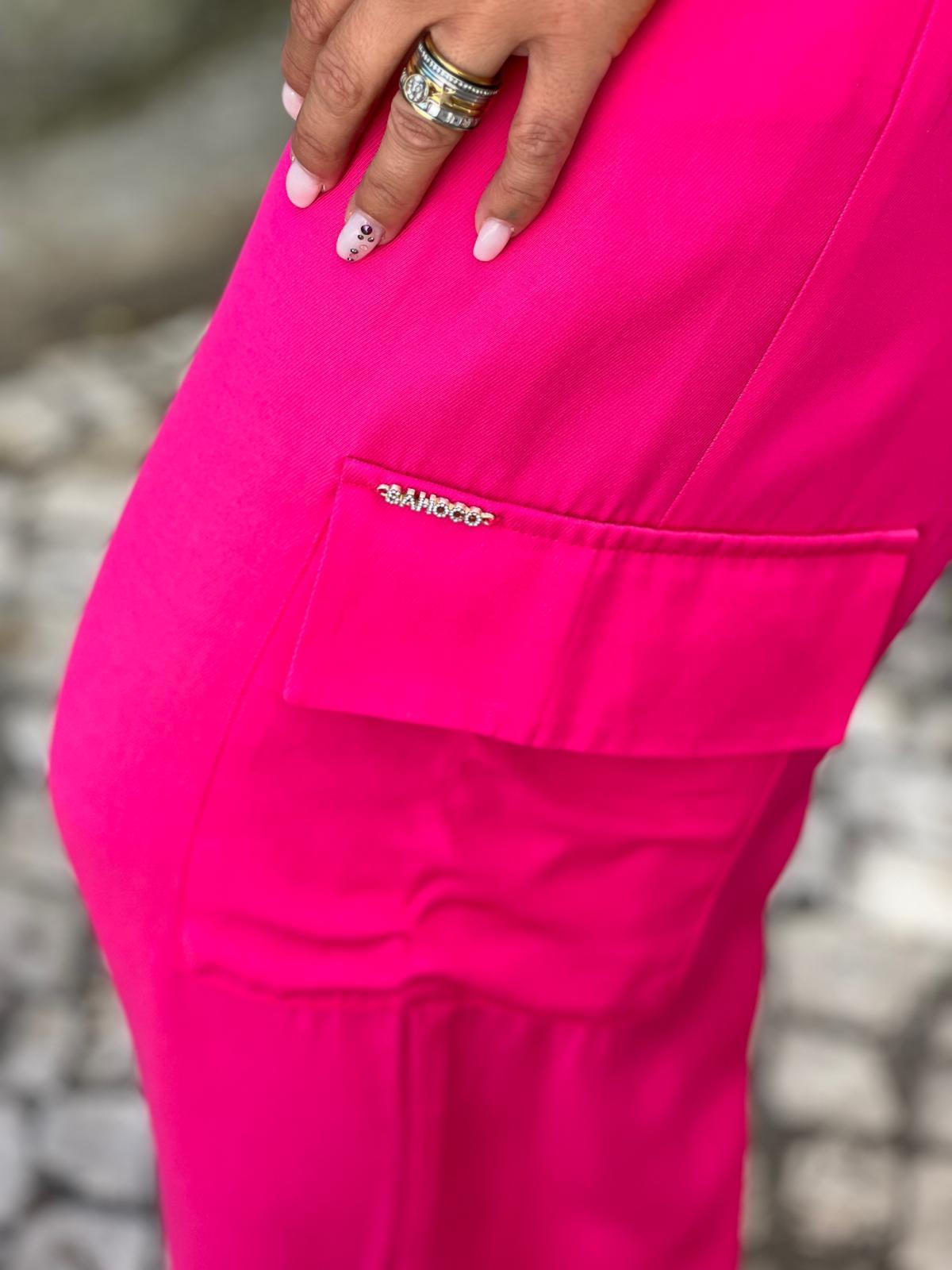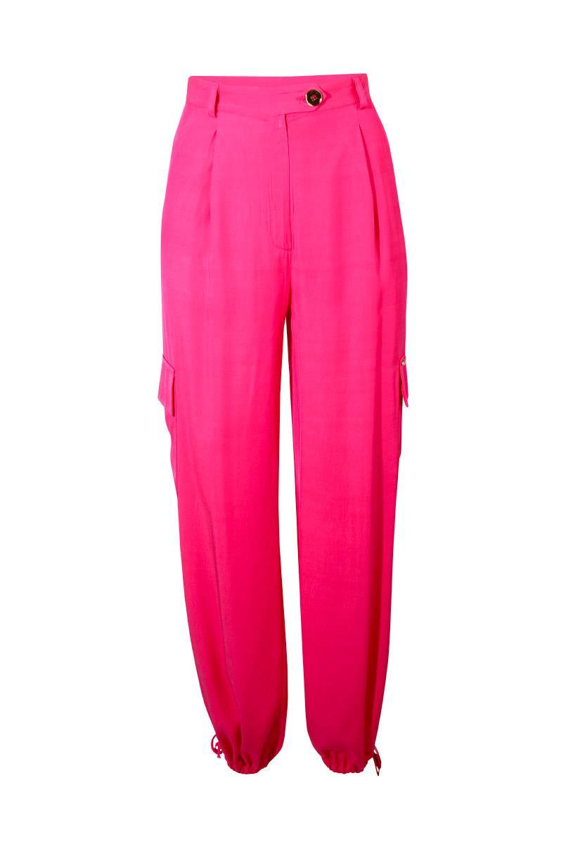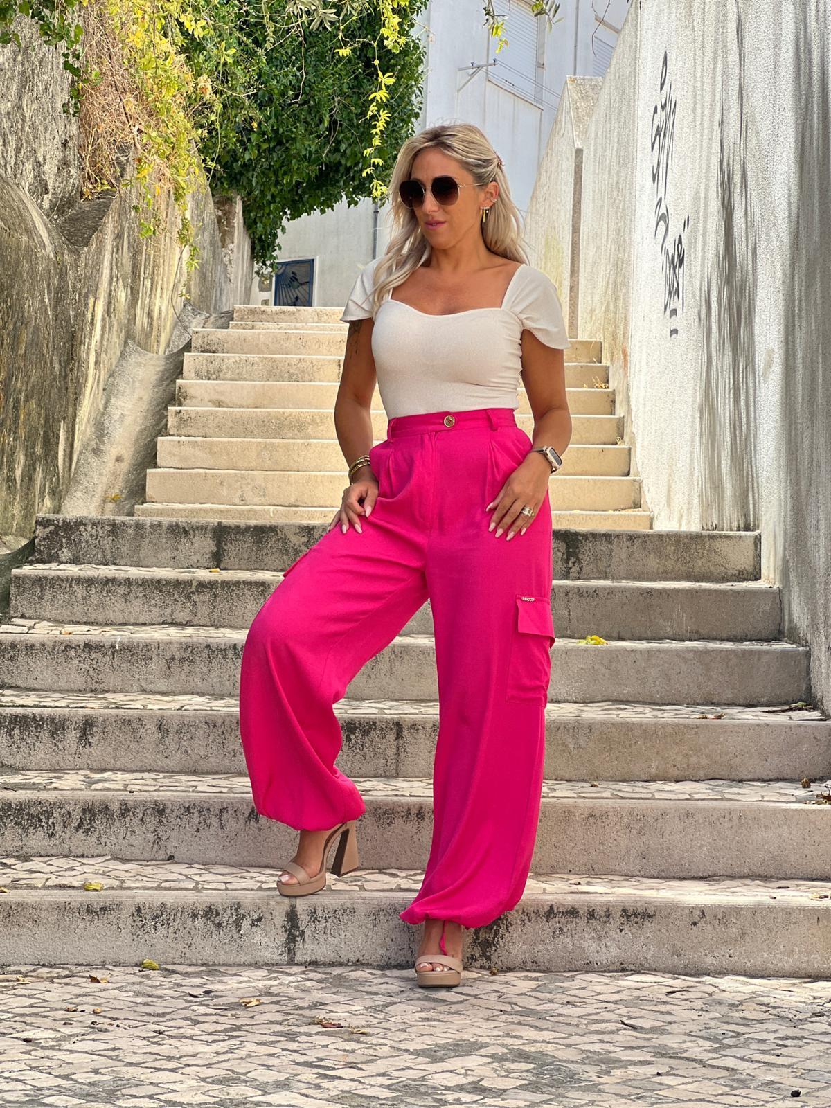 Calças de cintura subida com pinças à frente. Bolsos à frente e bolsos laterais de chapa com aba. Bainha ajustável com laçada. Fecho à frente com fecho de correr e botão.