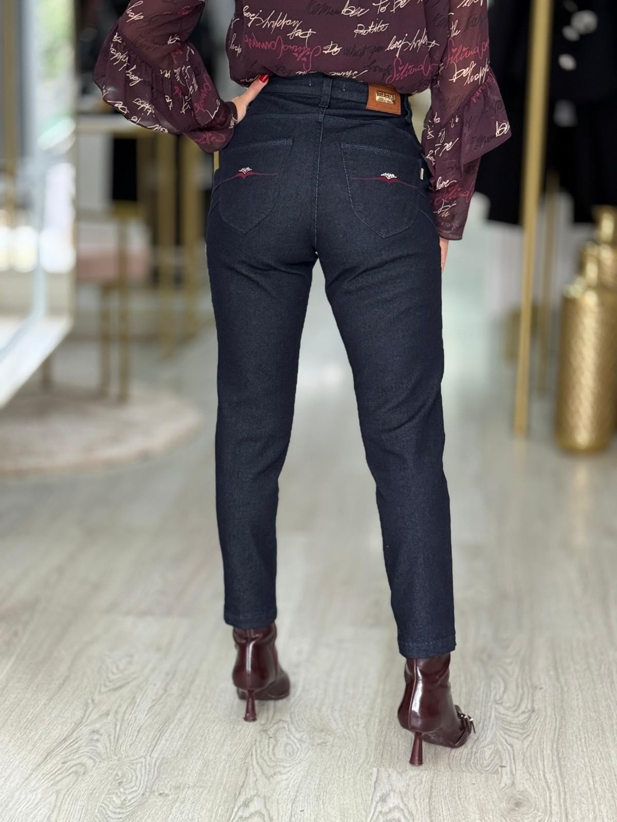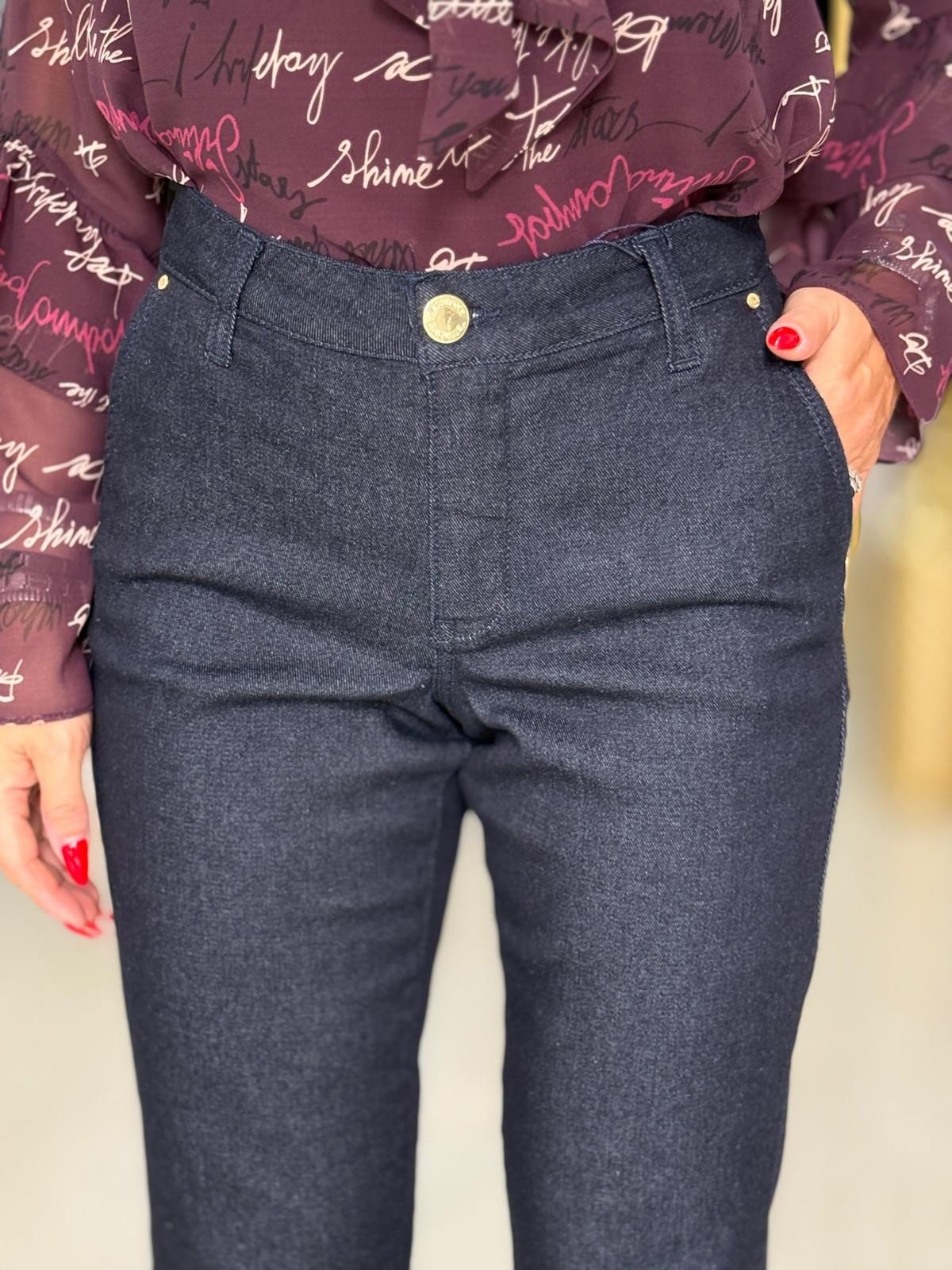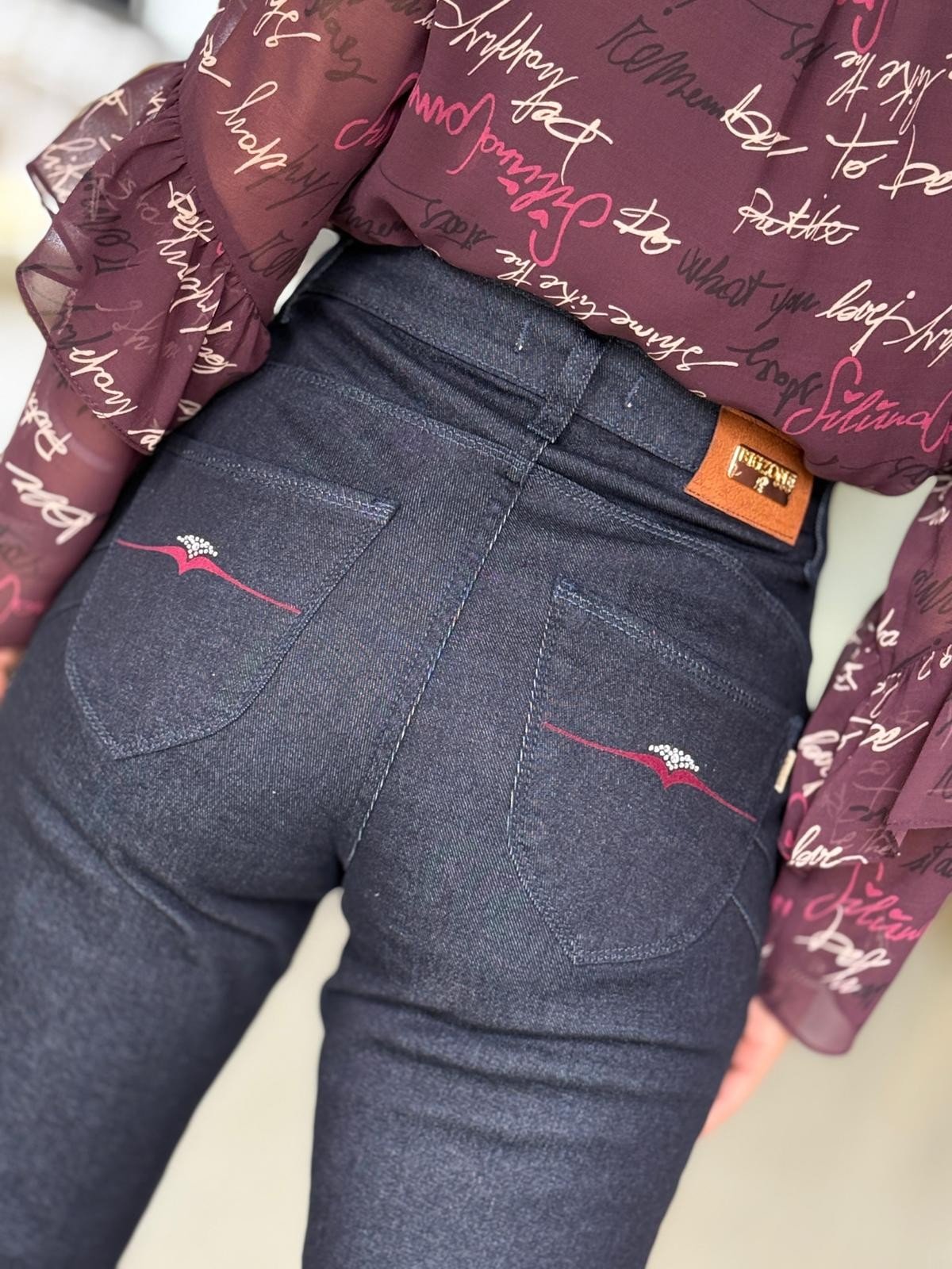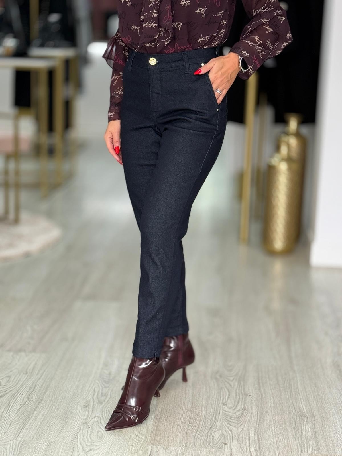 Calças de ganga de cintura média com presilhas. Modelo chino. Bolsos laterais. Bolsos de chapa atrás com strass.