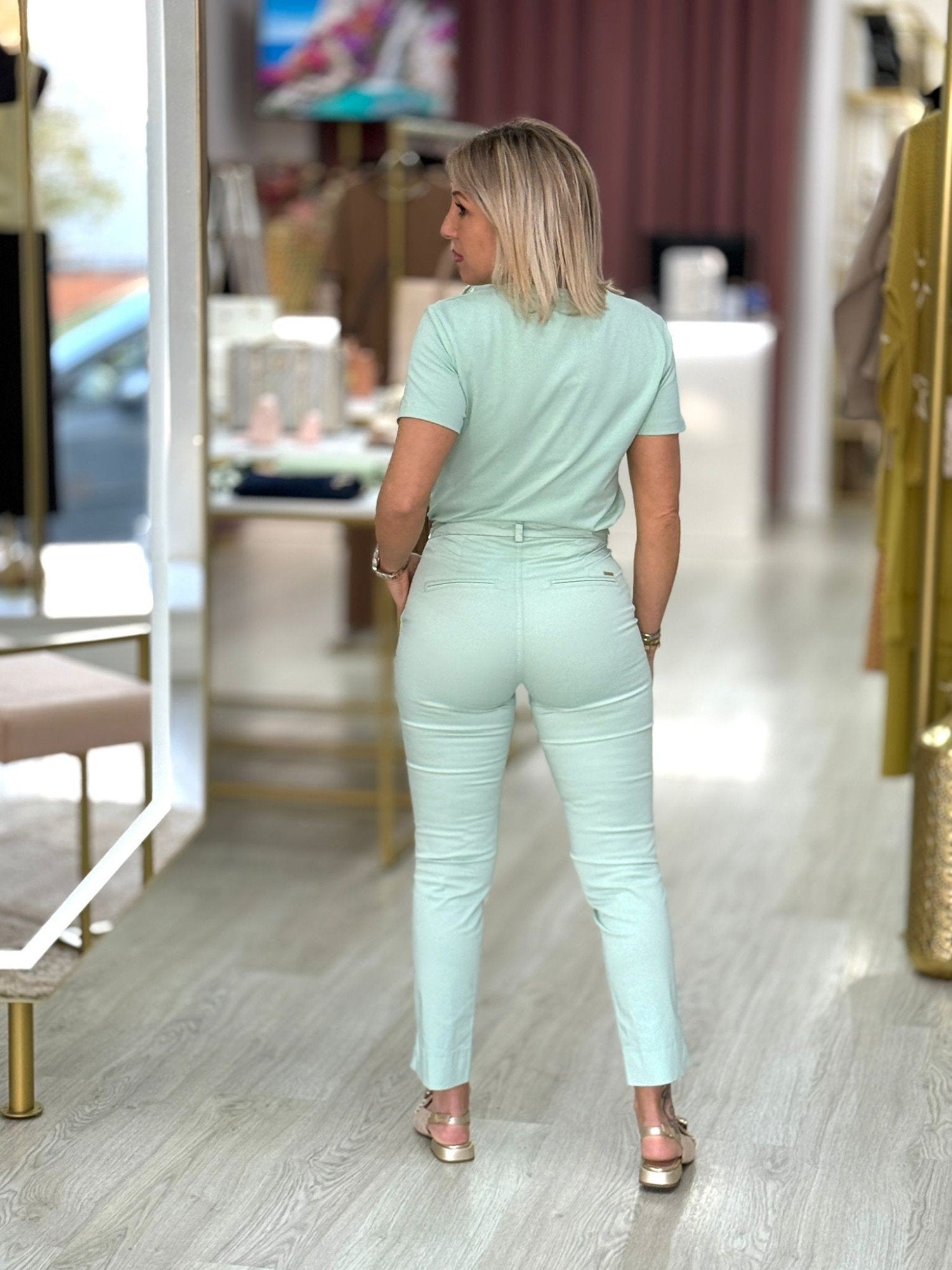 Calças modelo chino skinny de cintura subida. Bolsos laterais. Bolsos "falsos" atrás. Aplicação metálica na cintura. Fecha com botão metálico e fecho de correr.