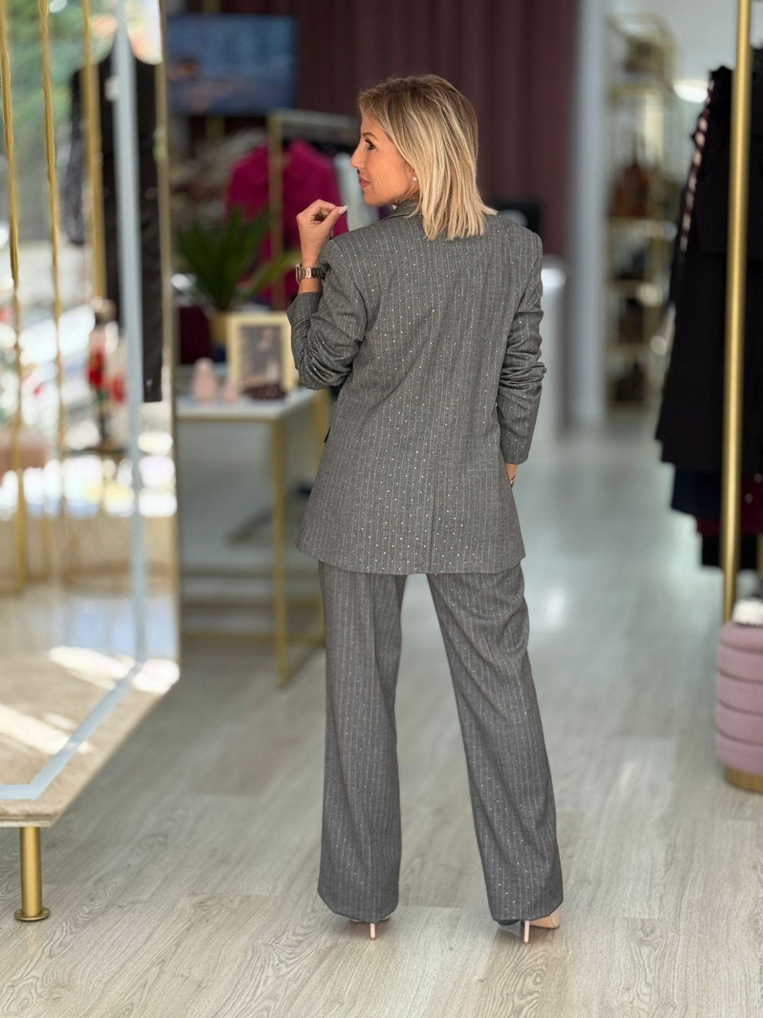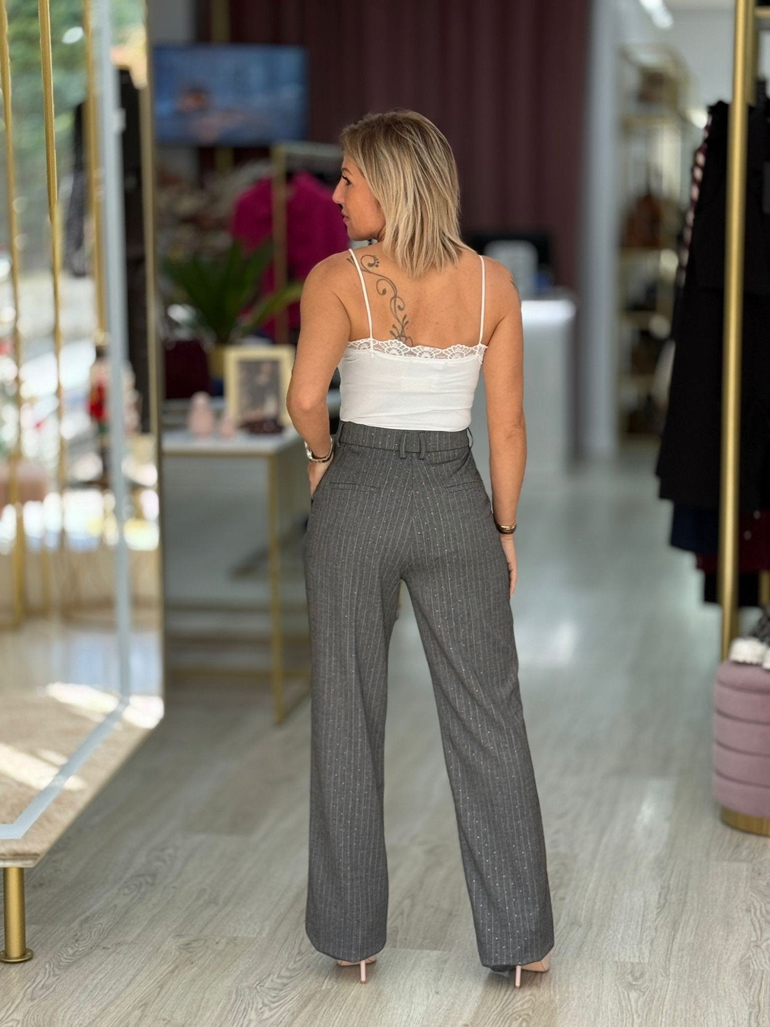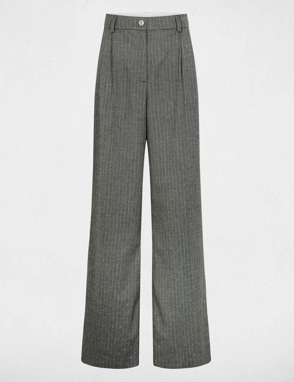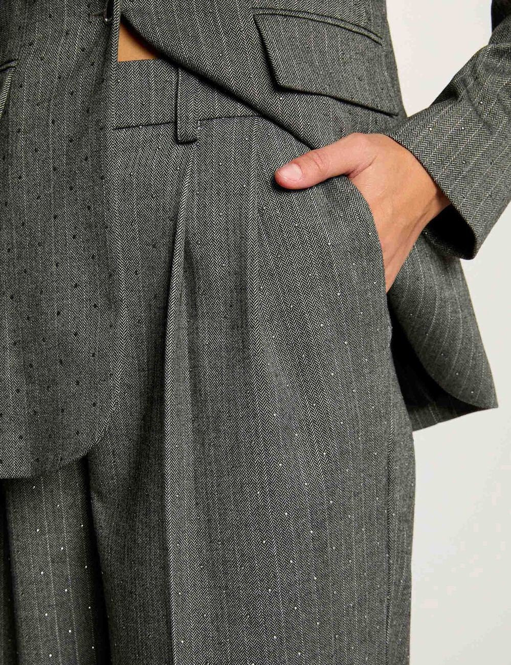 Estas calças personificam a elegância moderna com as suas riscas gráficas de corte reto e pregas refinadas. A cintura alta estrutura a silhueta, acrescentando um toque sofisticado. O corte reto intemporal adapta-se harmoniosamente a todos os tipos de corpo, para um estilo acessível e feminino.