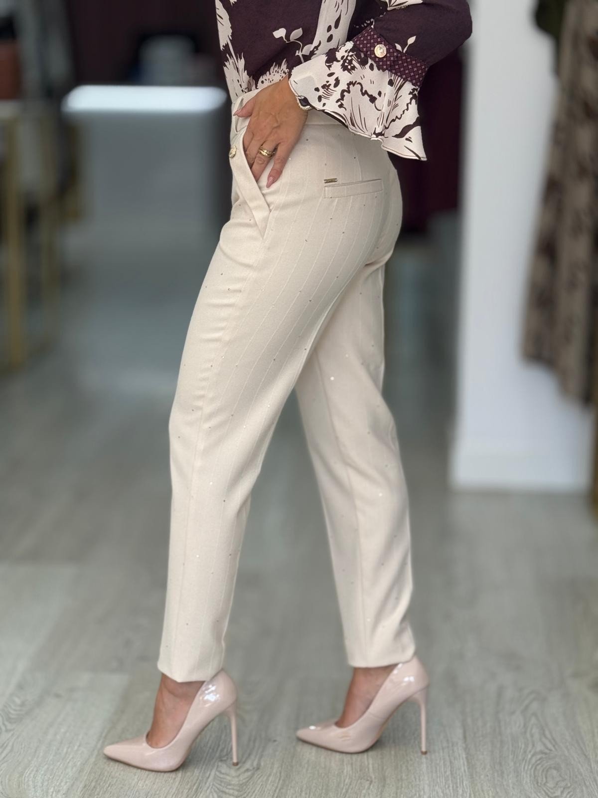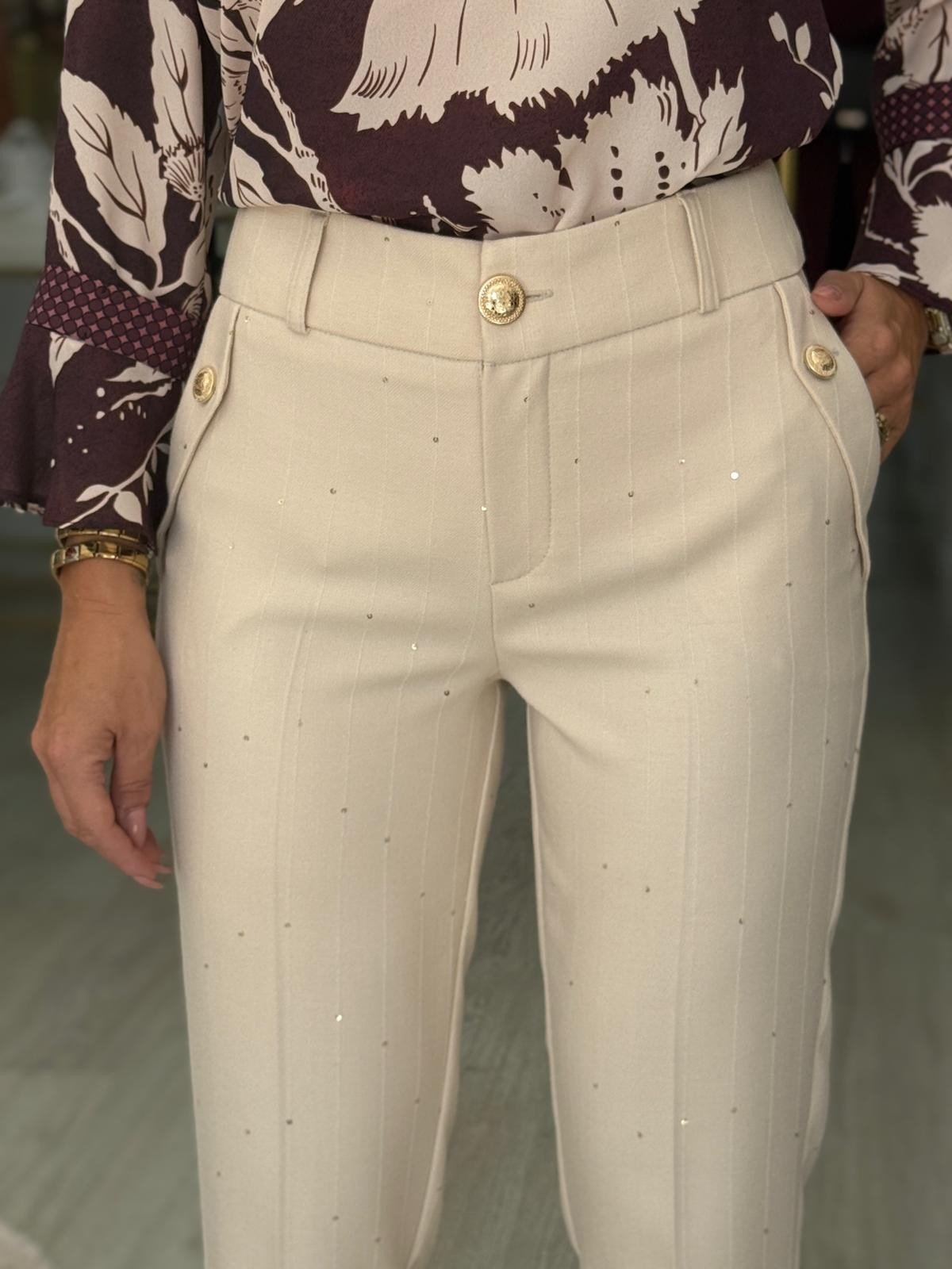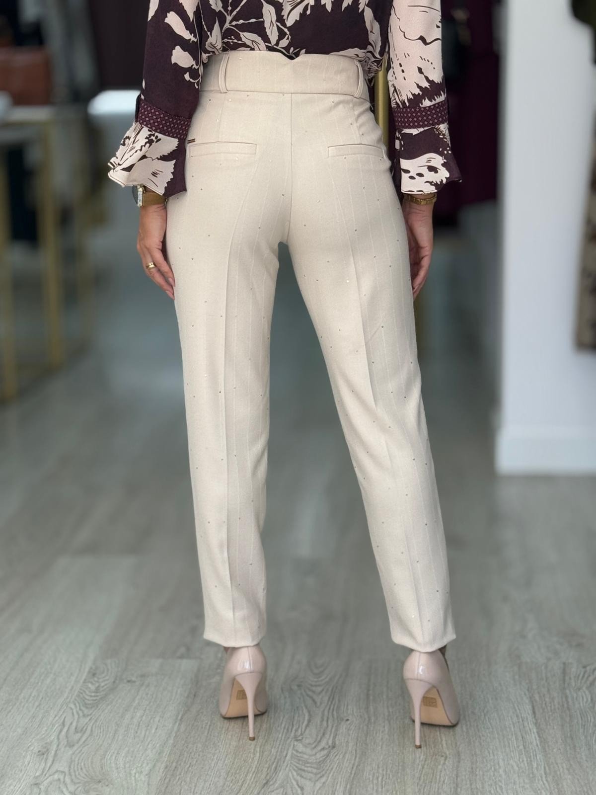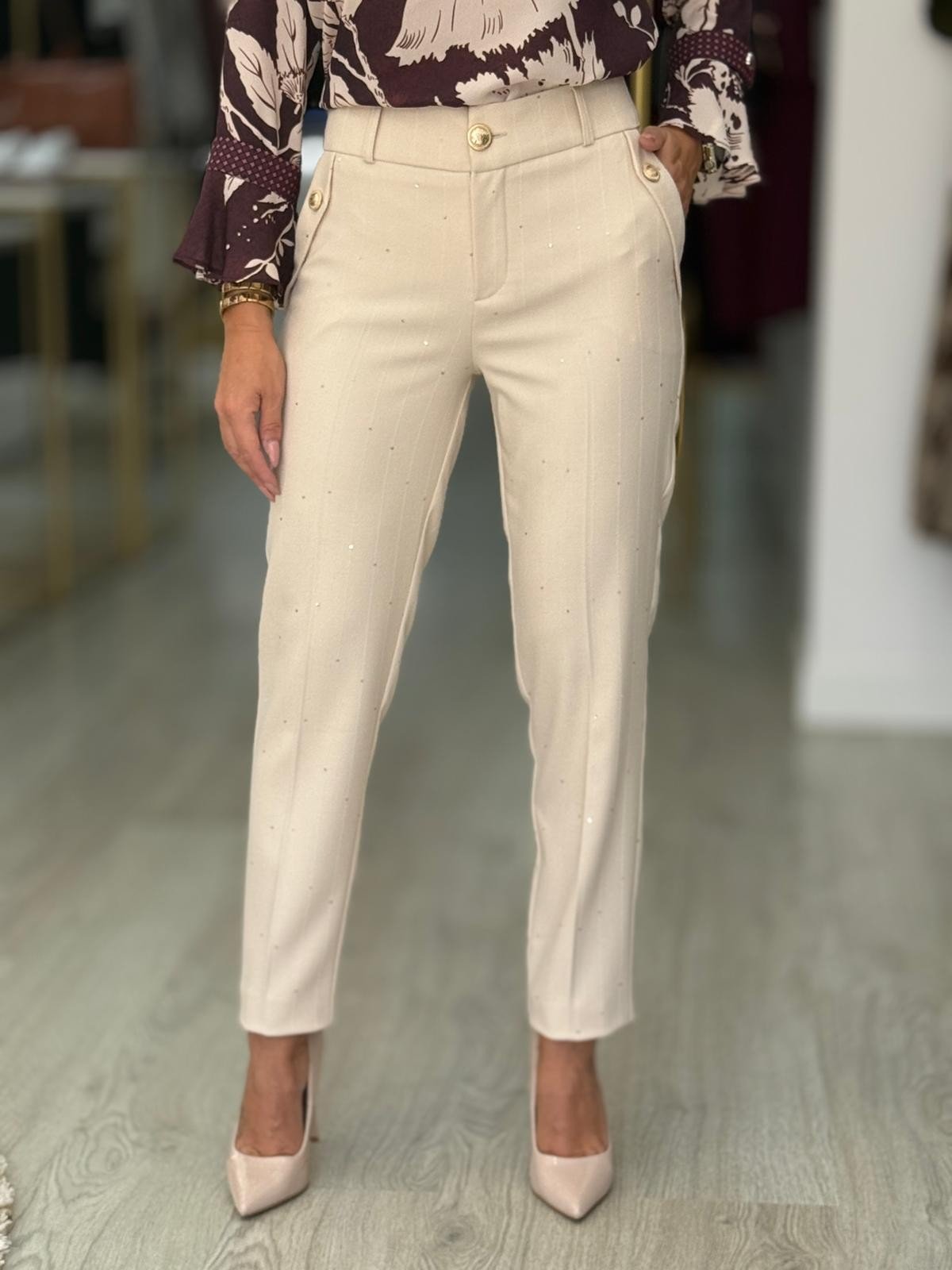 Calças clássicas com risca diplomática e pequenas lantejoulas. Cintura subida com presilhas. Bolsos laterais com aplicação de botão dourado. Bolsos falsos atrás. Bainha com virola. Fecha na frente com botão dourado e fecho de correr oculto pelo tecido.