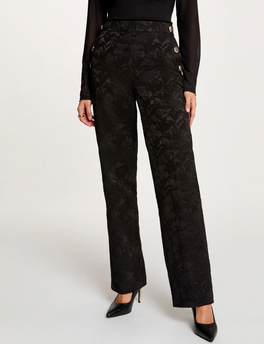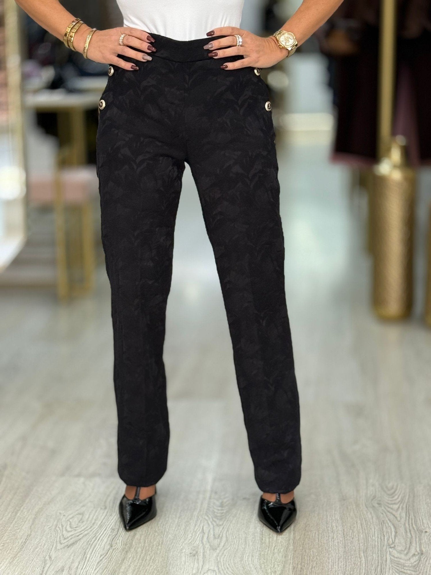 Esta calça de corte justo realça a silhueta com uma elegância natural. A cintura subida modela a figura e acentua a feminilidade moderna. O sofisticado e moderno estampado espinha de peixe acrescenta personalidade a esta peça indispensável. Os delicados botões completam o look com um detalhe requintado que faz toda a diferença.