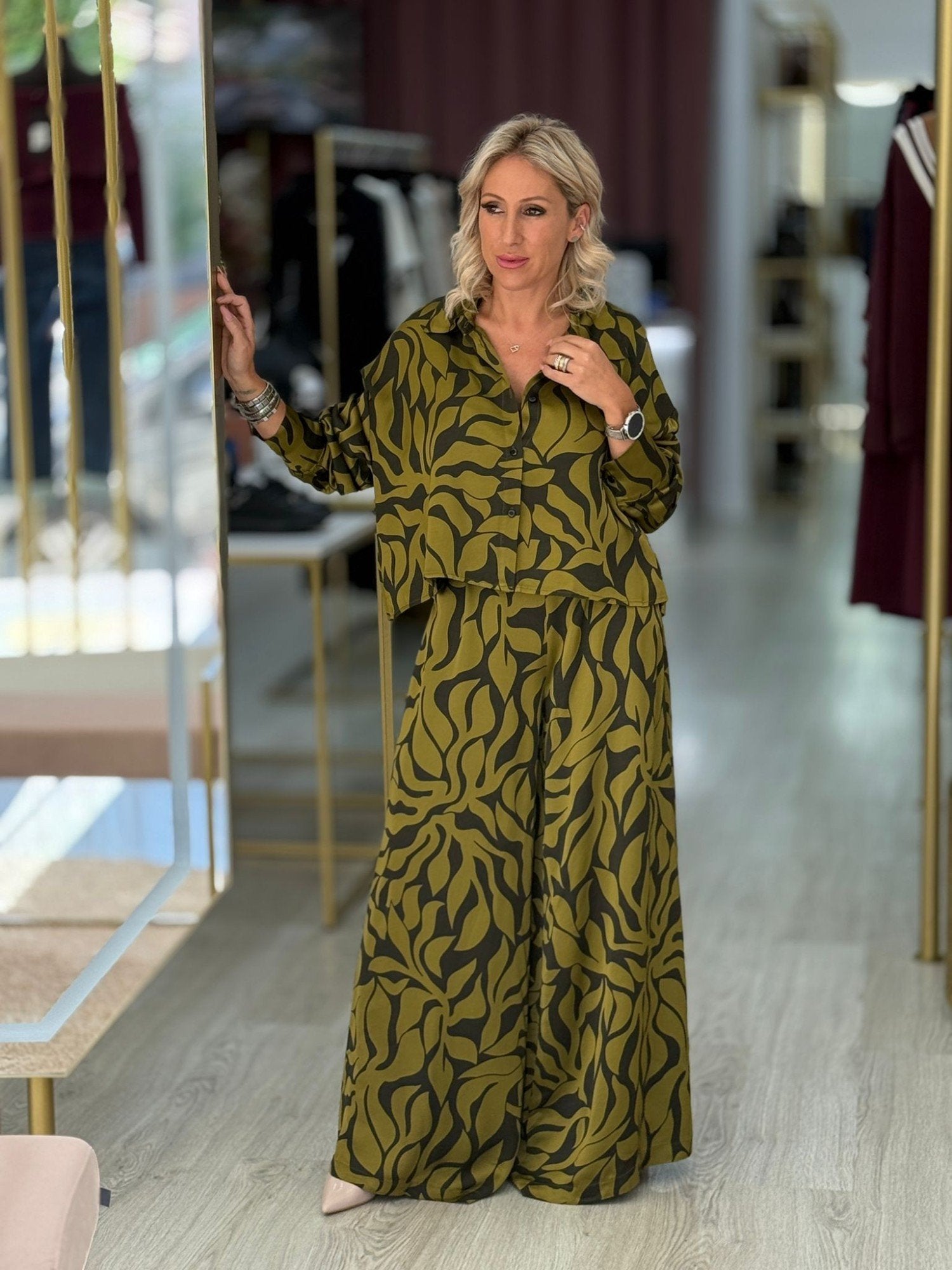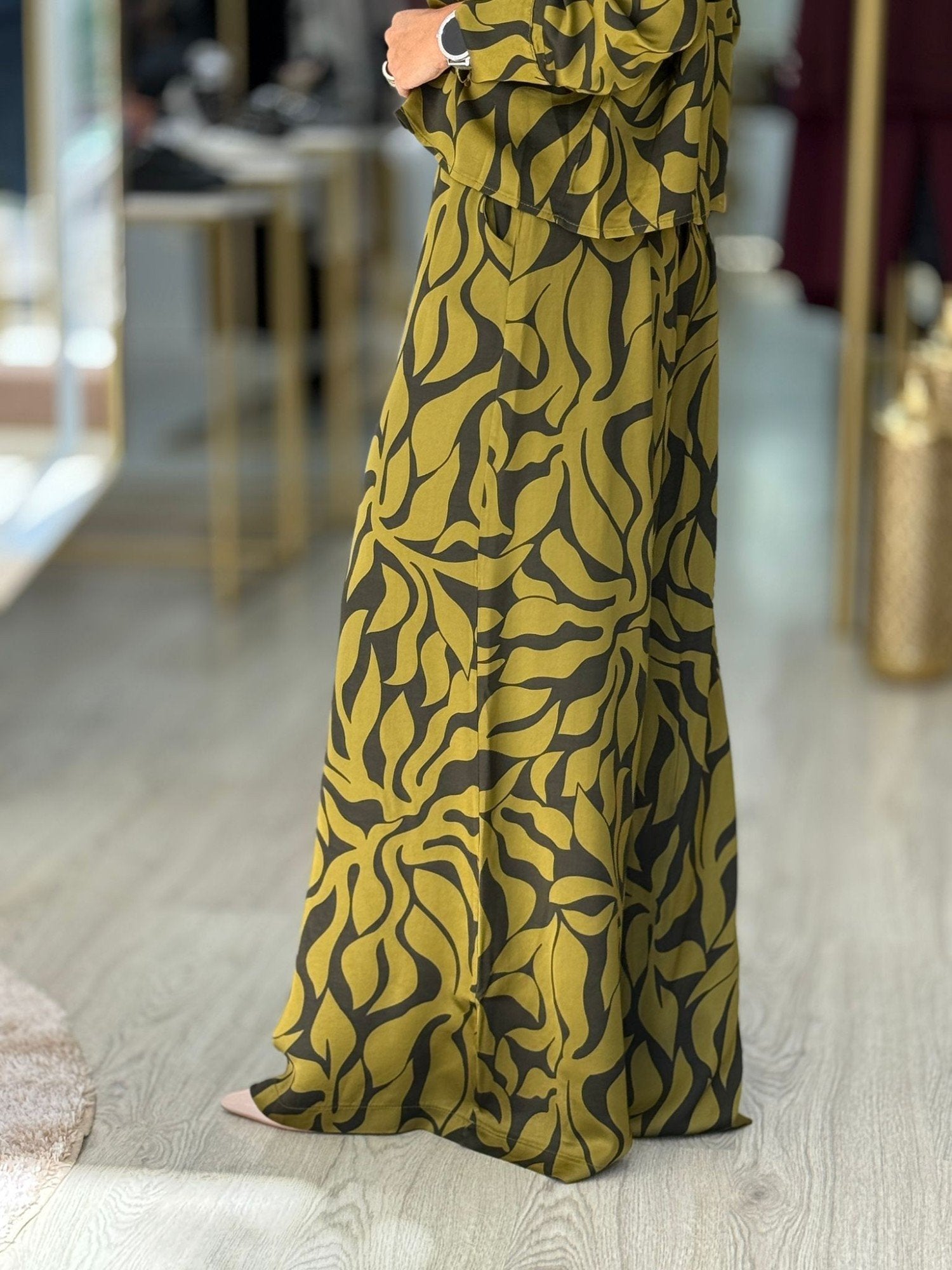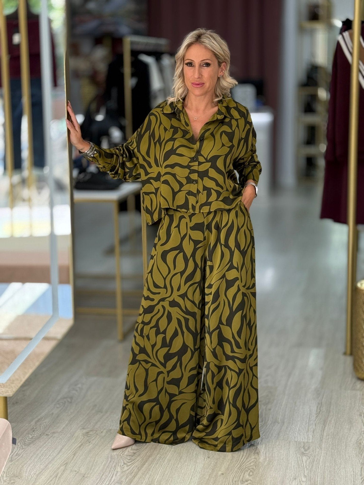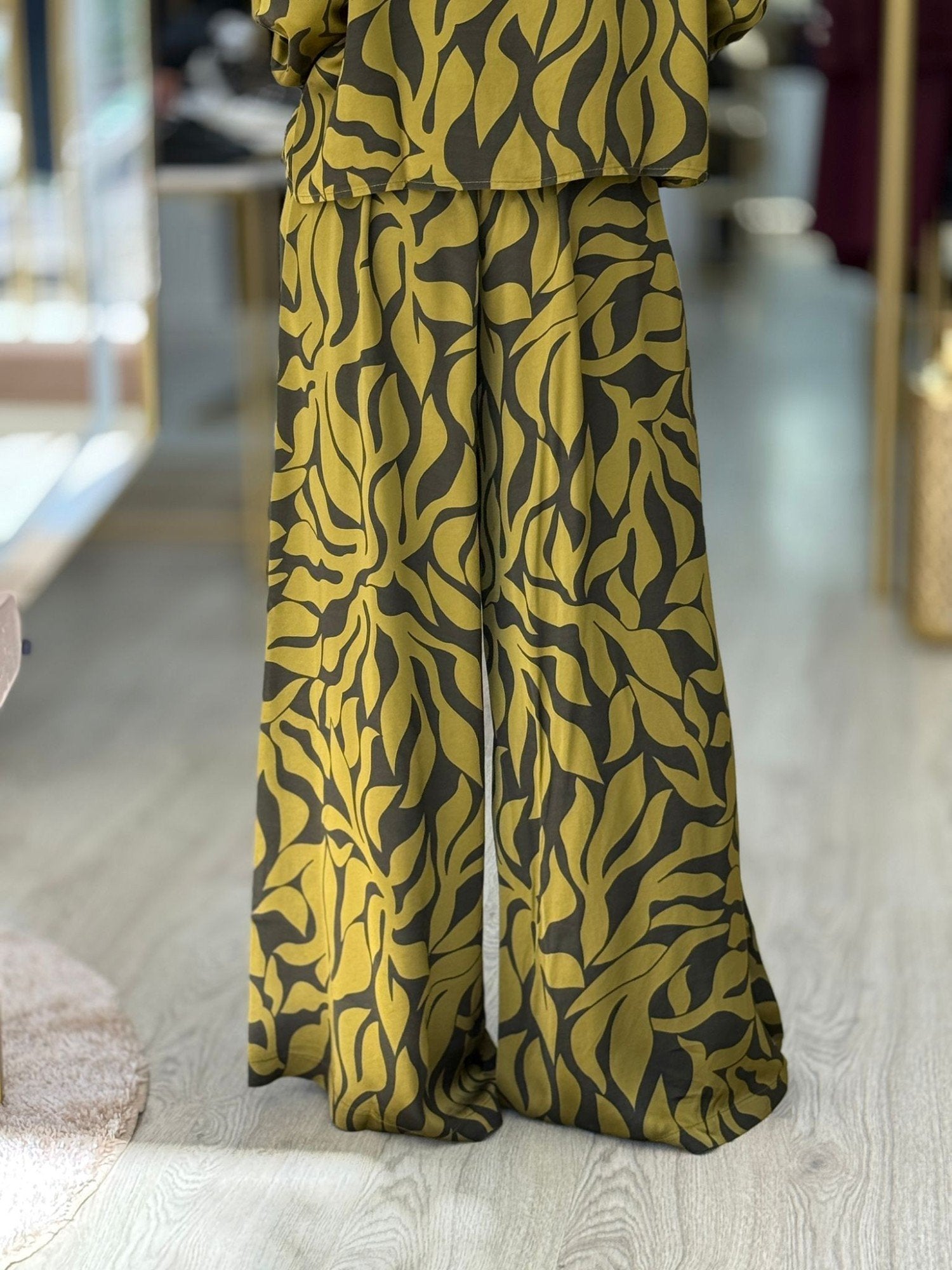Calças largas acetinadas com estampado floral. Ajusta na cintura com elástico.