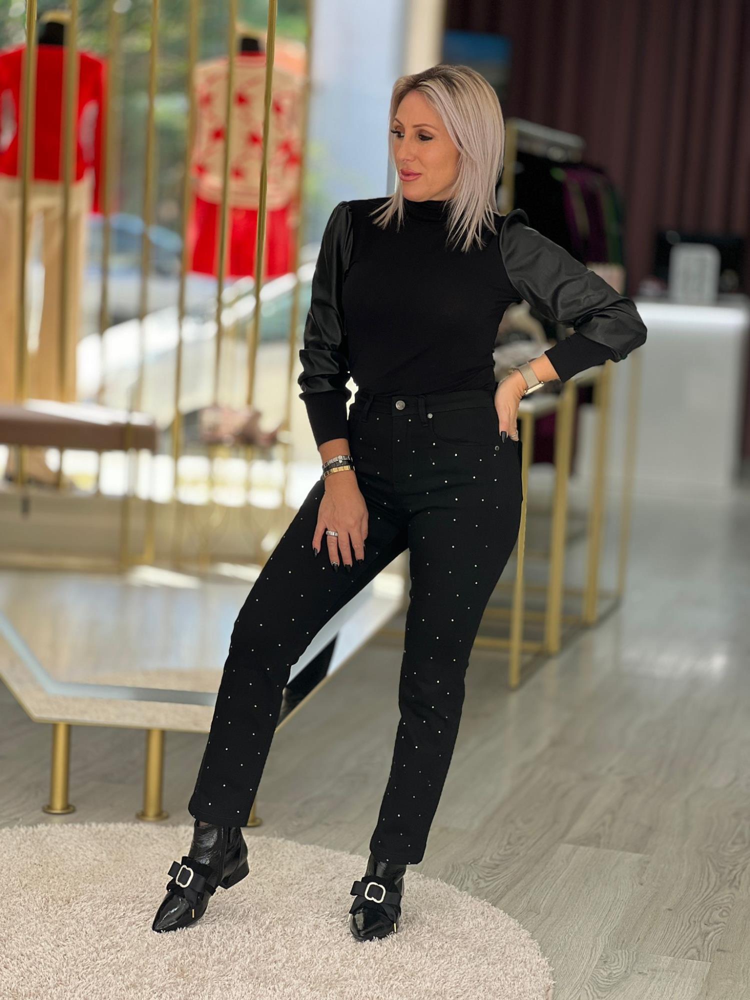 Calça de ganga de cintura subida com presilhas, com aplicação de strass na frente. 3 bolsos à frente e 2 bolsos atrás.