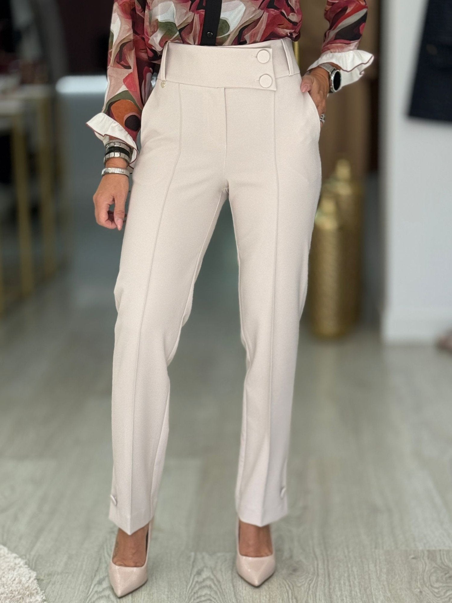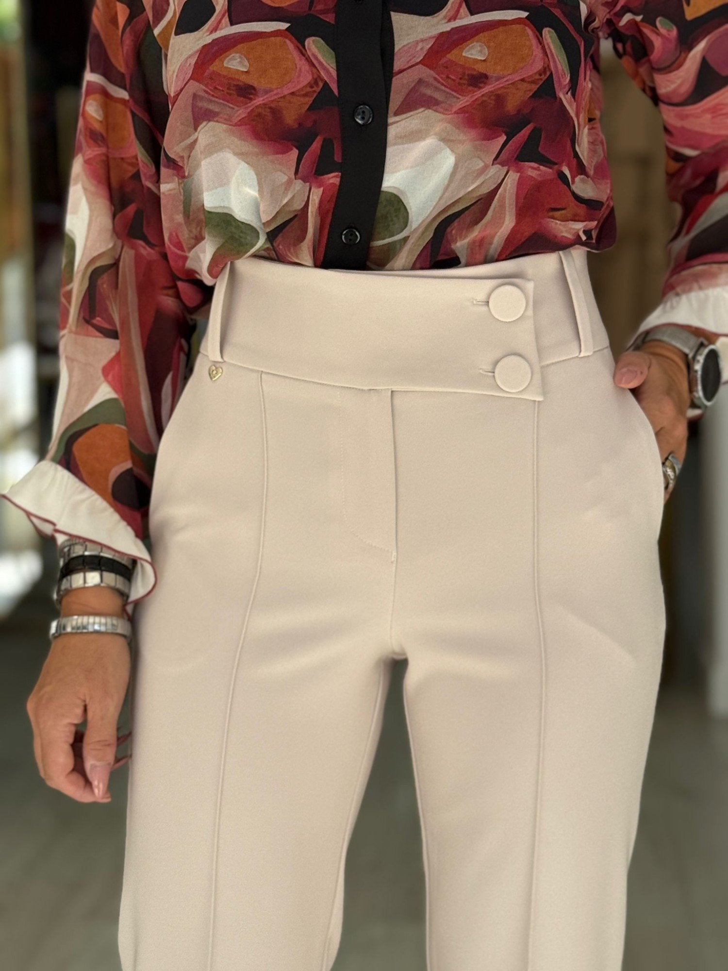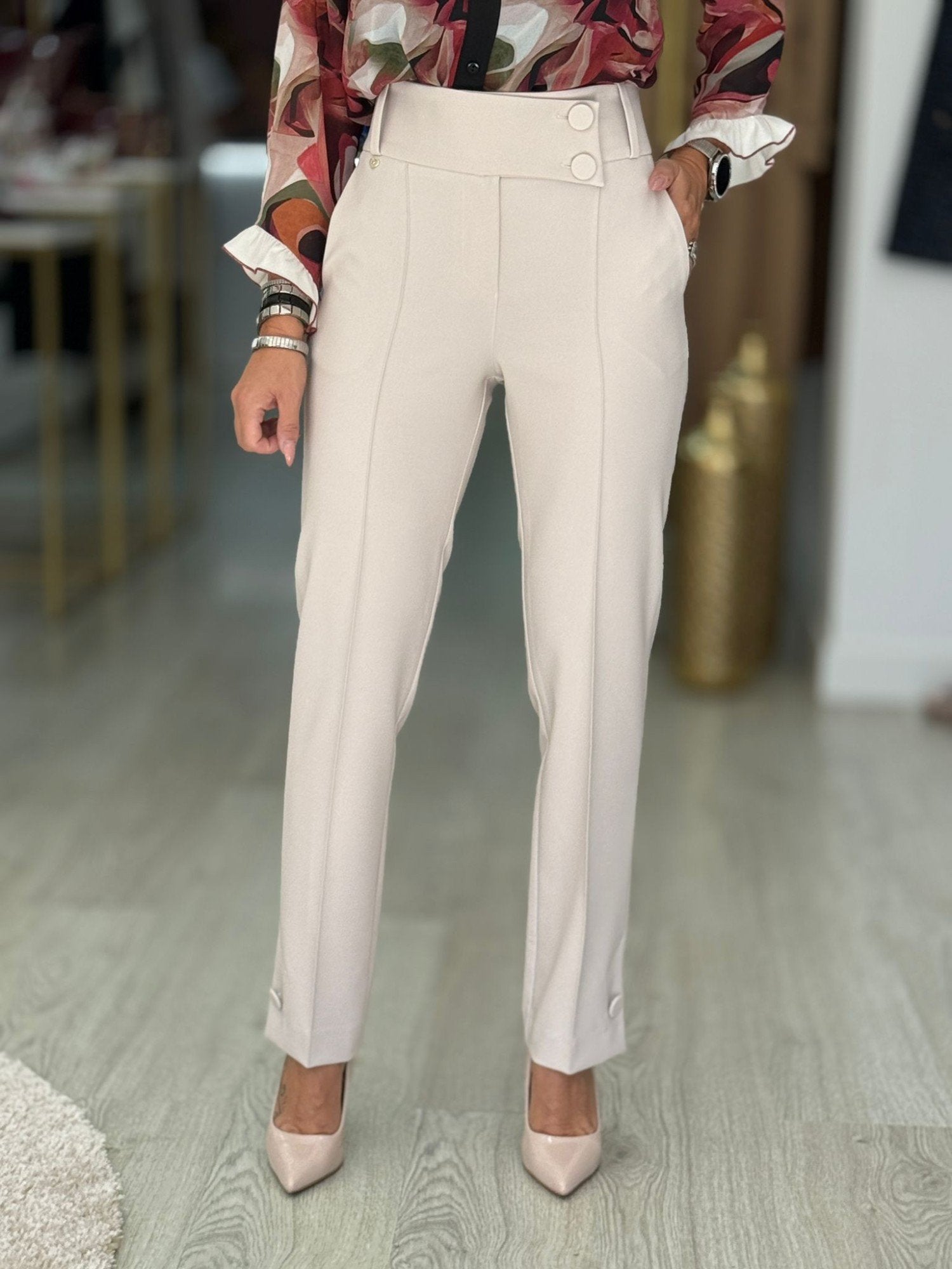 Calças de corte a direito são um exemplo de como o design pode transformar uma peça clássica numa escolha sofisticada e distinta. caimento impecável, elasticidade e conforto, adaptando-se ao corpo sem perder a sua estrutura elegante. A cintura alta com cós assimétrico, enriquecida por dois botões forrados no mesmo tom. O fecho frontal mantém a silhueta limpa, enquanto os bolsos laterais acrescentam funcionalidade. Um detalhe inesperado, o botão forrado na zona do tornozelo, acrescenta charme subtil e diferencia a peça, transformando-a numa opção que se destaca em qualquer coordenado.