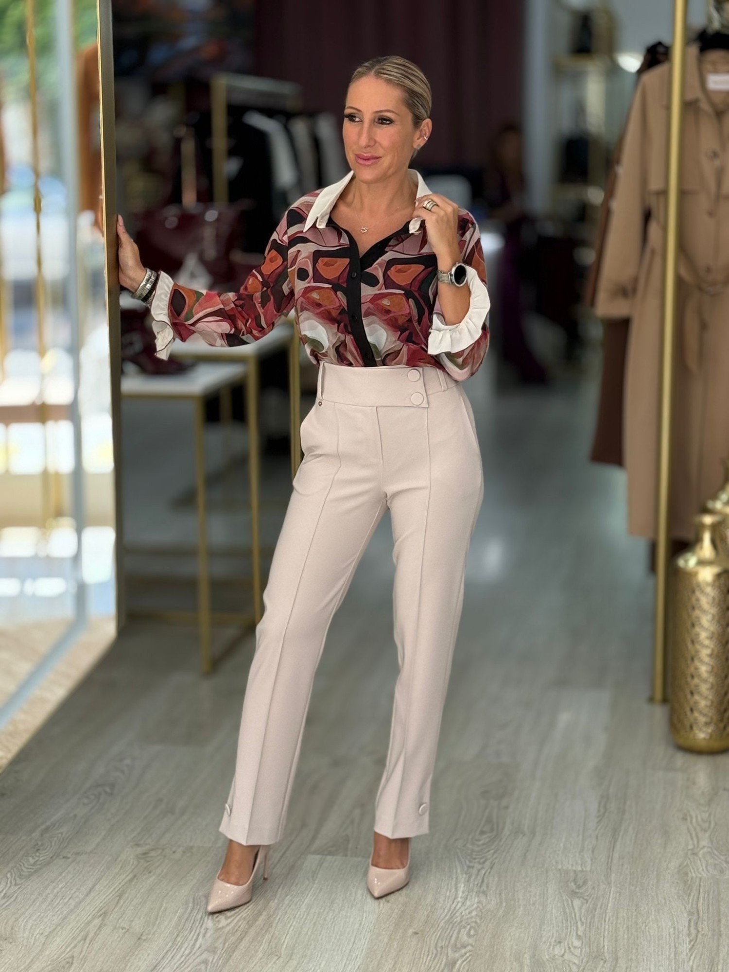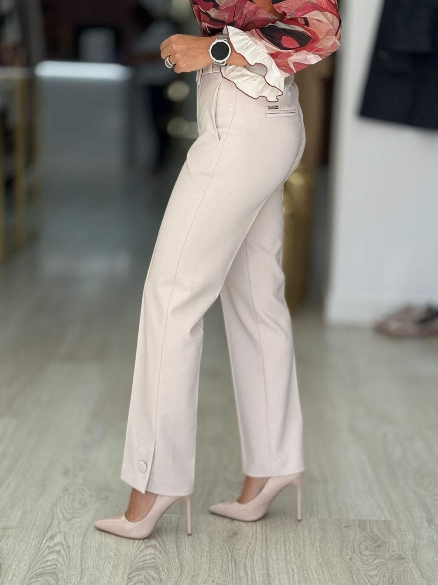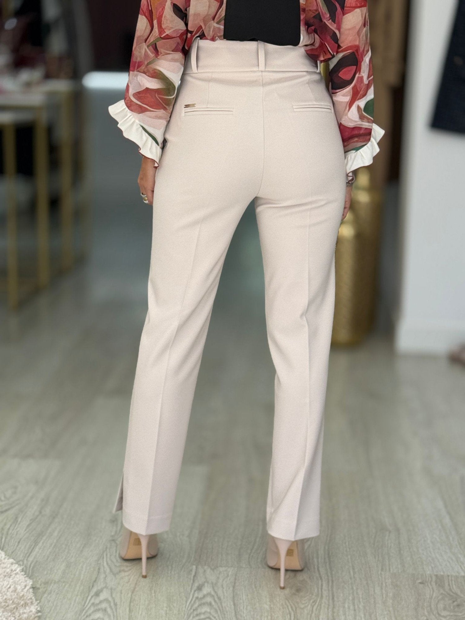 Calças de corte a direito são um exemplo de como o design pode transformar uma peça clássica numa escolha sofisticada e distinta. caimento impecável, elasticidade e conforto, adaptando-se ao corpo sem perder a sua estrutura elegante. A cintura alta com cós assimétrico, enriquecida por dois botões forrados no mesmo tom. O fecho frontal mantém a silhueta limpa, enquanto os bolsos laterais acrescentam funcionalidade. Um detalhe inesperado, o botão forrado na zona do tornozelo, acrescenta charme subtil e diferencia a peça, transformando-a numa opção que se destaca em qualquer coordenado.