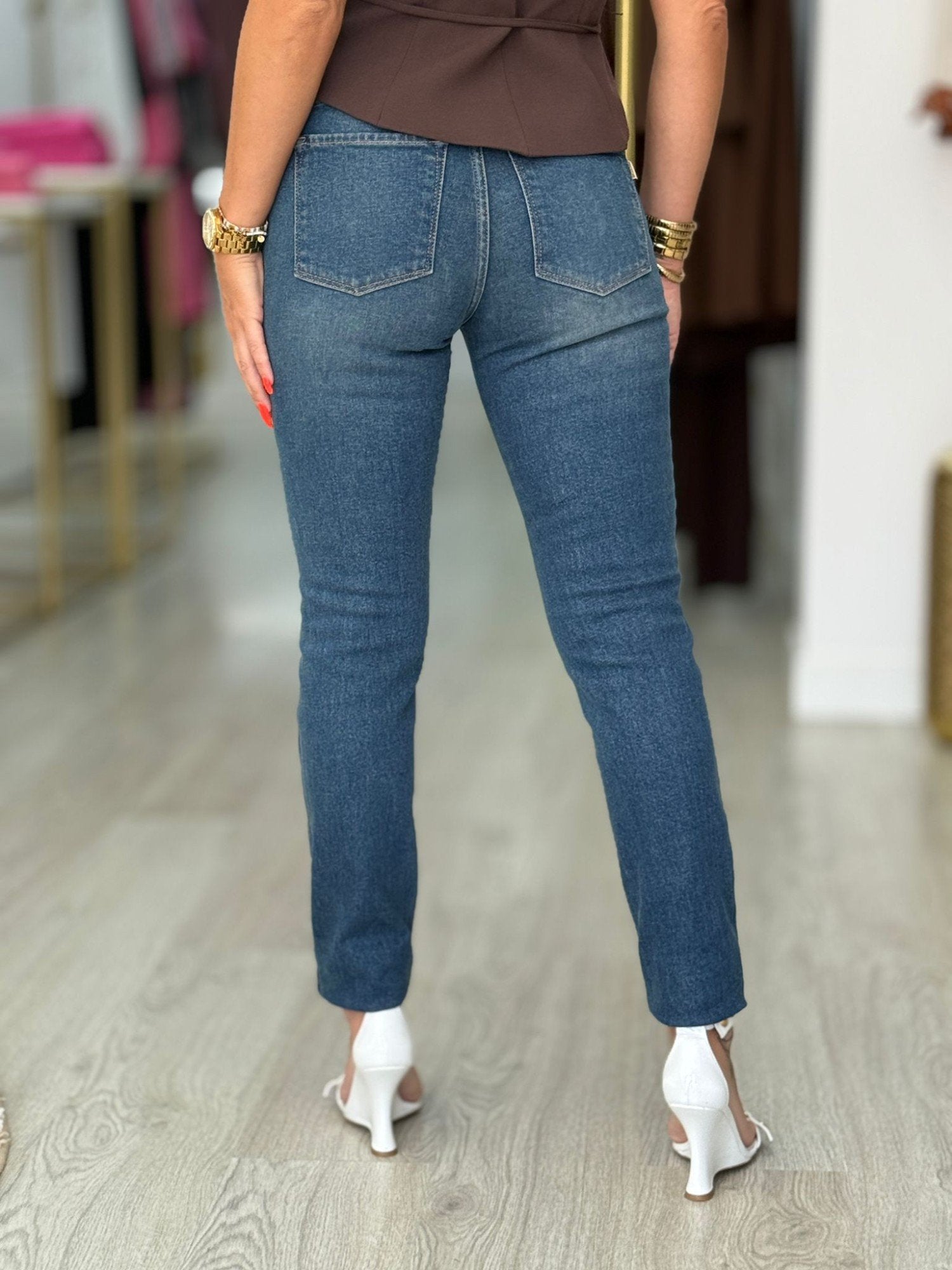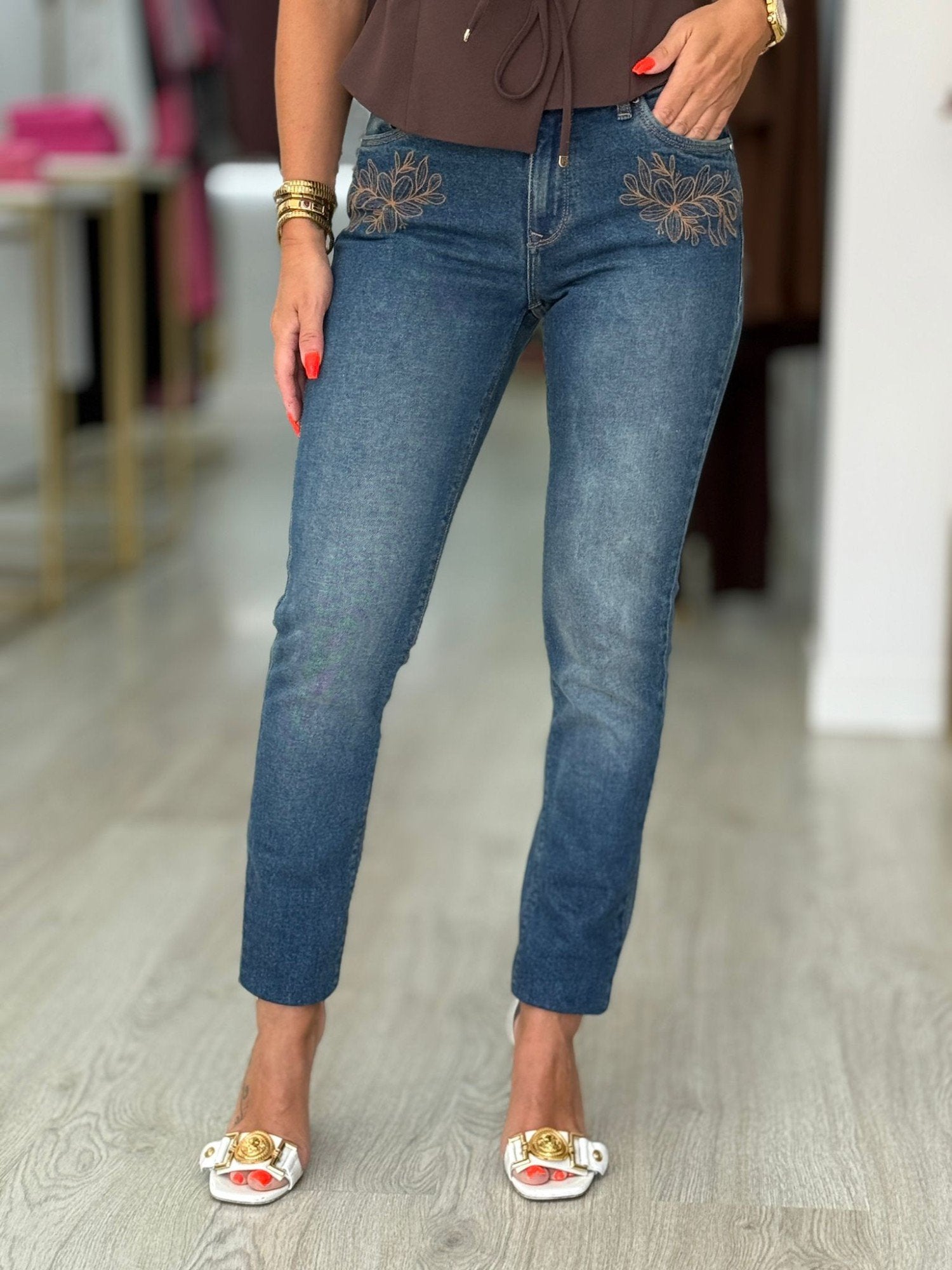 Calças de ganga de cintura média. Modelo skinny com bordado na zona dos bolsos. Três bolsos à frente e dois bolsos de chapa atrás. Fecha na frente com botão e fecho de correr.