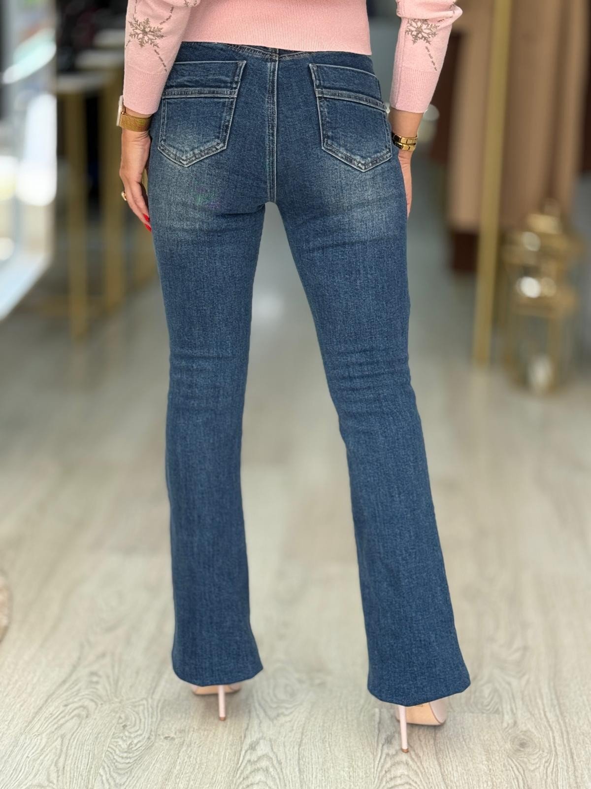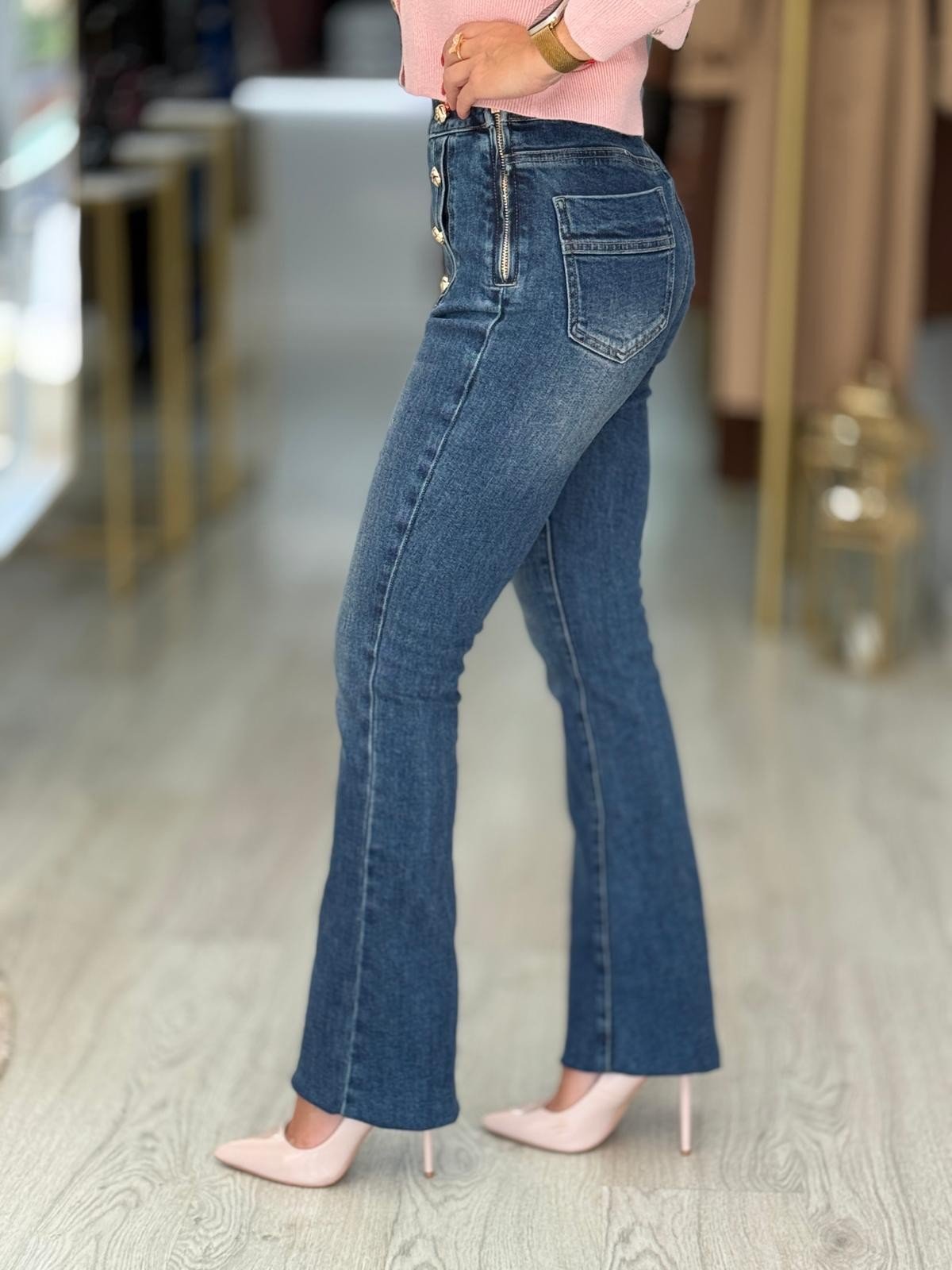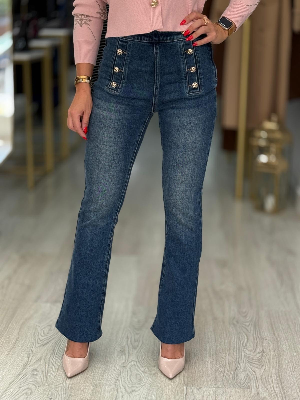 Calças de ganga de cintura subida com aplicação de botões em forma de flor na frente. Modelo flare. Bolsos de chapa atrás. Fecha com fecho de correr na lateral.