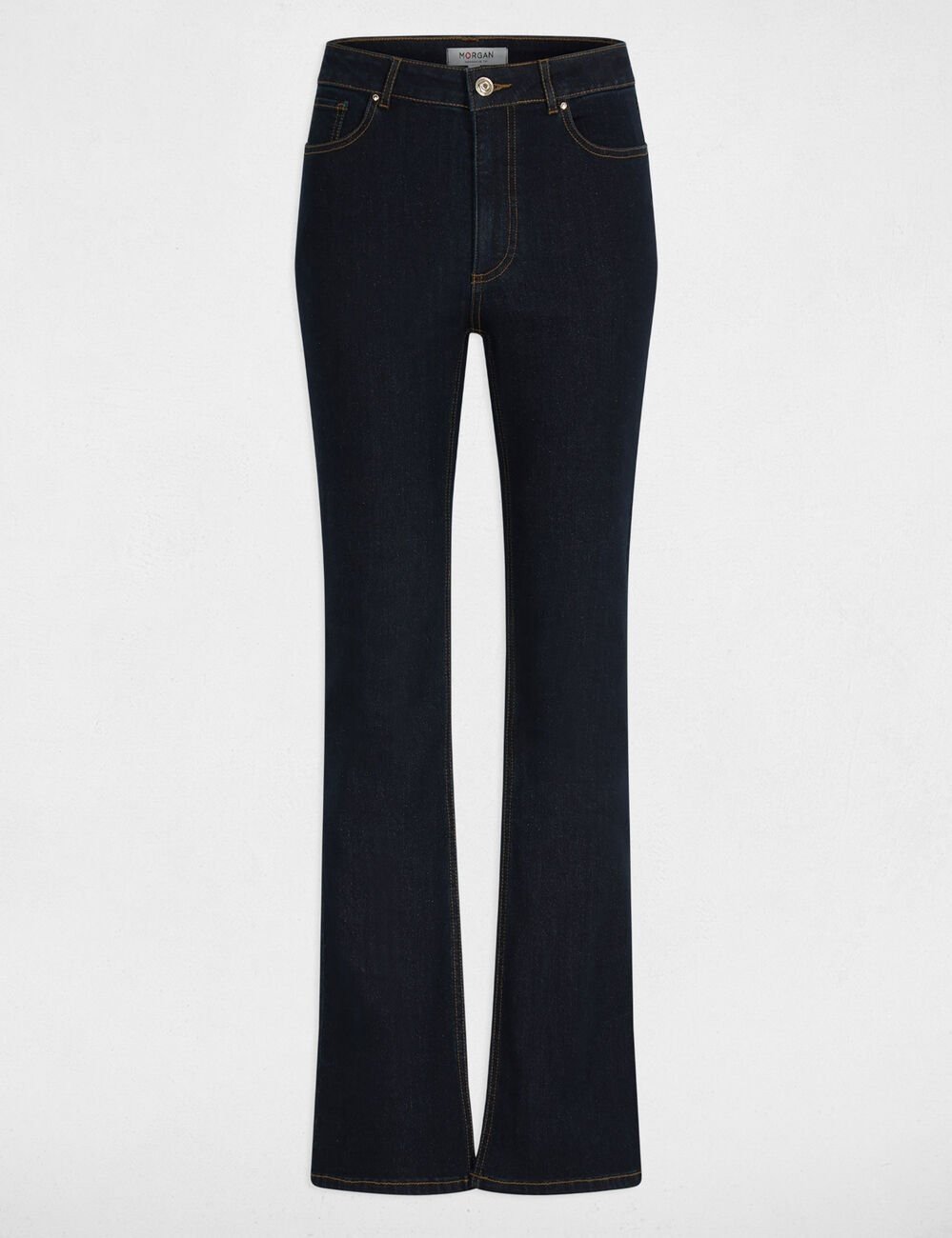 Calças de ganga de cintura subida com presilhas. Modelo bootcut com brilhos. Três bolsos à frente e dois bolsos de chapa atrás. Fecha na frente com botão e fecho de correr.