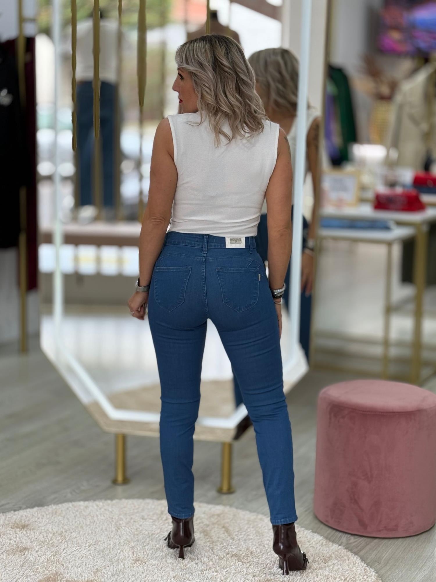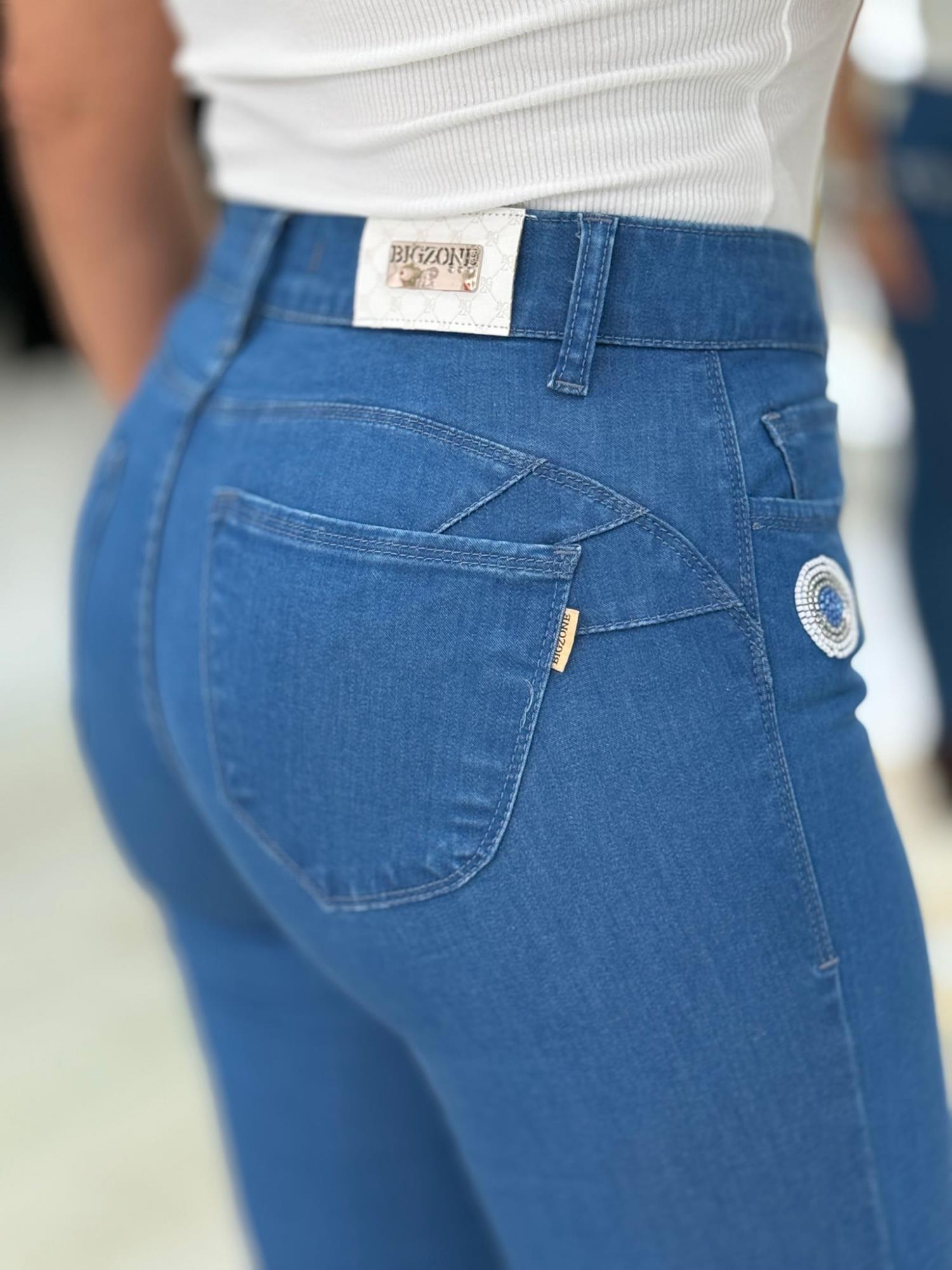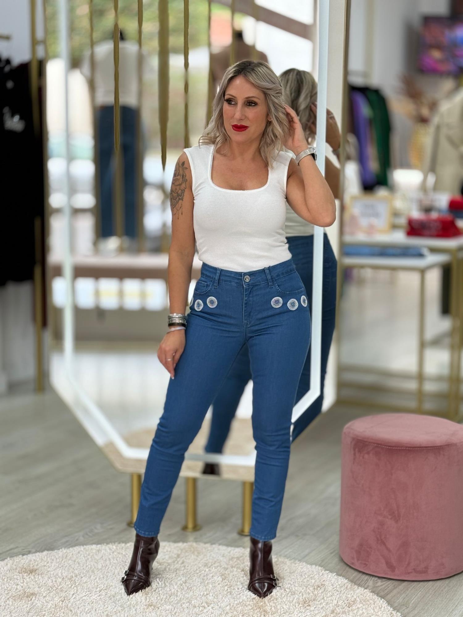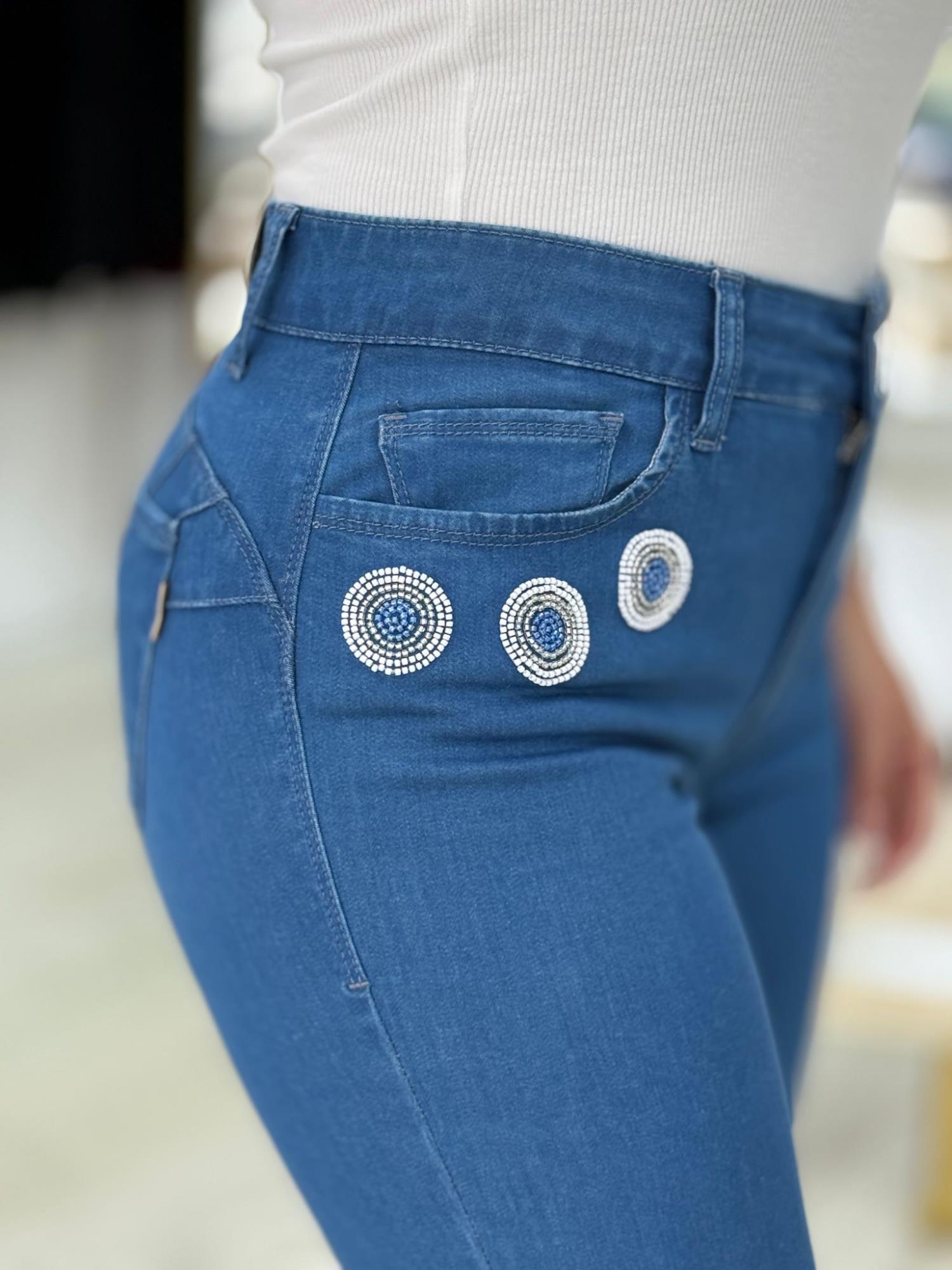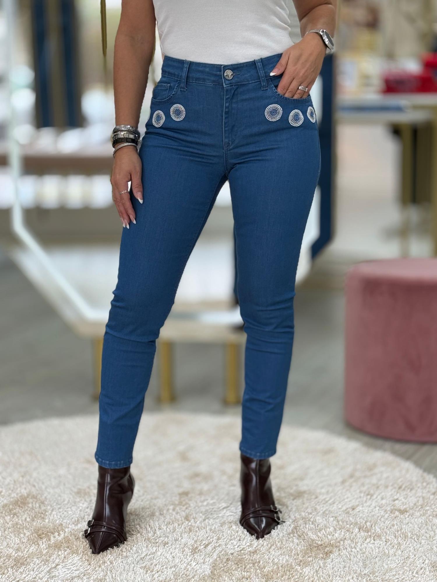 Calças de ganga de cintura média com presilhas. Modelo skinny. Aplicação de missangas na zona dos bolsos. 3 Bolsos à frente e 2 bolsos de chapa atrás.
