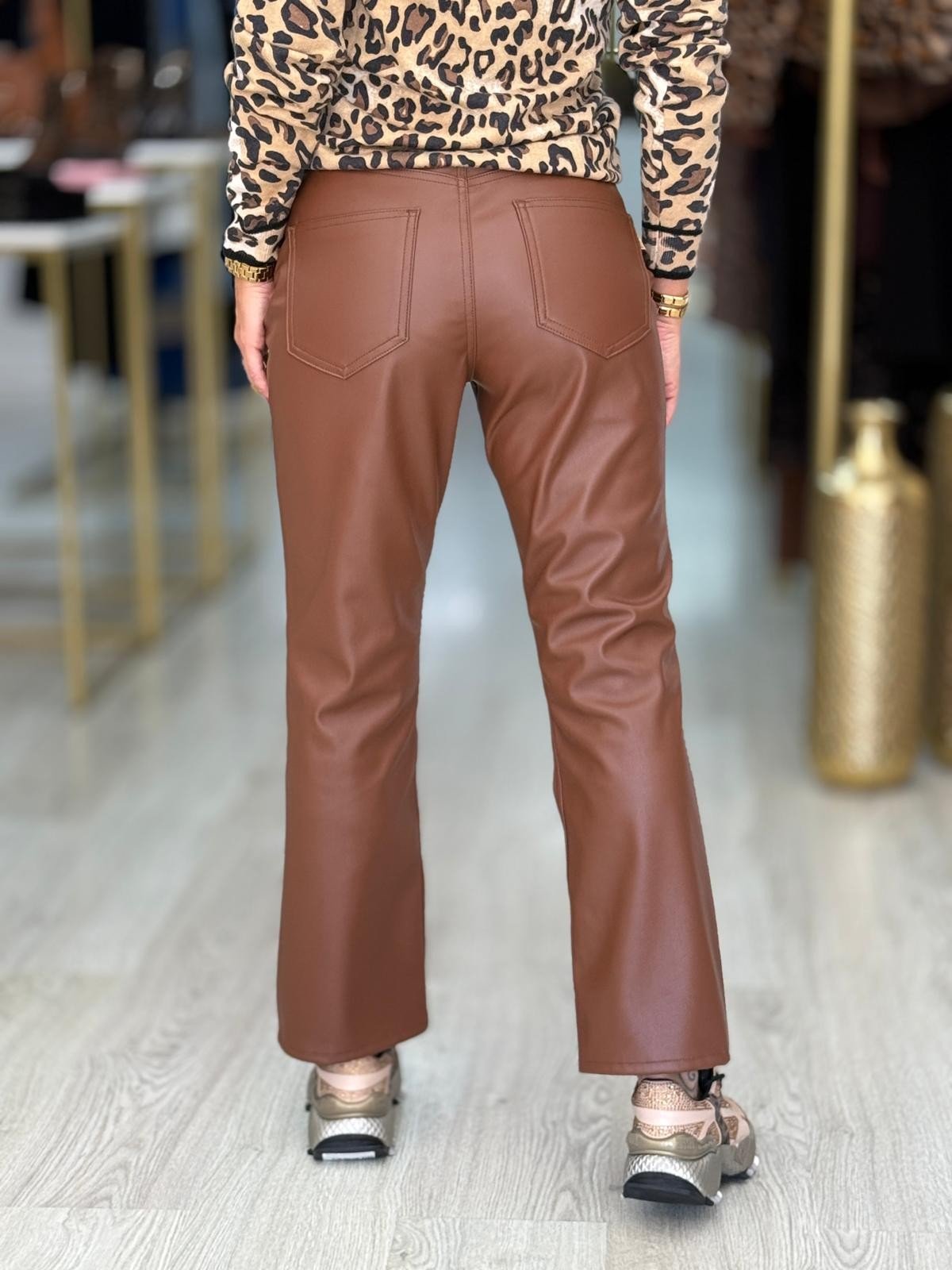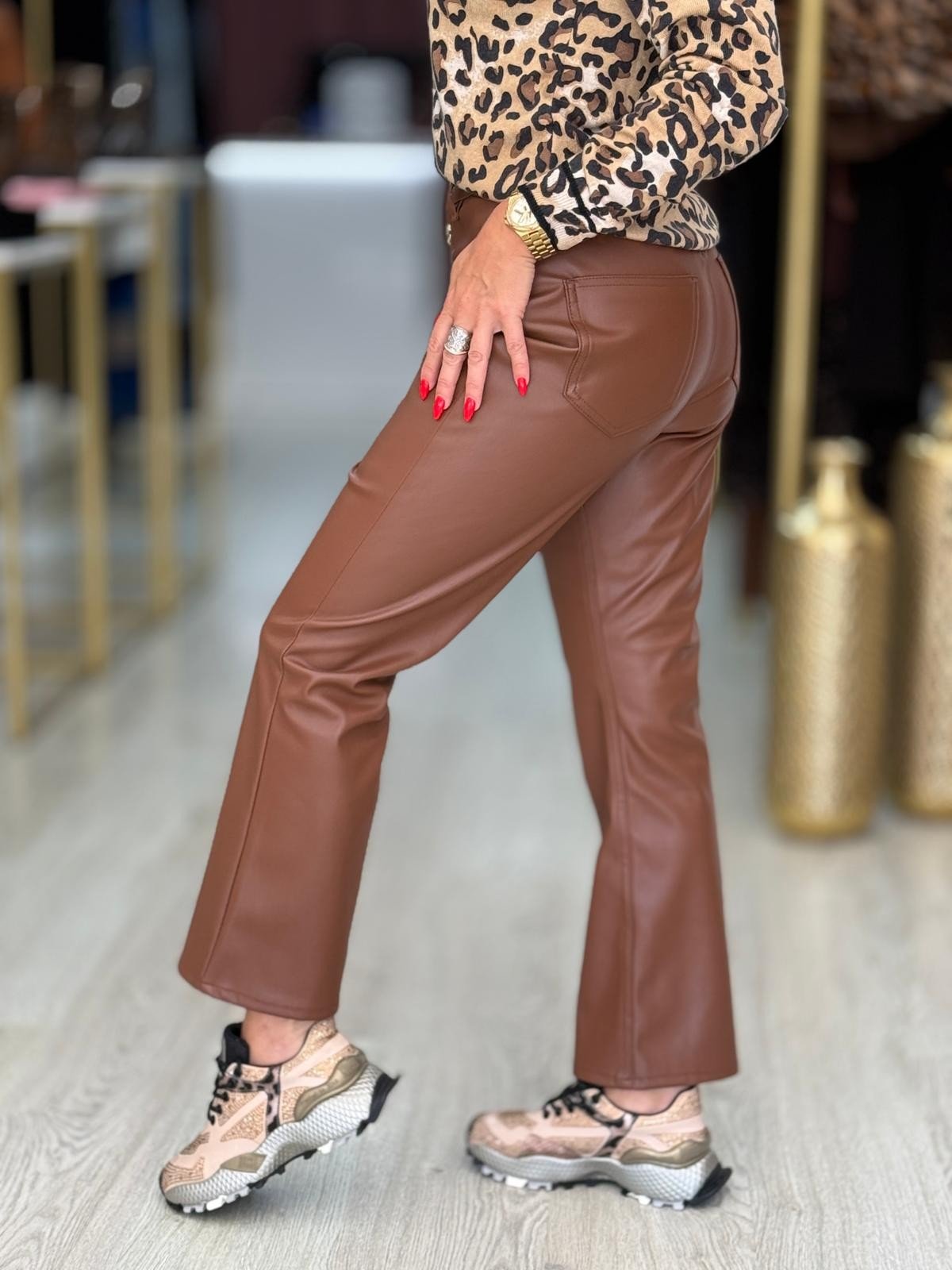 Calças em ecopele modelo cropped flare. Cintura subida com presilhas. Bolsos de chapa na frente e atrás. Fecha na frente com botões dourados.