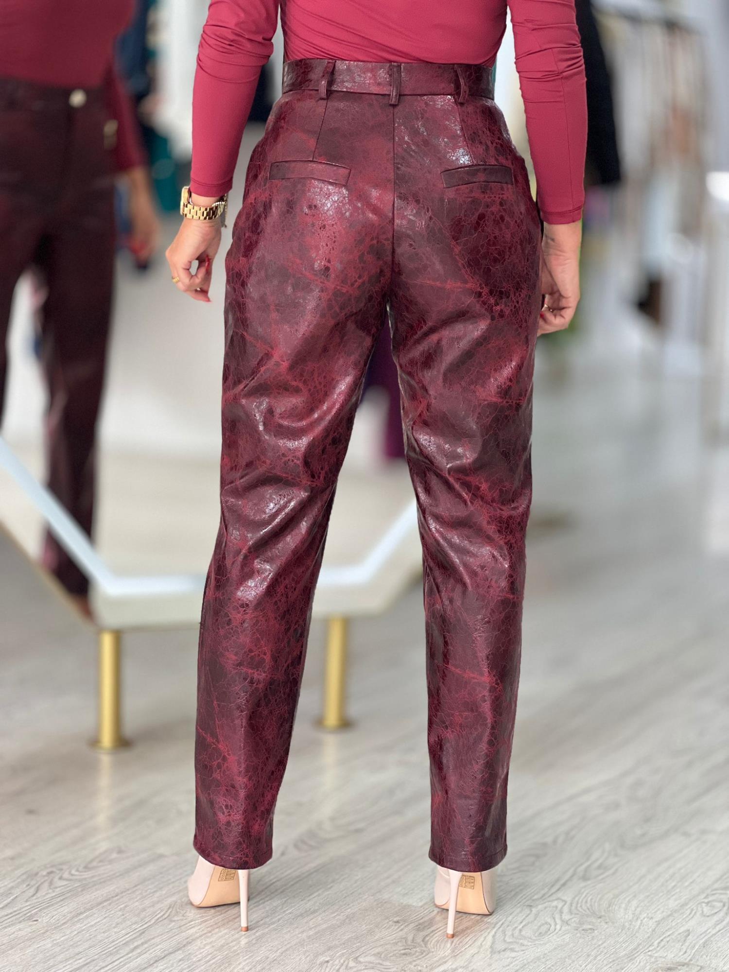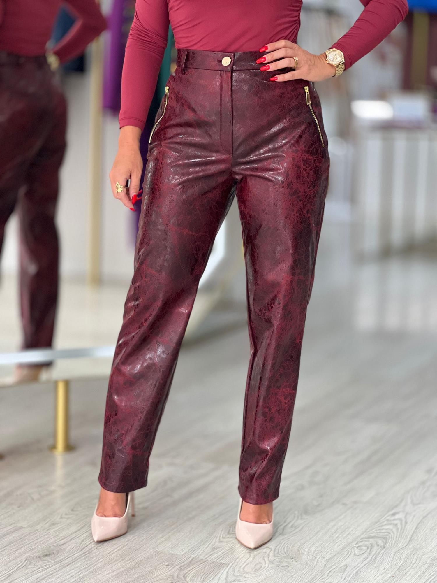 Calças efeito pele de cintura subida e presilhas. Bolsos frontais com fecho e falsos bolsos traseiros debruados. Fecho frontal com fecho de correr e botão.