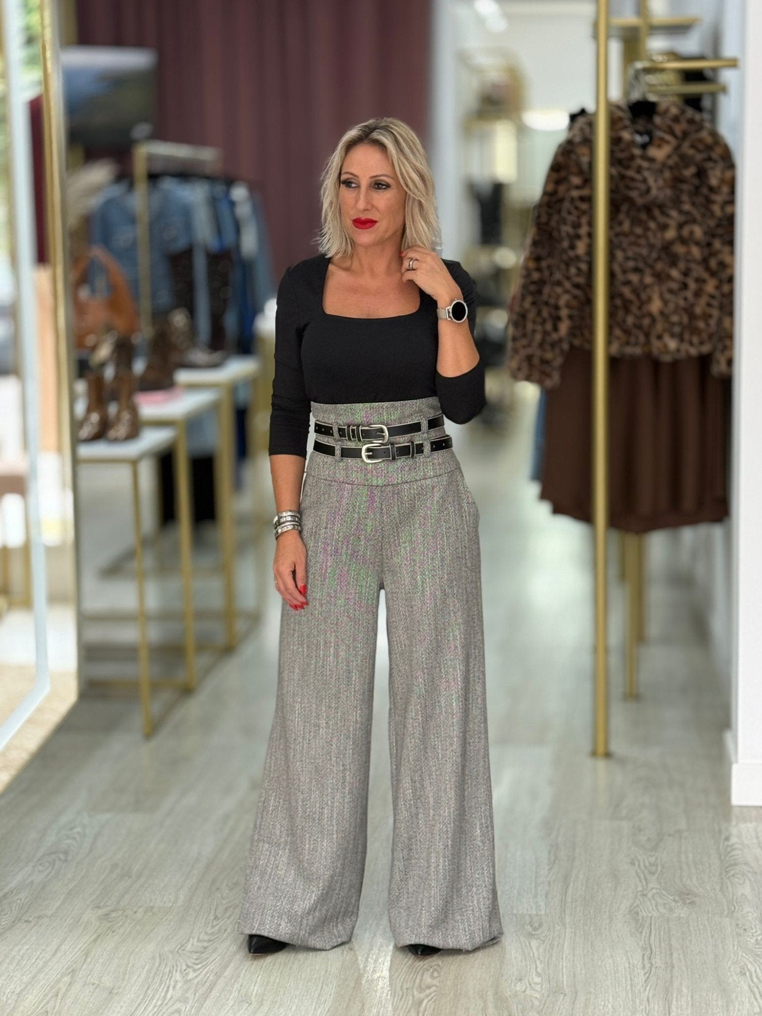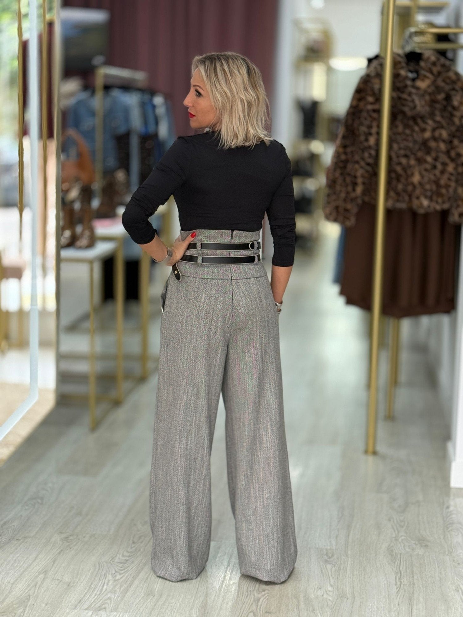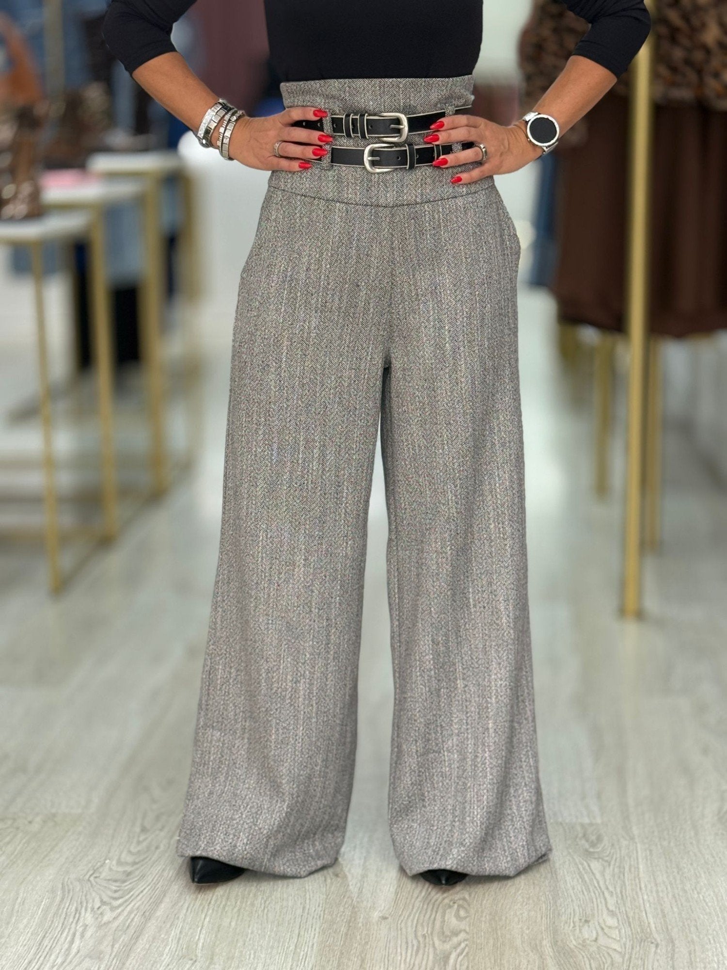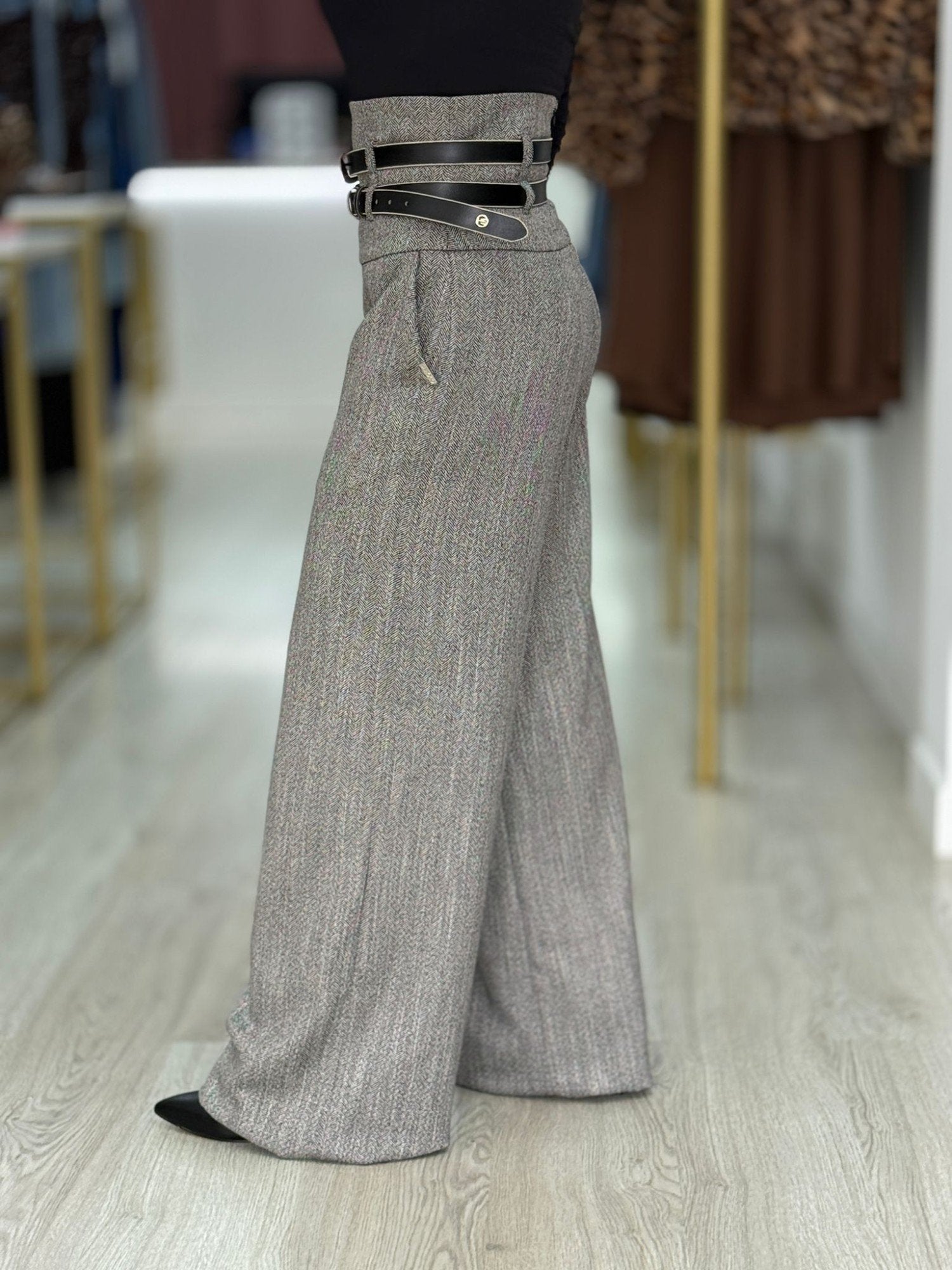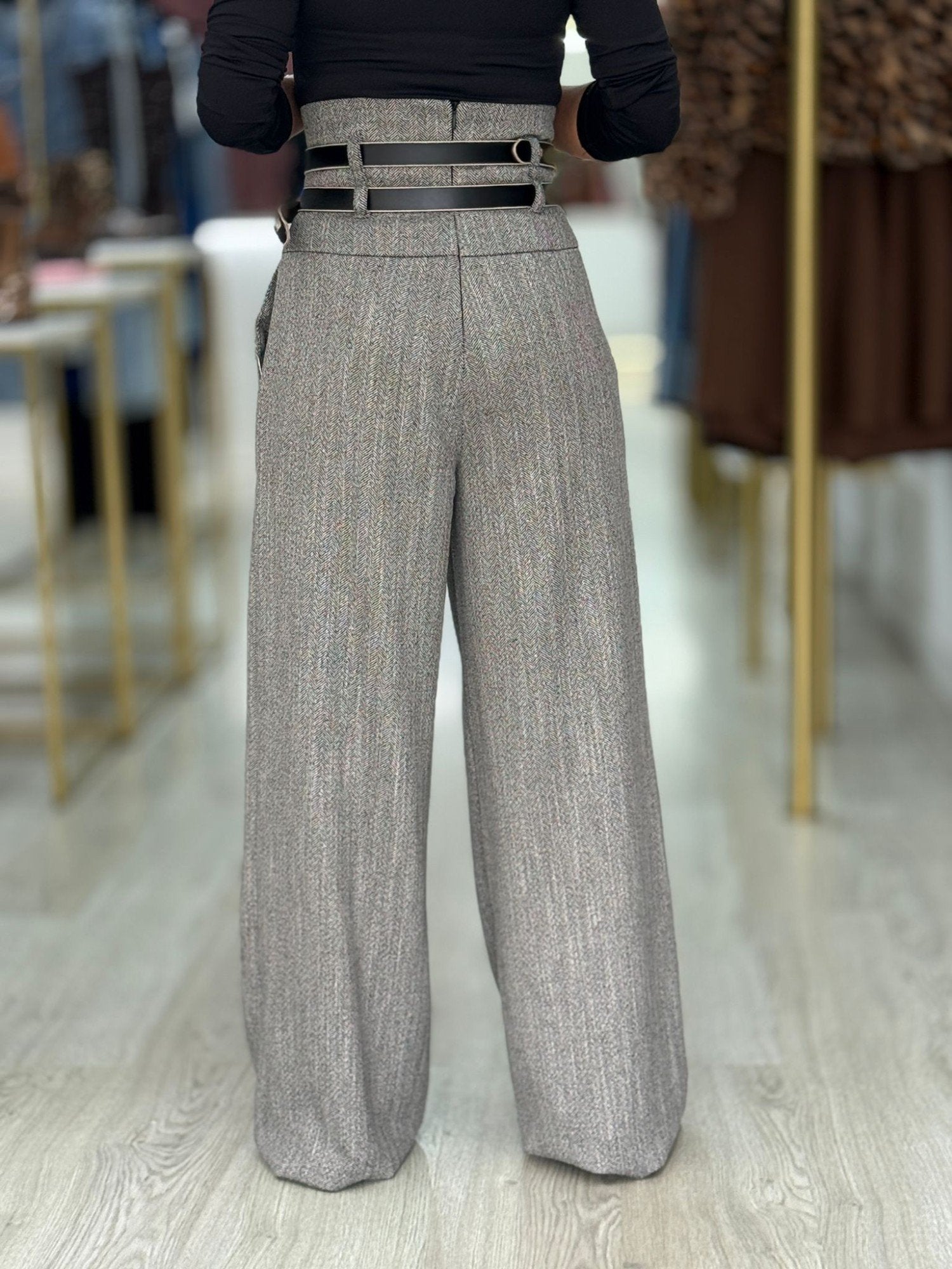 A elegância clássica ganha uma nova leitura. Estas calças reinterpretam o padrão espinha de peixe num corte de cintura subida e perna ampla, que alonga e estrutura a silhueta com naturalidade. Os cintos duplos em contraste marcam a cintura e introduzem um detalhe de força e modernidade, equilibrando o rigor da alfaiataria com um toque de atitude.