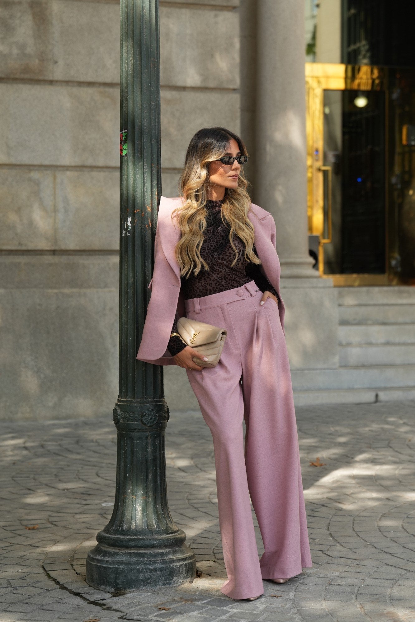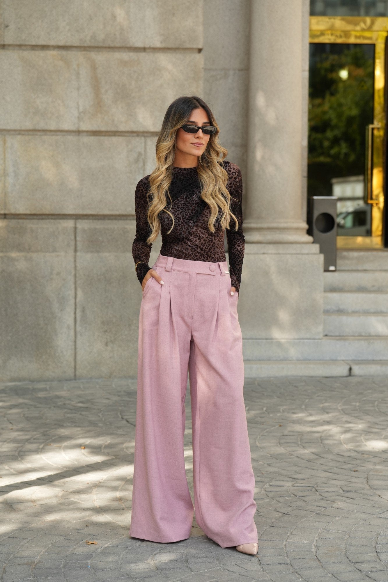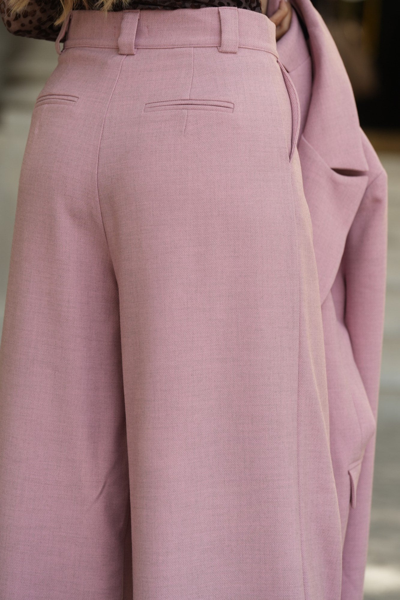 Calças de alfaiataria em tecido compacto e fluido. Cintura média com passantes, pregas frontais e botão forrado. Bolsos à frente e bolsos falsos com vivos atrás. A perna larga prolonga a linha visual, mantendo leveza no movimento.