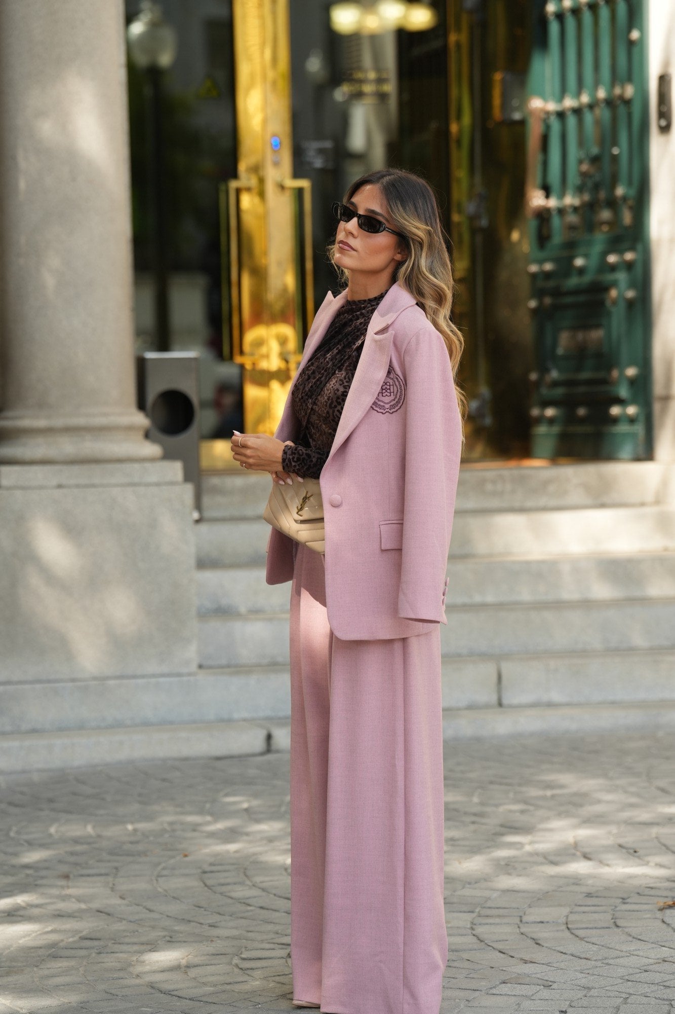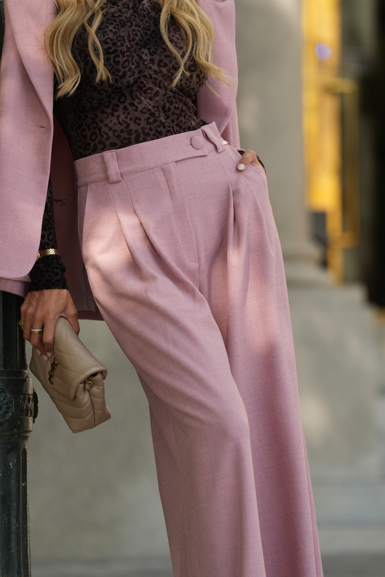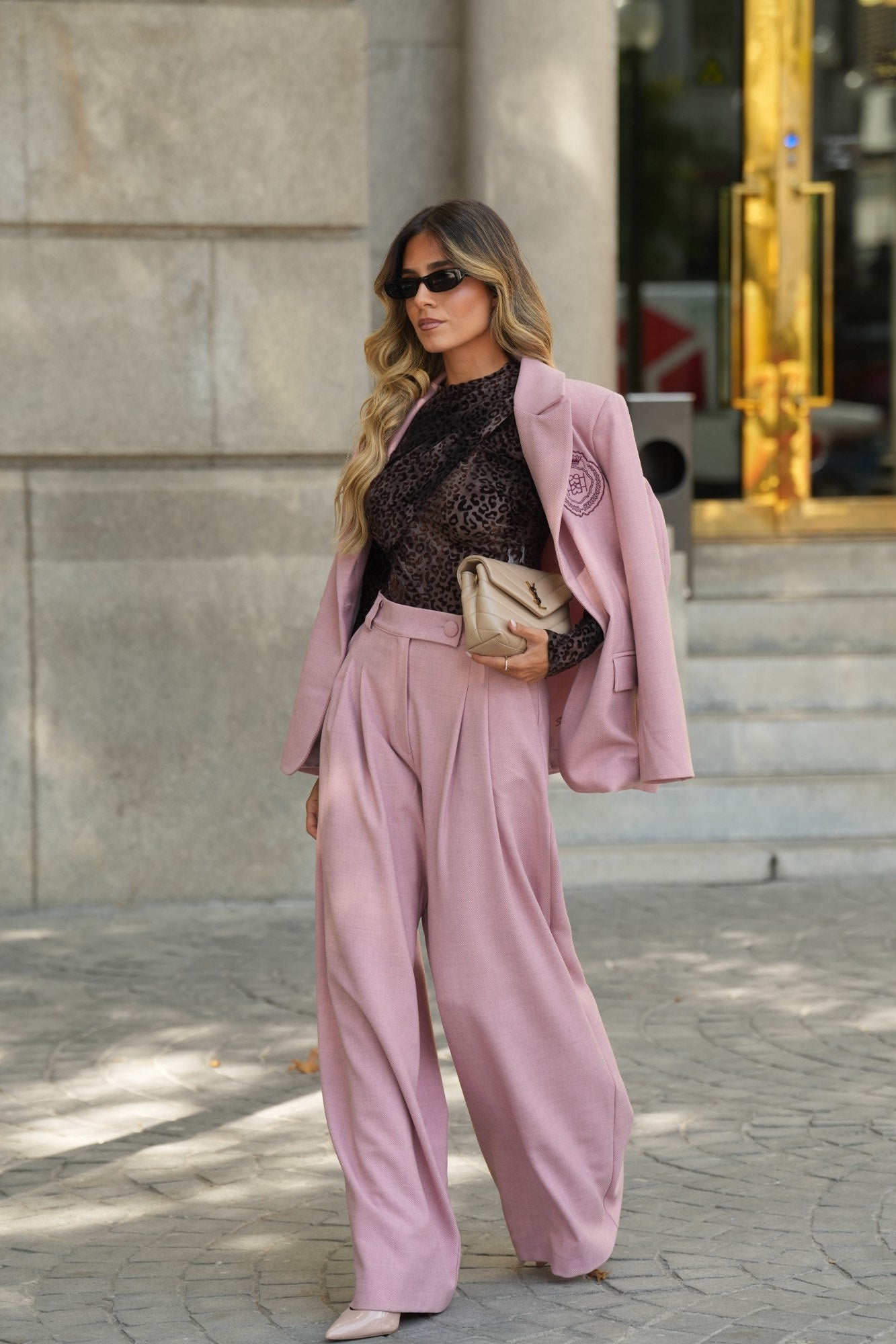 Calças de alfaiataria em tecido compacto e fluido. Cintura média com passantes, pregas frontais e botão forrado. Bolsos à frente e bolsos falsos com vivos atrás. A perna larga prolonga a linha visual, mantendo leveza no movimento.