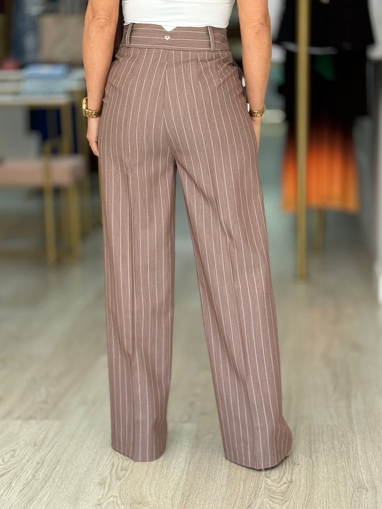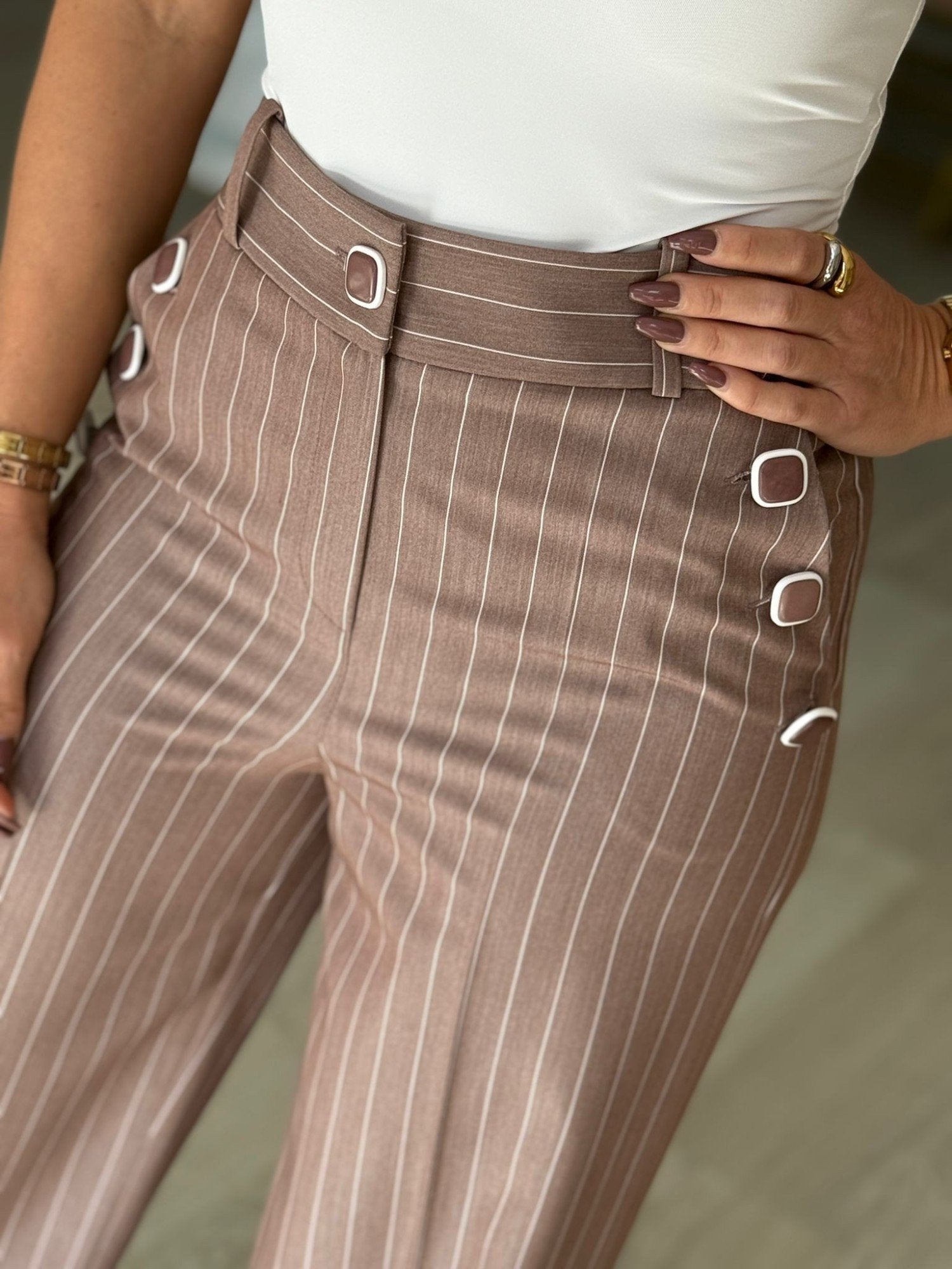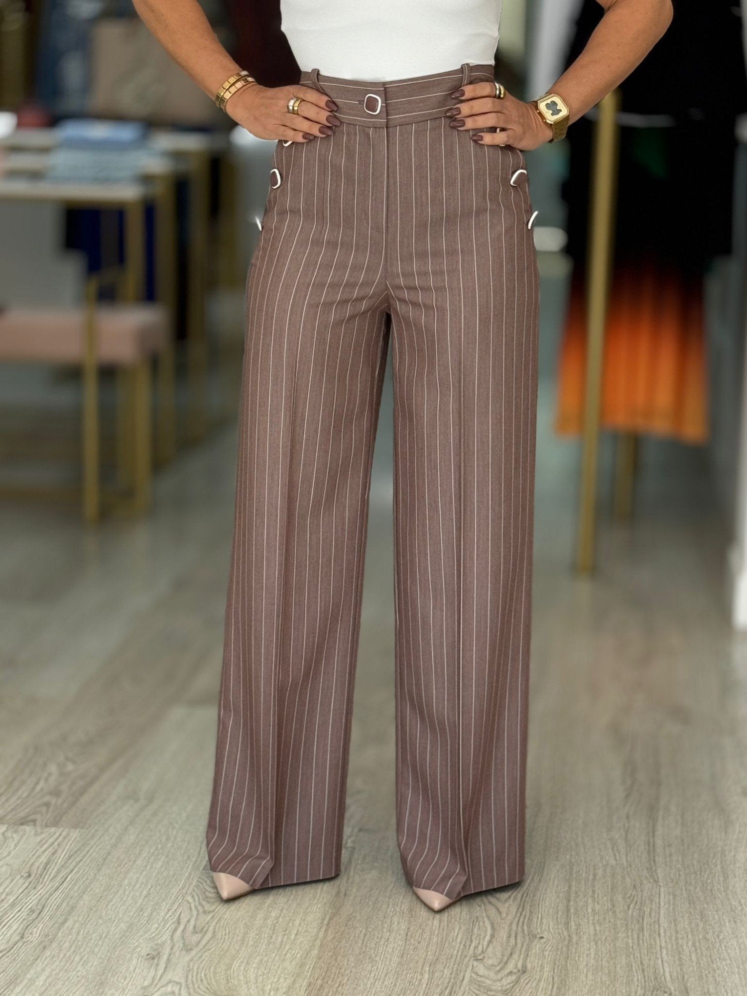 Calças de corte largo, estilo pantalona, que expressam uma elegância intemporal, pensadas para um visual sofisticado e equilibrado. Oferecem um toque confortável, excelente estrutura e ligeira elasticidade, assegurando um cair fluido e um ajuste cuidado que valoriza a silhueta. Em fundo castanho com risca branca, o padrão confere profundidade e sofisticação à peça, alongando visualmente a perna e evocando um registo clássico e elegante. O fecho frontal com botão e fecho de correr garante um ajuste seguro e discreto, enquanto os bolsos laterais são valorizados por três botões quadrados.