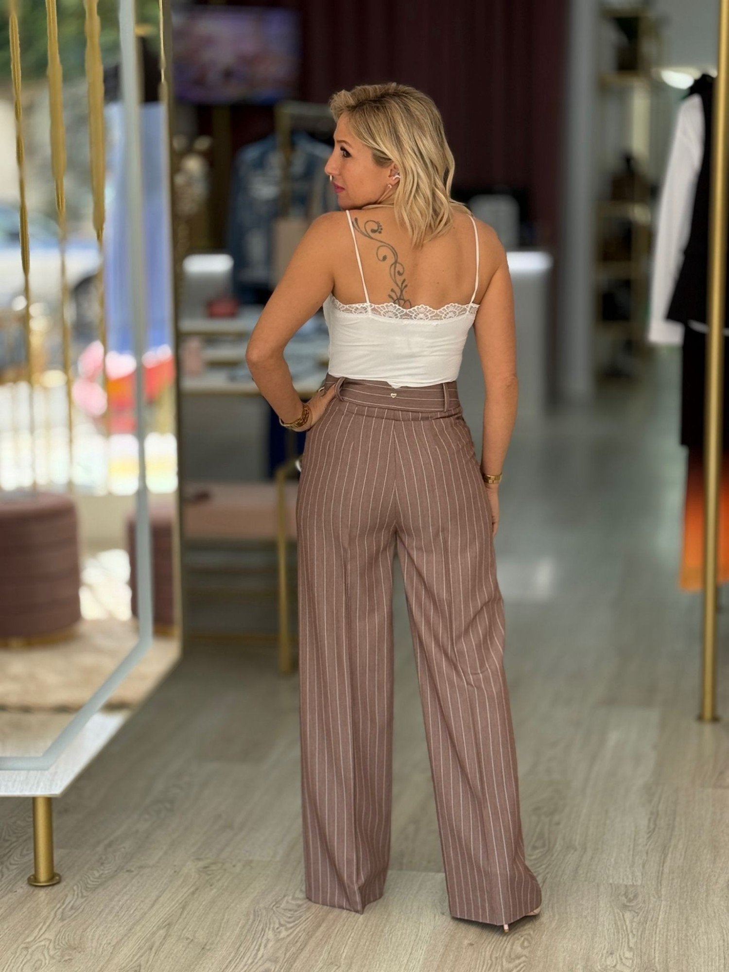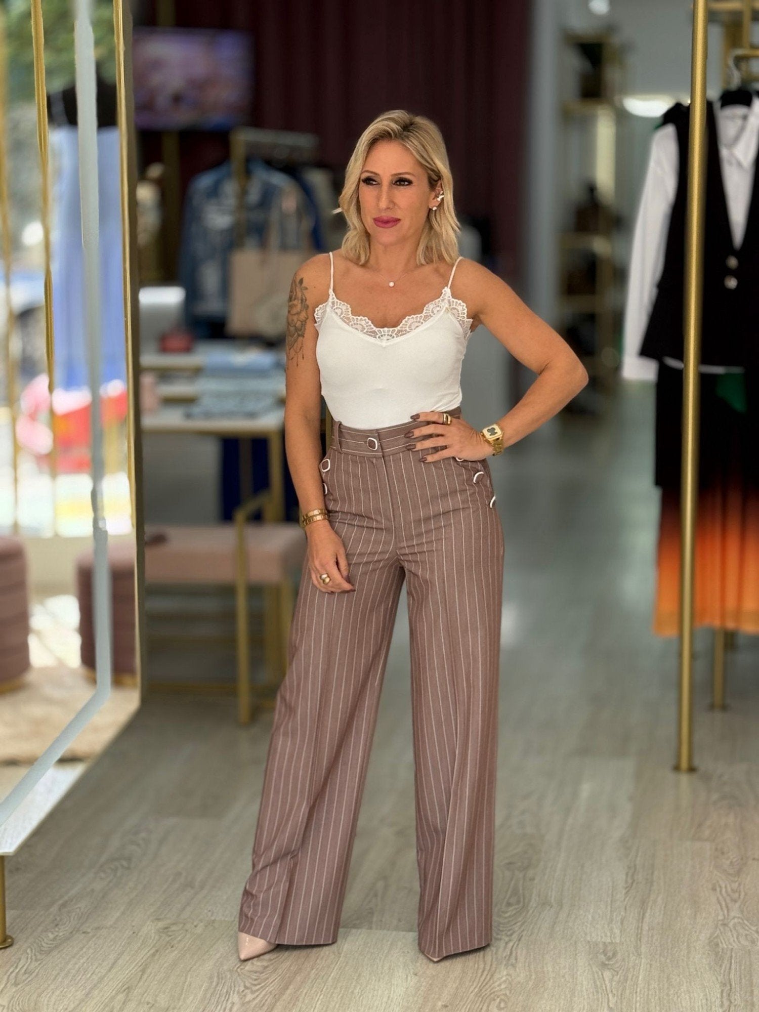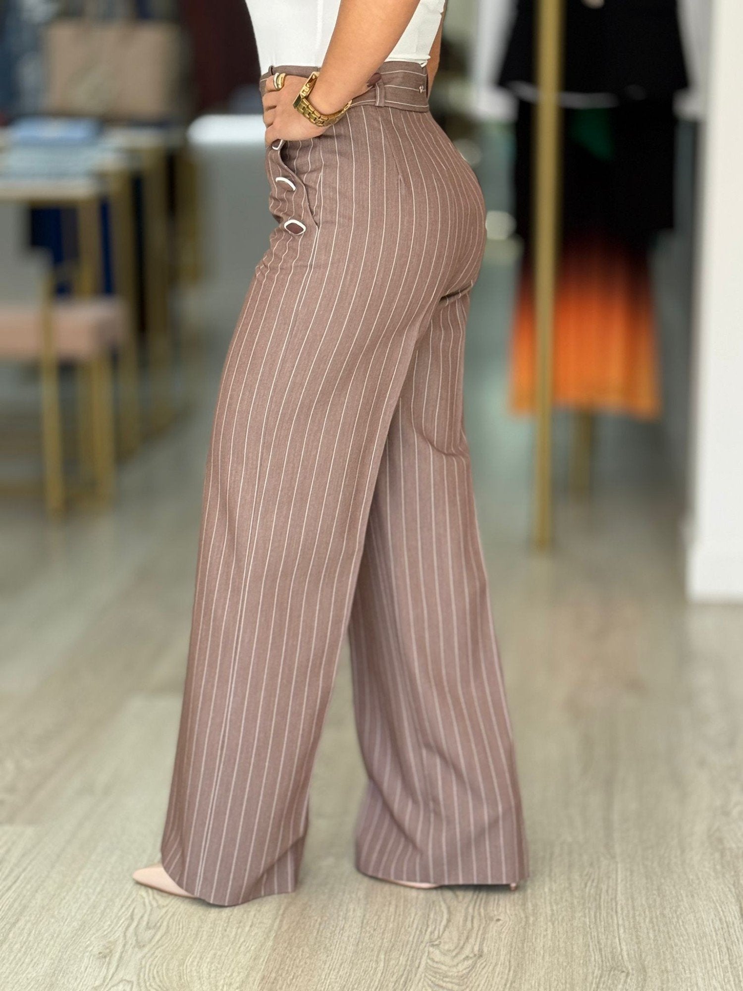 Calças de corte largo, estilo pantalona, que expressam uma elegância intemporal, pensadas para um visual sofisticado e equilibrado. Oferecem um toque confortável, excelente estrutura e ligeira elasticidade, assegurando um cair fluido e um ajuste cuidado que valoriza a silhueta. Em fundo castanho com risca branca, o padrão confere profundidade e sofisticação à peça, alongando visualmente a perna e evocando um registo clássico e elegante. O fecho frontal com botão e fecho de correr garante um ajuste seguro e discreto, enquanto os bolsos laterais são valorizados por três botões quadrados.