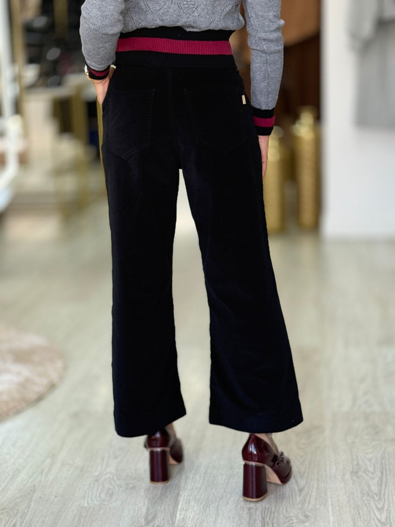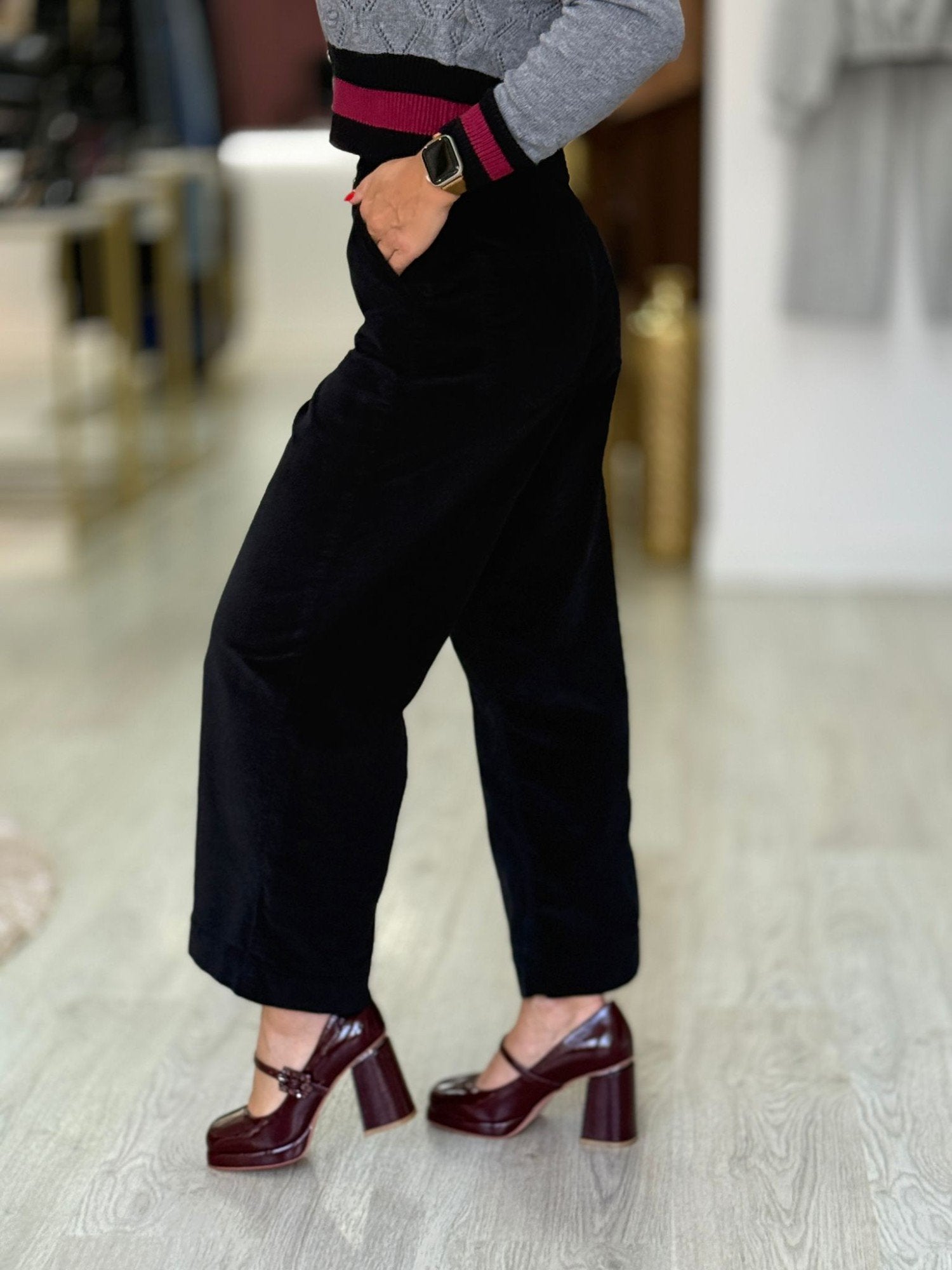 Calças de veludo, modelo wide leg cropped. Cintura subida. Bolsos laterais e dois de chapa atrás. Fecha na frente com botão dourado e fecho de correr oculto pelo tecido.