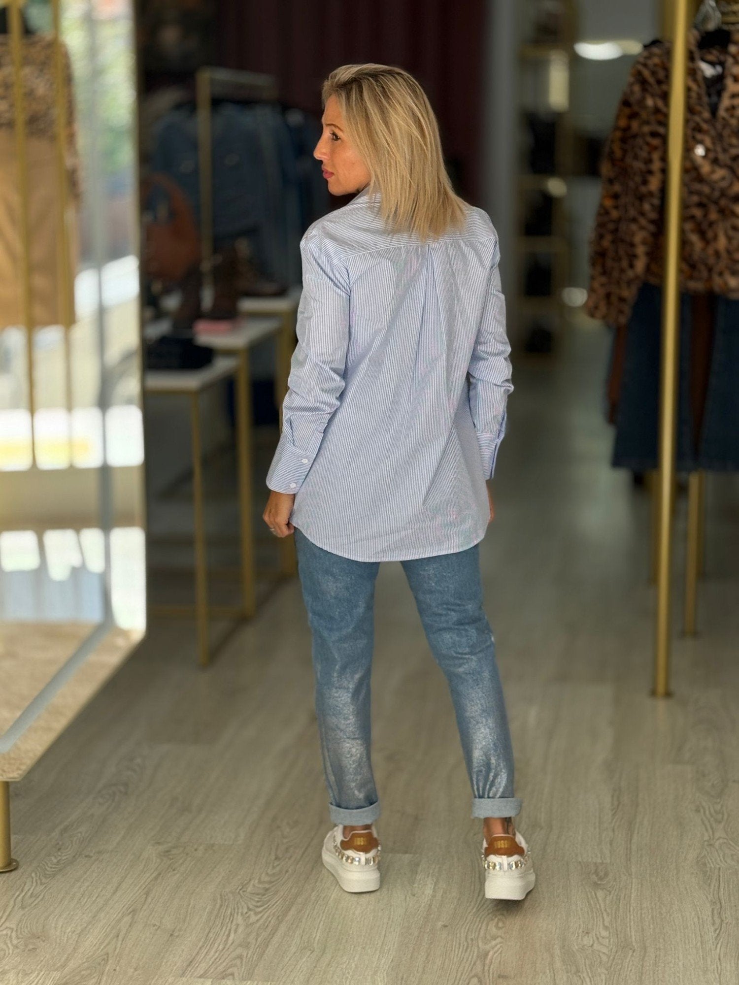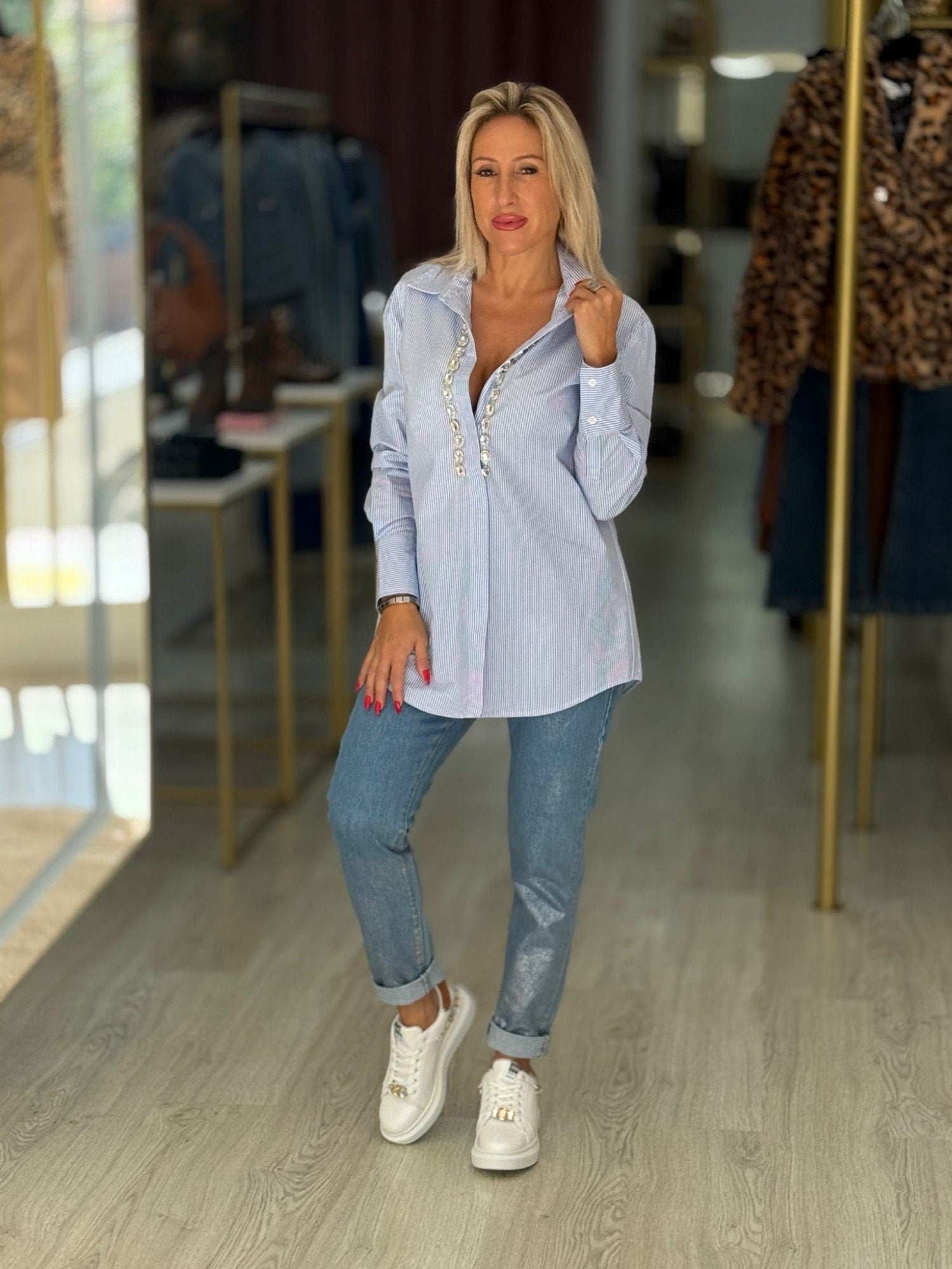 Camisa com colarinho, com pedraria no centro. Modelo oversize. Mangas compridas com punho. Fecha na frente com botões ocultos pelo tecido.