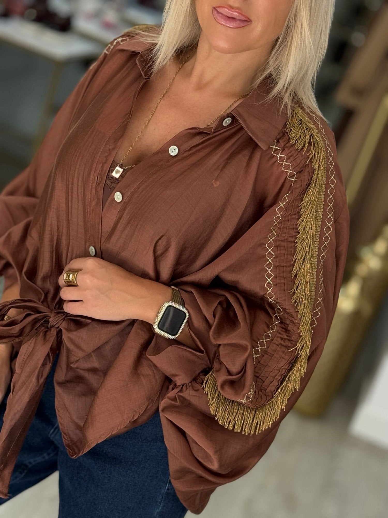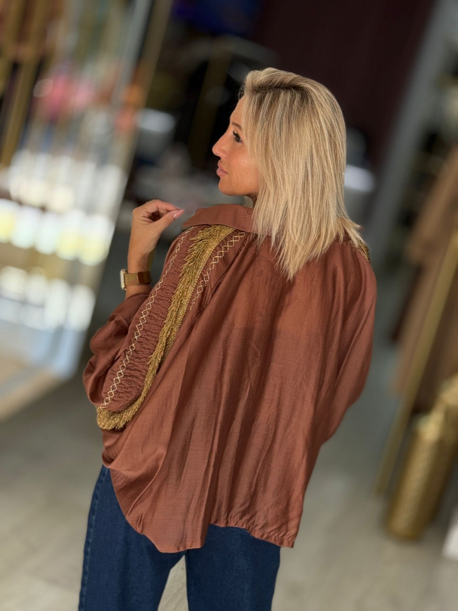 Camiseiro capa (sem costuras) de modelo bem oversize. Aplicação de fita com franjas ao longo da manga e laço na terminação na parte da frente.