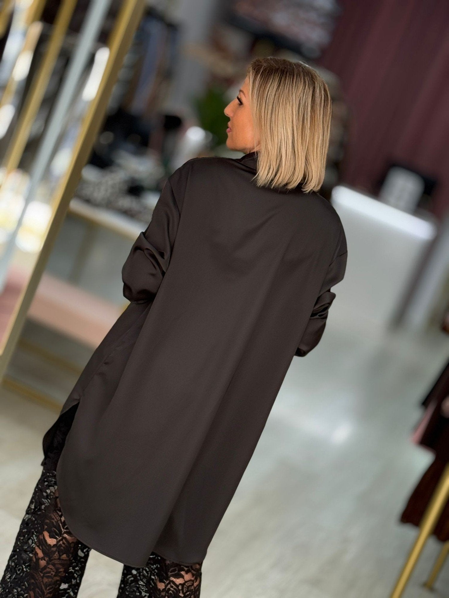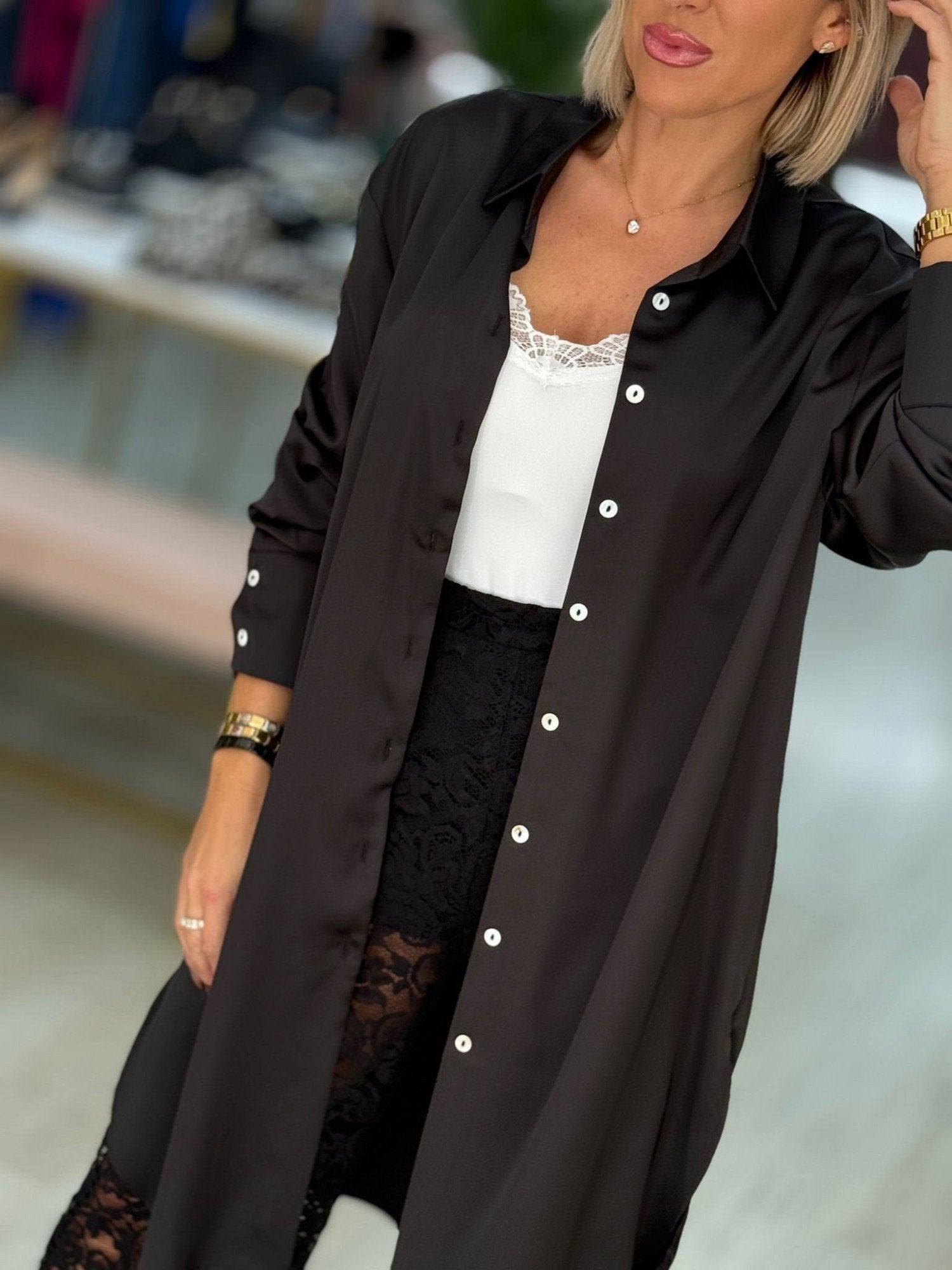Camiseiro comprido em tecido acetinado com colarinho. Fecha na frente com botões.